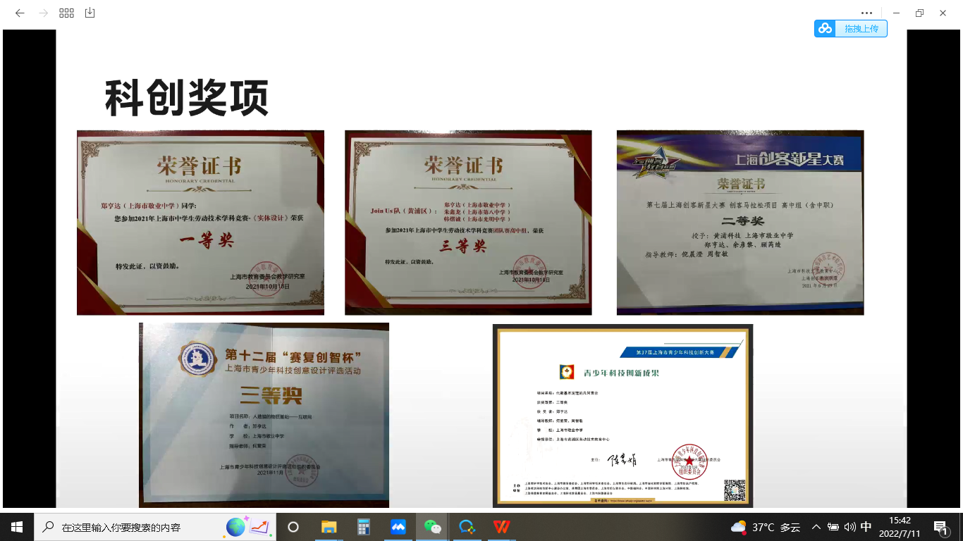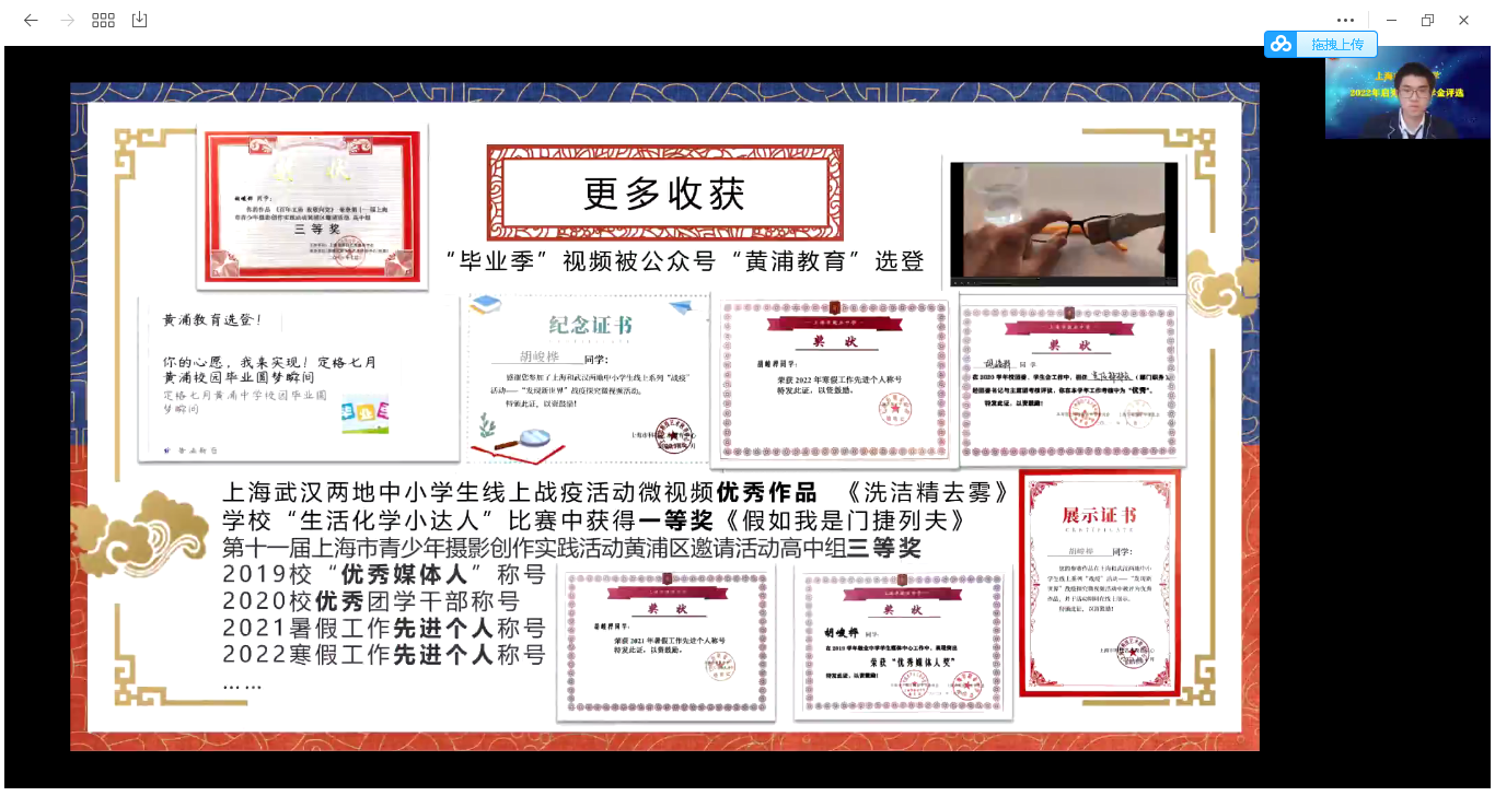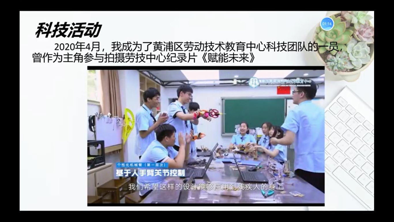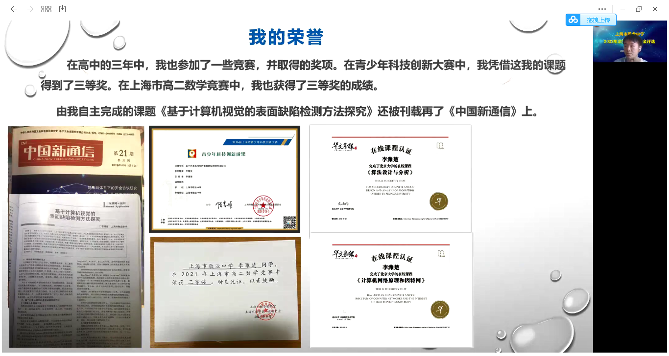 来自高二,高三的同学们更是通过自己夯实的基础,持续的努力,展现了个人在追求更好的自己路途中的卓越不凡。由于面试而未到场的高三(5)班的曹晓未学长通过疫情网课自学ti;因同样缘故未到场的还有高三(2)班的陈家康学长,在2020年4月成为了黄浦区劳动技术中心科技团队的一员,并作为主角参与拍摄劳技中心的纪录片《赋能未来》。来自高三(6)班的李潍楚学长的实力着实令人倾佩,他在2021年上海高二数学竞赛中荣获三等奖的成绩,通过自学分别获得了《算法设计与分析》和《计算机网络原理和因特网》的北京大学在线课程的认证,他自主完成的课题《基于计算机视觉的表面缺陷检测方法研究》还被刊登在《中国新通信》上。