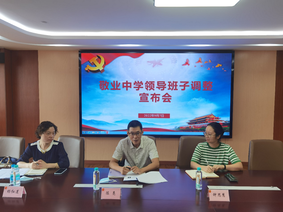 9月7日上午,敬业中学召开领导班子调整会议。区教育党工委陈亮书记、组织科杨红莲科长莅临会议,宣布钟思慧同志担任敬业中学副校长。会上,校党总支书记马伟、校长金怡代表学校欢迎钟思慧同志成为校务班子一员,希望钟校长的加入能够进一步助推学校立德树人工作的创新发展。钟校长也表示,尽管有压力,但一定会尽心尽责,不负上级领导和全校教职工的信任与重托,为敬业中学的高质量发展做出自己的贡献。