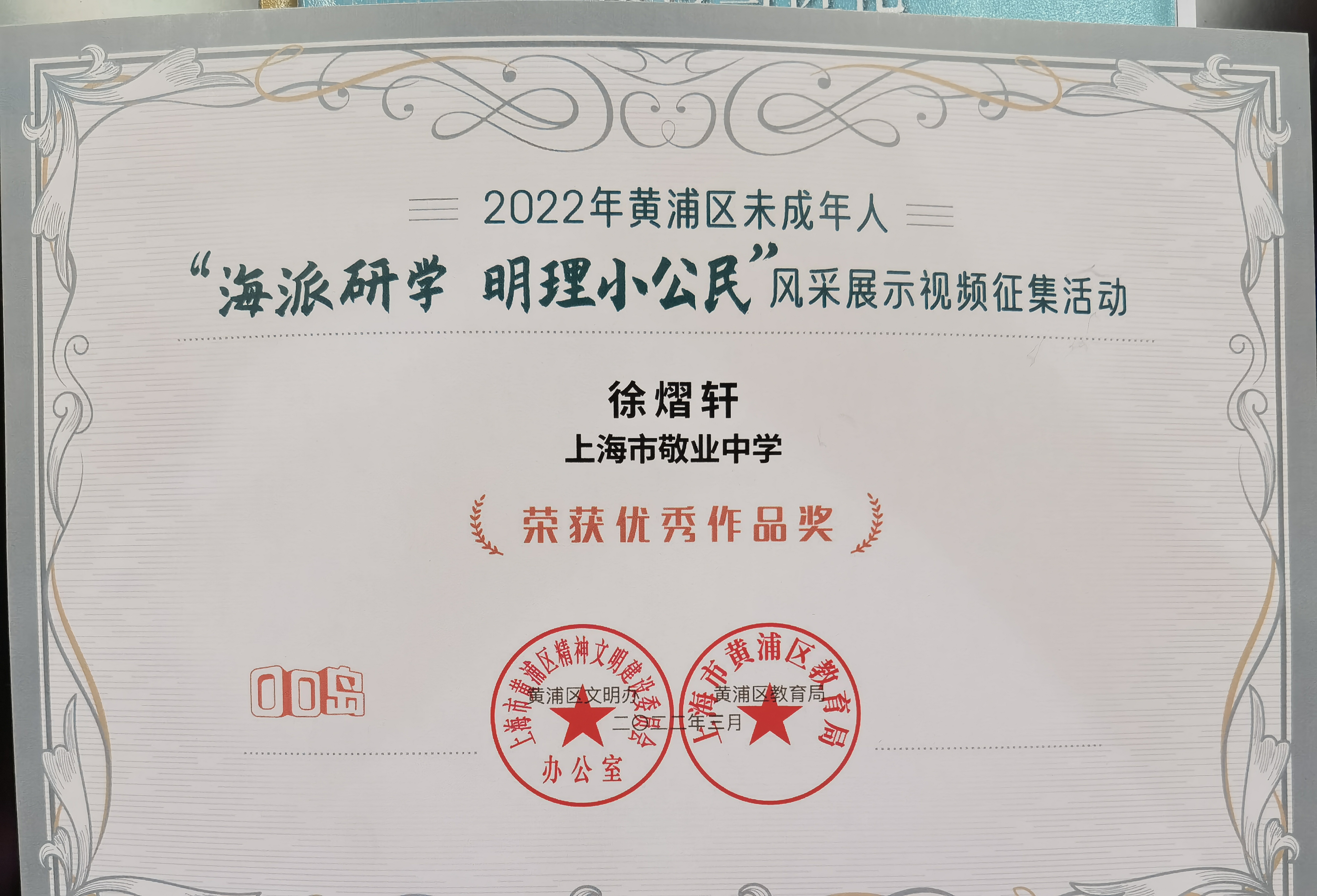 寒假期间,黄浦区多所机构共同开展了2022年寒假“海派研学 明理小公民”风采展示活动,以提升学生研学实践能力,培养学生表达自我的新方式。我校高二8班徐熠轩、高二7班文禧京两位同学参与,并荣获“优秀作品奖”。