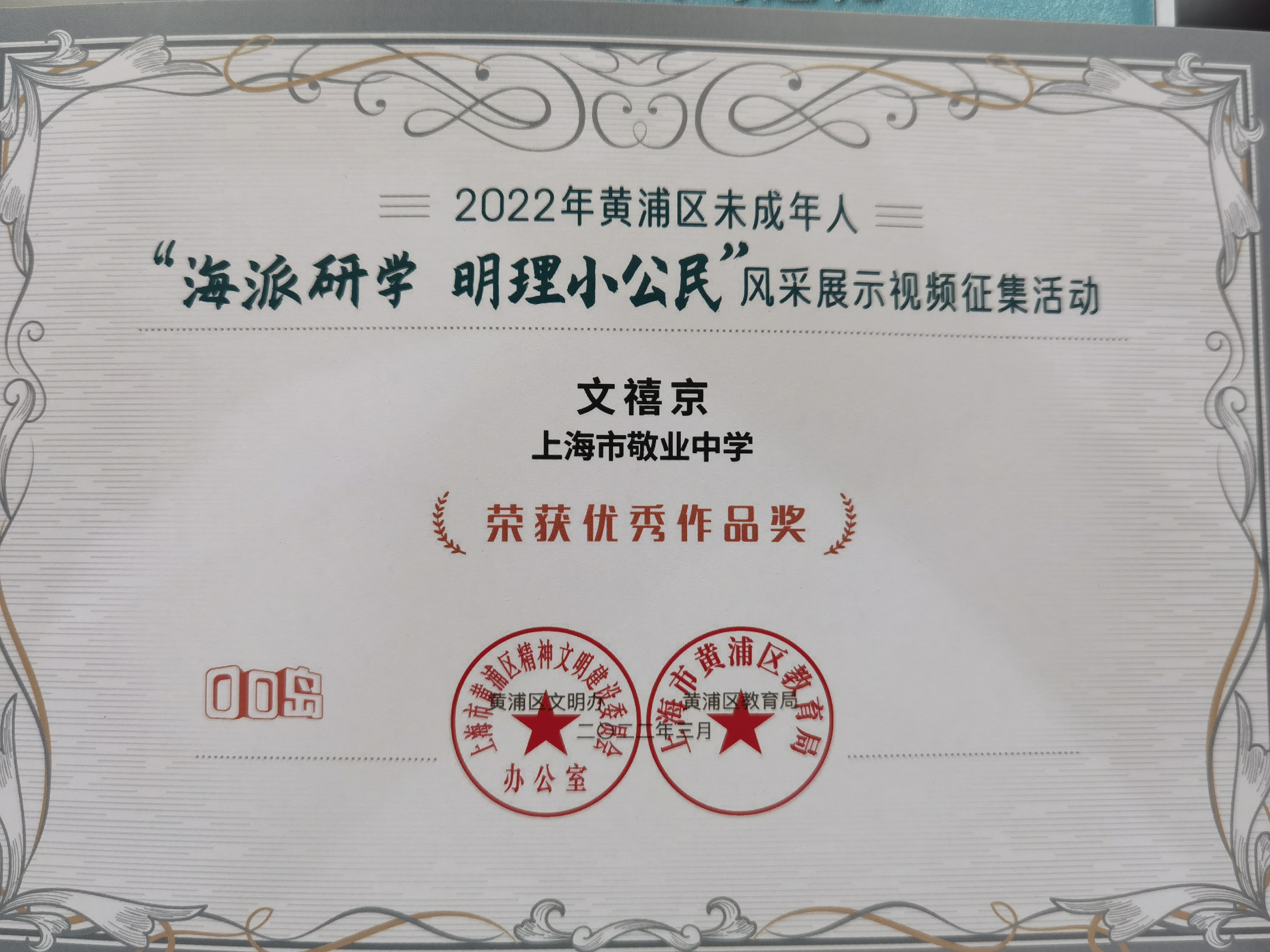 敬业学子获”海派研学,明理小公民”风采展示活动”优秀作品奖”
