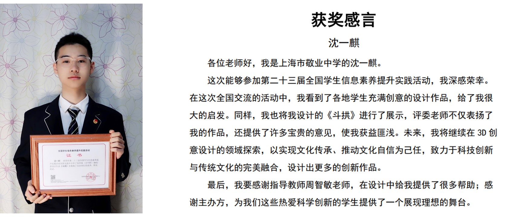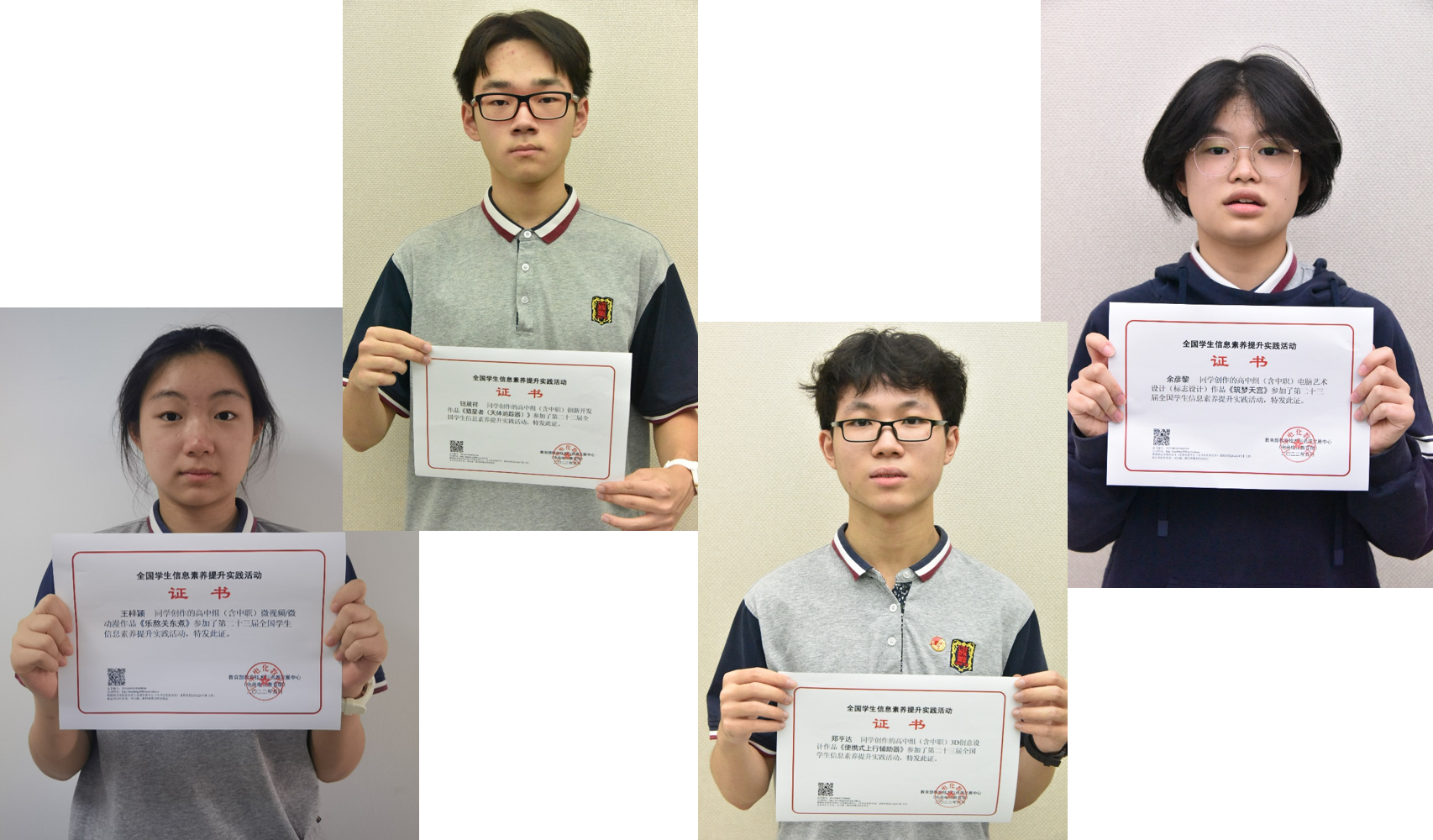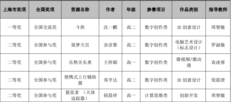 由教育部教育技术与资源发展中心(中央电化教育馆)主办的第二十三届全国学生信息素养提升实践活动(原全国中小学电脑制作活动)已圆满结束。活动坚持以“实践、探索、创新”为主题,以与时俱进的活动项目为核心,通过丰富多样的组织形式,坚持把立德树人和“五育”并举贯彻落实到活动内容中,引导师生充分利用信息技术,助力信息素养提升。经过层层选拔,全国各地共有3118件作品入围决赛。最终,我校有5名学子获得各项全国奖项,其中一位同学获得全国交流奖及上海市一等奖,4位同学获得全国参与奖及上海市二等奖。具体如下: