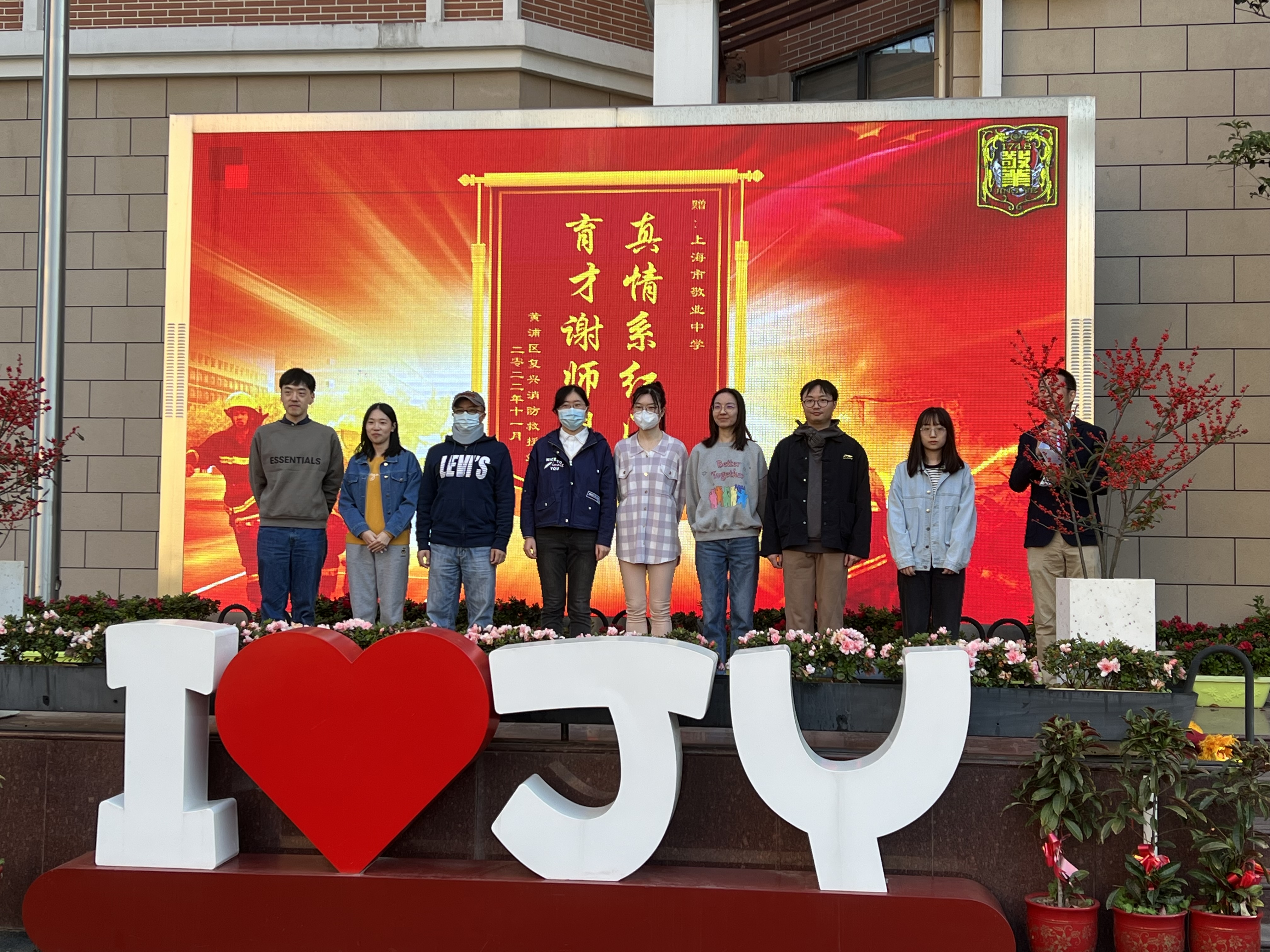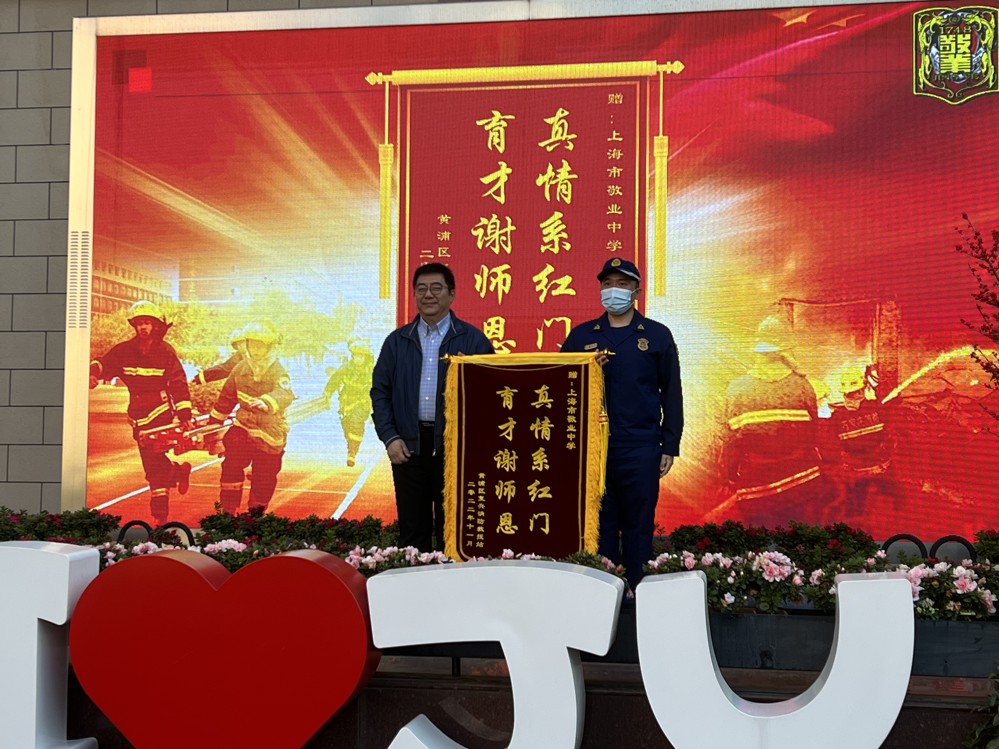 演习的最后,王骁尧老师作为青年党员志愿者教师代表主持了消防救援站赠送锦旗仪式。站里有若干队员准备要参加国家消防救援学院的招生考试,但队员们平时训练任务重,随时要出警,能够用于复习的时间有限,我们的青年党员教师志愿指导队员们复习。第一时间积极响应,在几分钟内就成立了一支包含语文、数学、英语、物理、化学、政治学科的7人教师队伍。从一月下旬至四月底,7位教师每周抽出3个半天到消防站授课,期间他们克服了时间短、内容多、考试要求与平时教学差异大等一系列困难,为战士们制订了系统的、完整的复习计划,开展了具有针对性的高效辅导。哪怕在3月疫情来袭,上海开始封控之际,通过线上授课的形式坚持为消防战士们辅导,也不曾停止。消防战士们也将自己宝贵的休息时间全部放在了学习上,令我们十分感动,最终,在师生共同的努力下,消防战士们也如愿通过了国家消防救援学院的测试,取得了理想的结果。这7位老师,有班主任,有高三班主任,有备课组长,有高三备课组长……他们都肩负着多样的教学教育工作,在平时已十分忙碌,但他们仍然毫不犹豫地、主动地承接了这次的任务。
