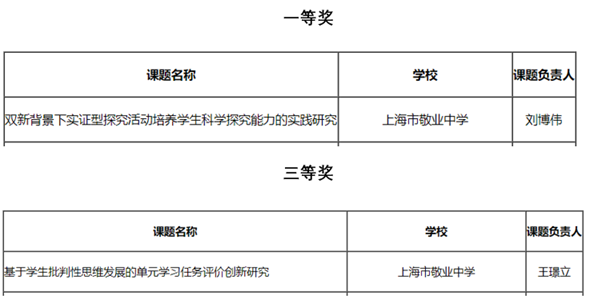 2021年度我校共有2项青年教师课题获批立项,经黄浦区教育学院科研室组织专家评审我校共2项课题获奖,其中刘博伟老师的研究课题《双新背景下实证型探究活动培养学生科学探究能力的实践研究》获一等奖、王璟立老师的研究课题《基于学生批判性思维发展的单元学习任务评价创新研究》获三等奖,在此向获奖教师表示祝贺!