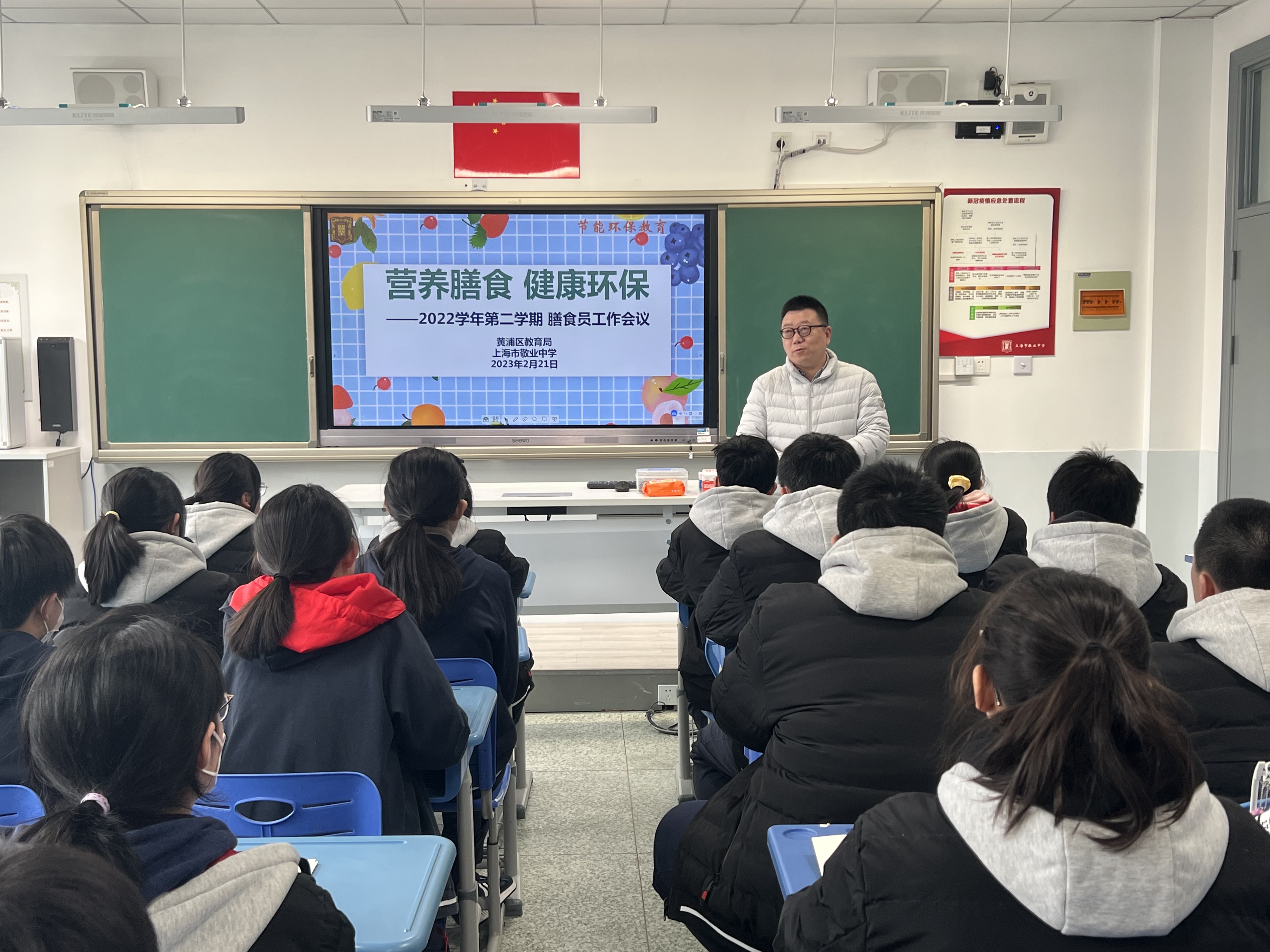 为了进一步提高学校食堂膳食水平,保障学生饮食健康,构建健康环保的绿色校园,我校于2月21日召开“营养膳食 健康环保”2022学年第二学期膳食员工作会议,本次会议由董颖老师主持,德育处副主任崔嵘老师指导,24个班级膳食员共同参会。