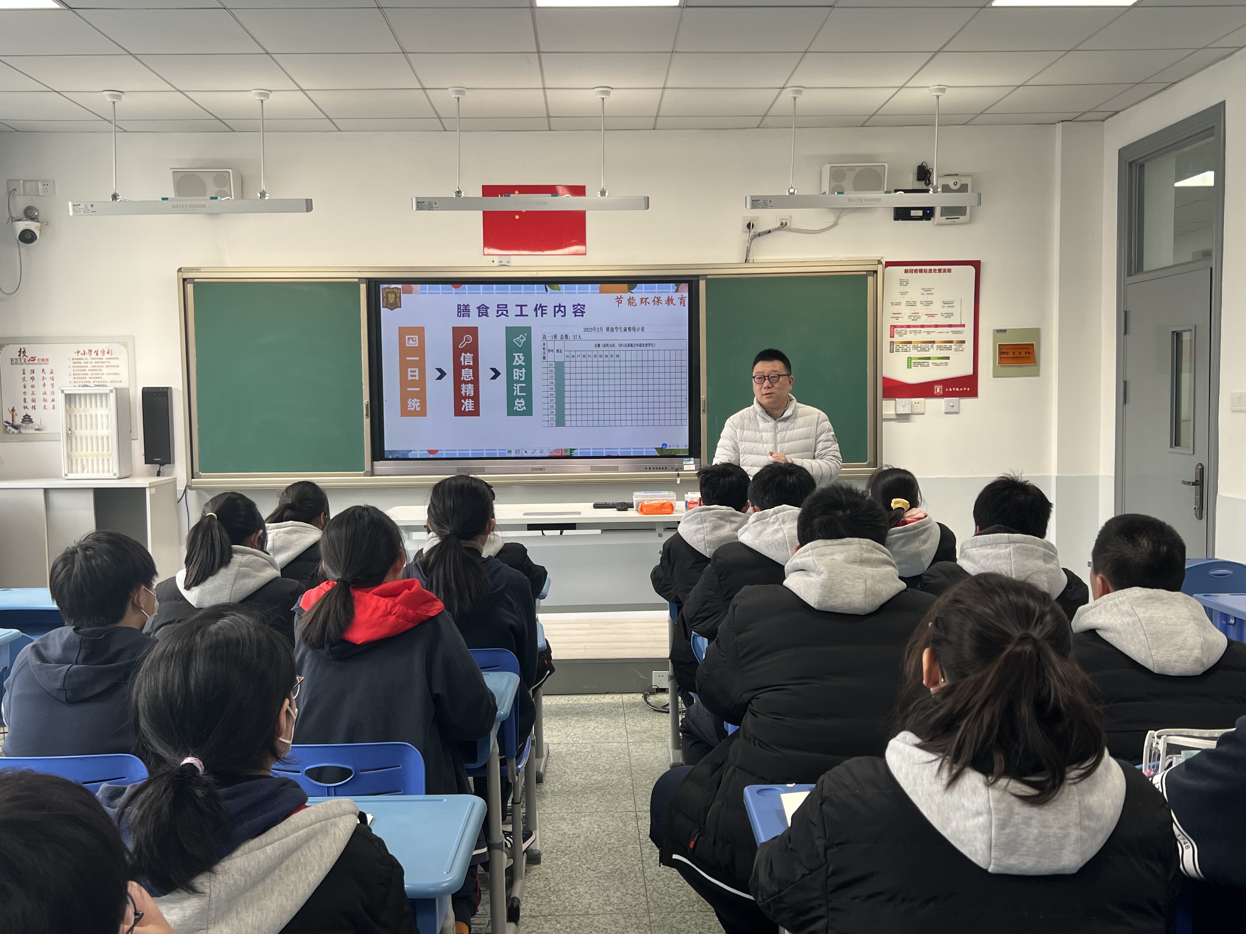 会议上,董老师首先明确了本学期膳食员工作内容,要求膳食员做好每日统计工作。此外,新学期的统计表在旧版基础上做了优化,更便于各班膳食员完成日常统计,提高工作效率。同时,就“光盘行动”与“垃圾分类”做了进一步宣传教育,希望各班膳食员可以动员班级同学节约粮食,共创良好的校园环境。