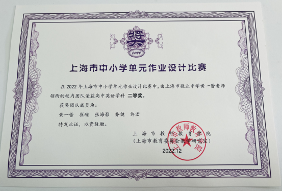 在2022年上海市中小学单元作业设计比赛中黄一蕾、崔嵘、张海影、乔健和许宏老师组成的外语组团队获得了二等奖的佳绩。该赛事旨在通过单元内部新授课与复习课的作业设计,凸显素养导向下的单元整体设计理念。团队成员们基于单元教学目标,兼顾个体差异,形成了对于课时作业与单元作业整体设计的感性体验与理性认知,借助复习巩固类、拓展延伸类和综合实践类等作业类型的设计,使学生形成积极的情感体验、提升语言和思维能力。同时,这也令团队成员们深思在发挥学生学习潜能和促进自主学习的路上,诸多探索,等候开启。