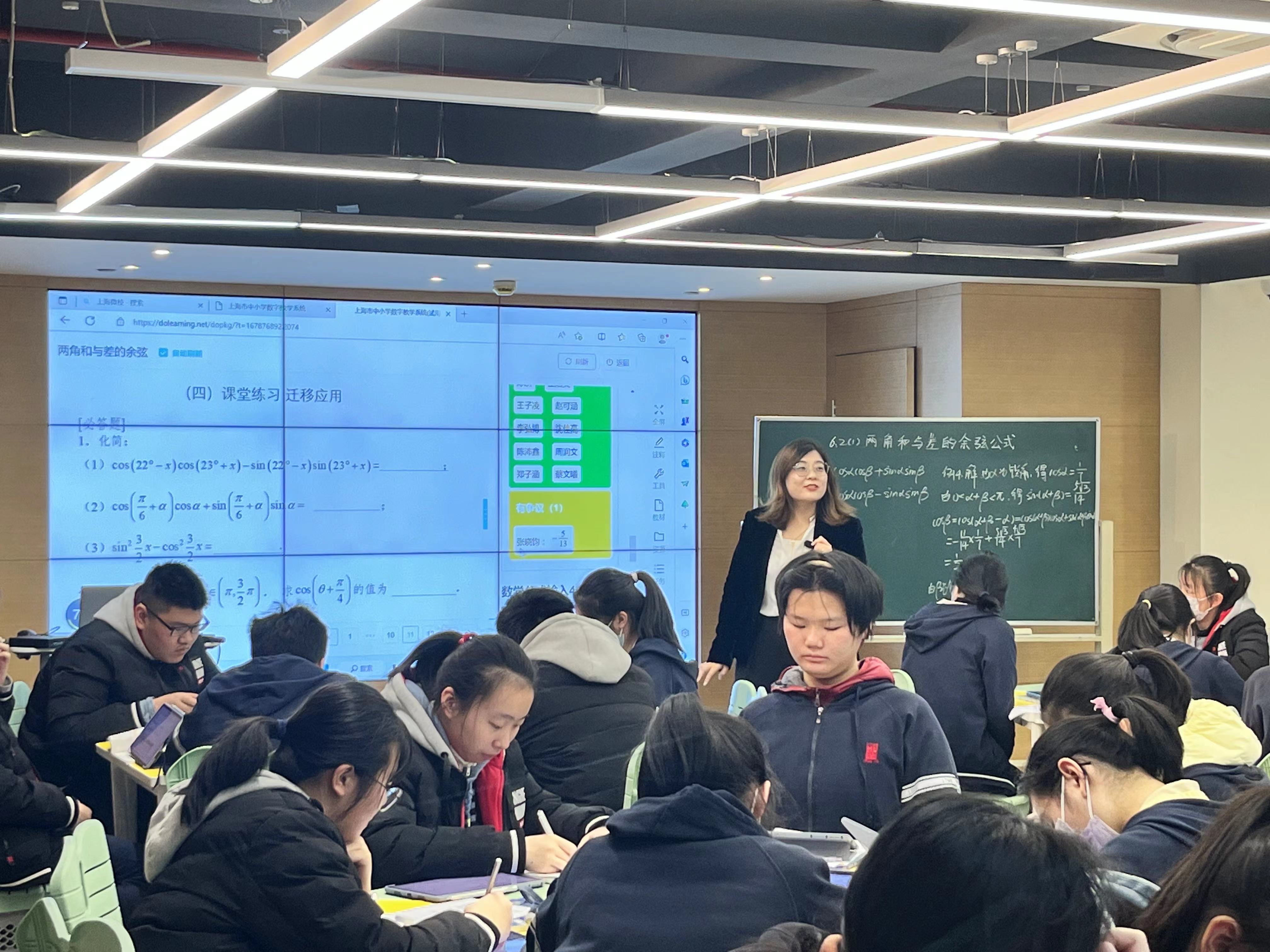 首先,观摩敬业中学牛婷婷老师的数字化转型课堂实践公开课《常见三角公式——两角和与差的余弦公式》。课堂上牛老师运用上海市中小学数字教学数字化平台,与敬业中学博雅班学生一起为大家展示了一堂集信息化、数字化为一体的数学概念探究课。