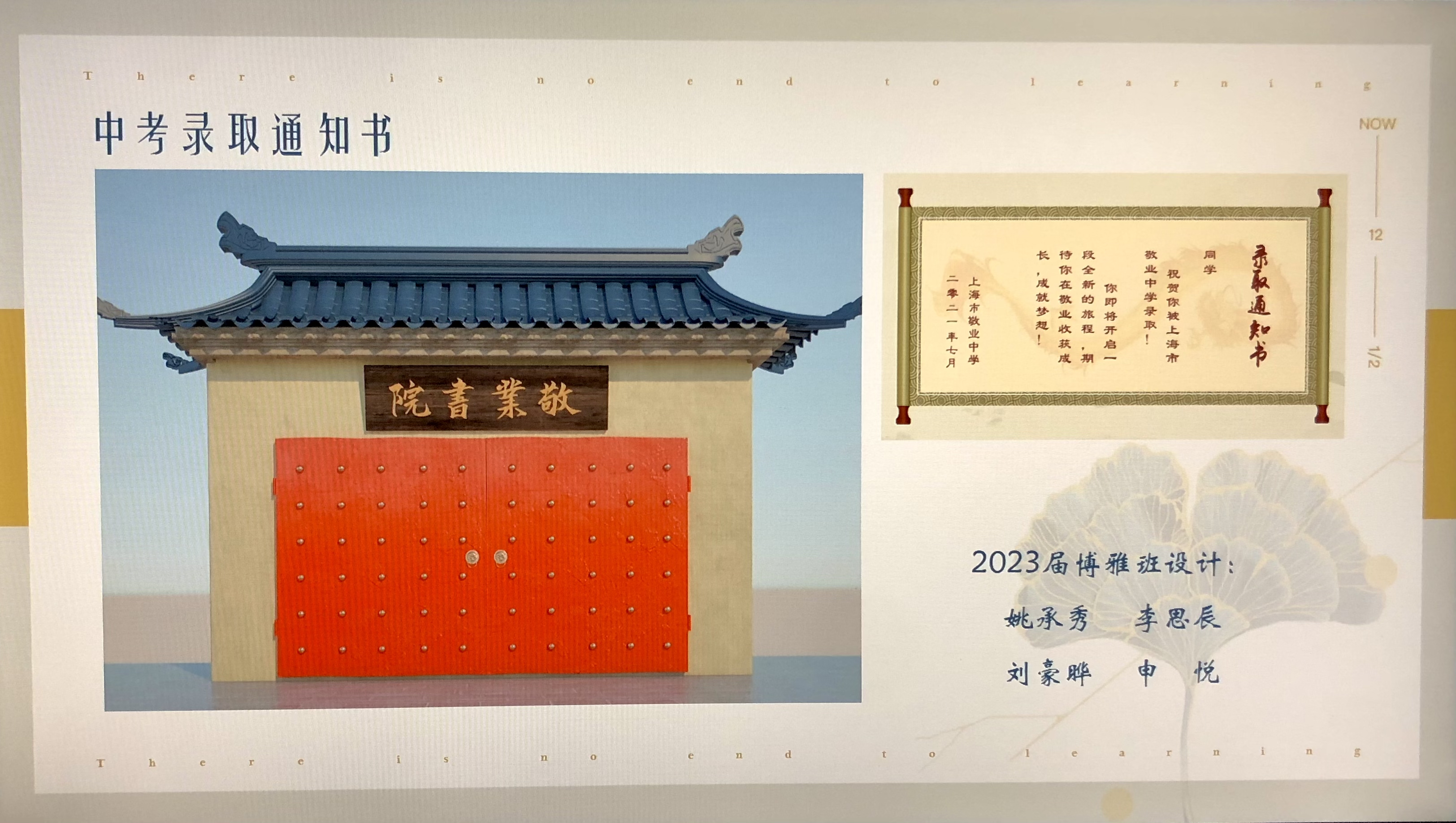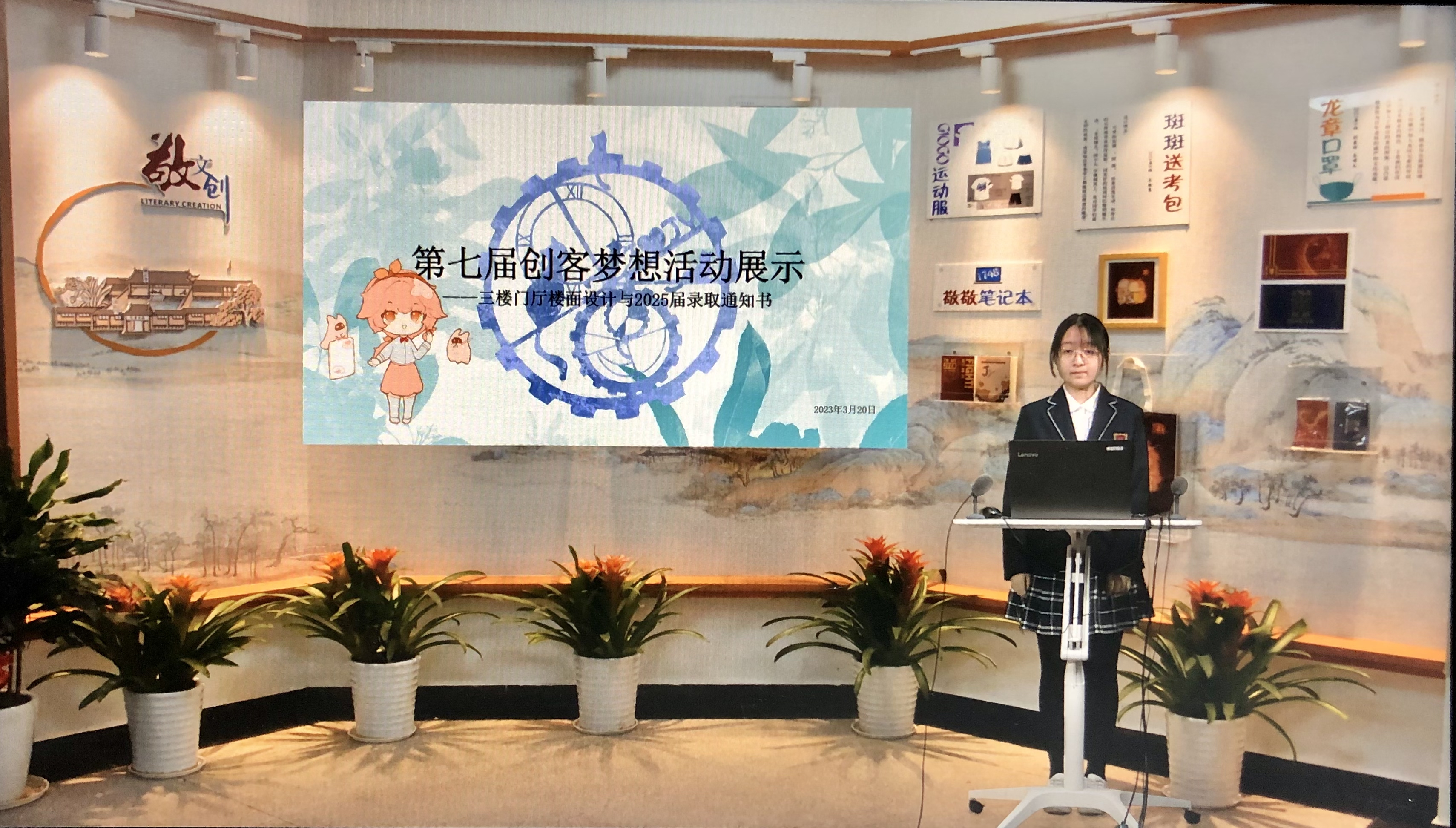 接下来,2024届科创班的朱敏慧同学在发言中介绍了她所参与的创客项目和参与经历,包括三楼门厅和中考录取通知书的设计,由此,我们看到的不仅仅是创客的梦想,更是对于敬业校园满满的期待与热爱。