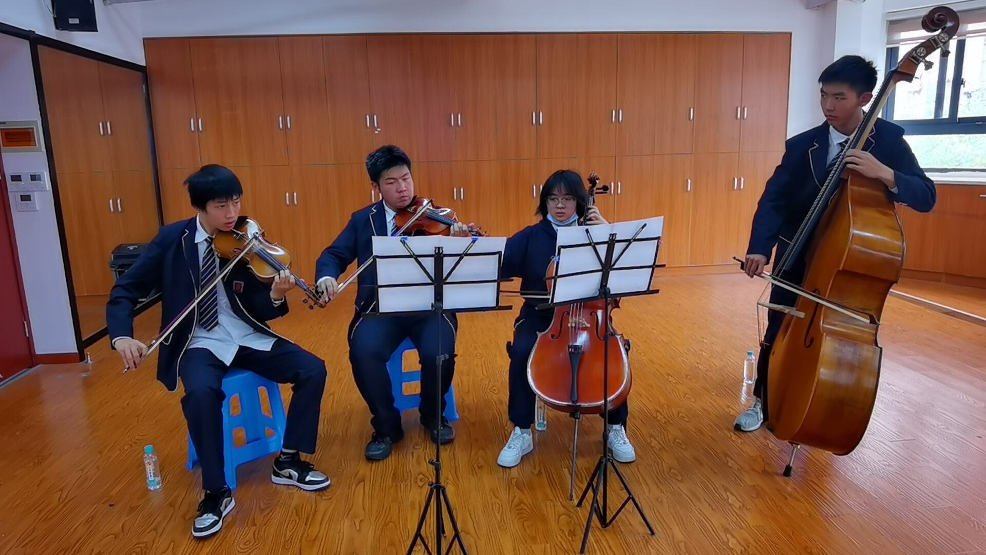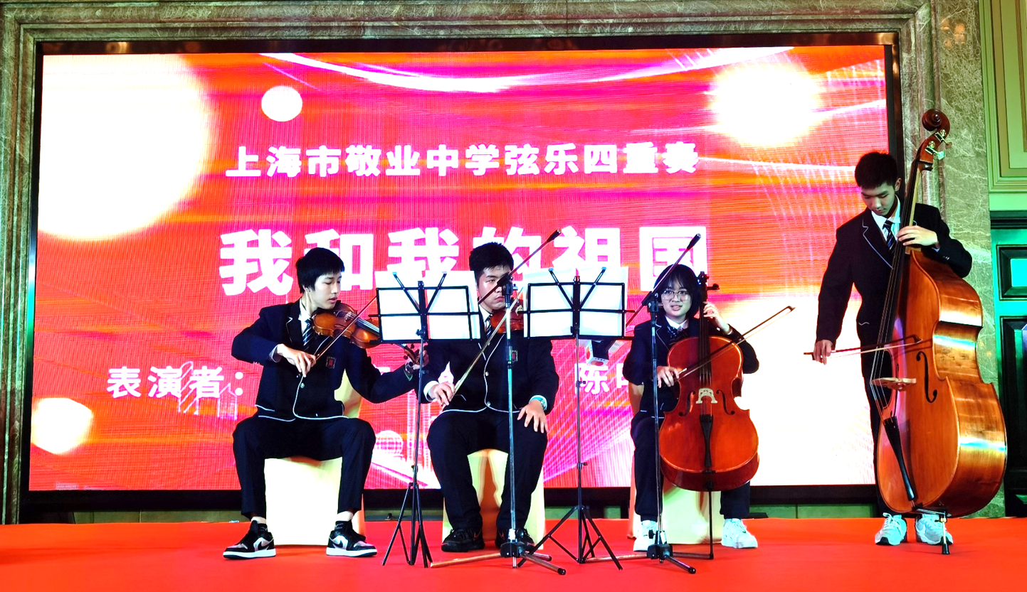 在开幕式中的弦乐四重奏是我校高一的四位同学利用周末时间,自行编排演奏的。在时间短、任务重的情况下,他们分秒必争 利用业余时间紧张排练,给开幕式献演了《我和我的祖国》这首脍炙人口的经典曲目,收获了台下热烈的掌声。同时,也彰显了敬业学子优秀精神风貌。他们希望校内有器乐特长的同学们能够有更多这样同台演奏的机会,组建敬业人自己的乐队,期待与大家一起演奏出敬业最美的和声!