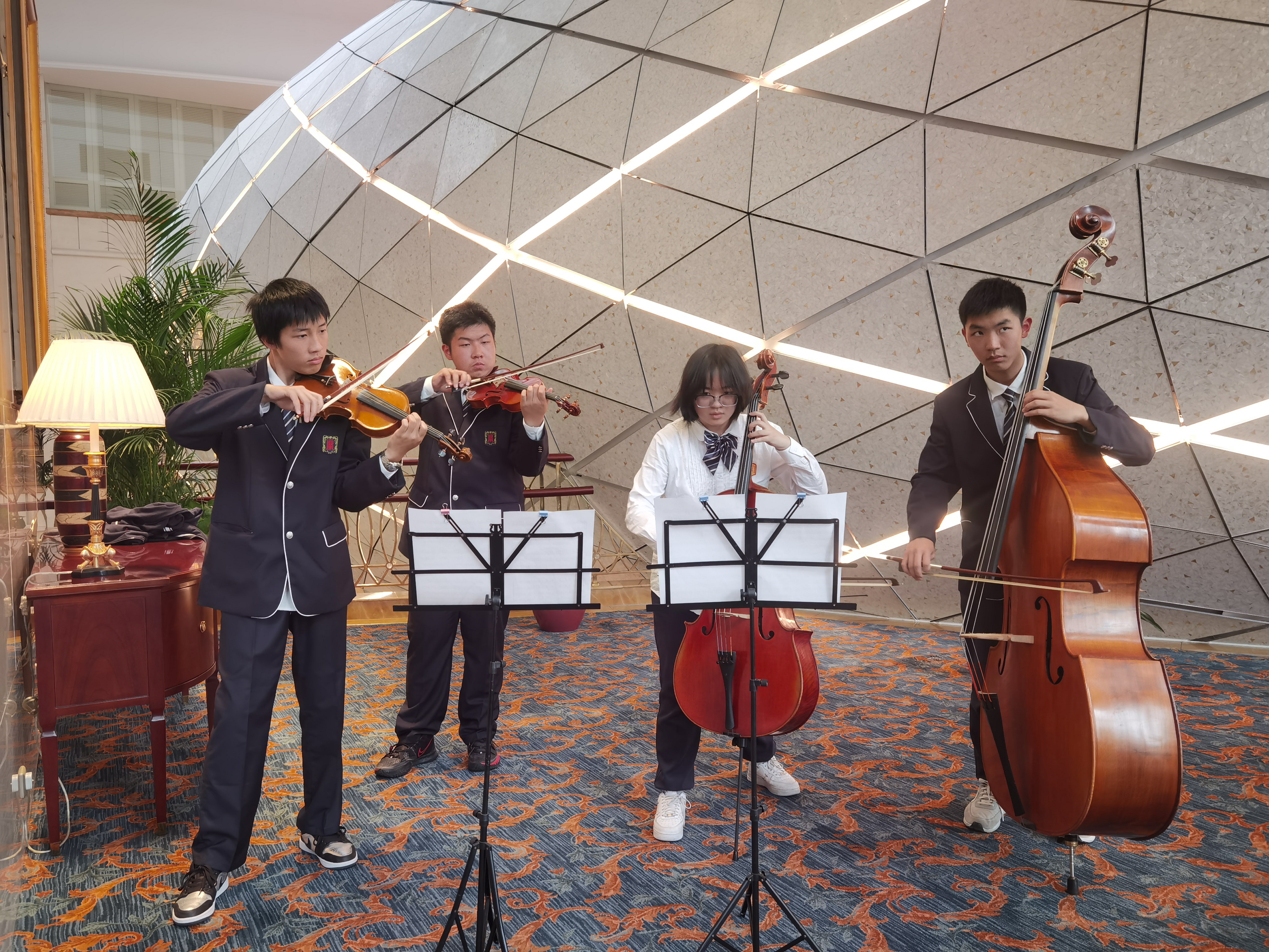 我校是应昌期围棋教育基金会唯一一所受邀参加开幕式的高中学校,总支书记马伟、校围棋教练黄浒,及校艺术总辅导袁凌蓉三位老师应邀出席。来自2025届4班的陈明懿、黄春宇和2025届5班的蒋智恺、杨铭宇4同学在开幕式现场演奏了一曲《我和我的祖国》弦乐四重奏。