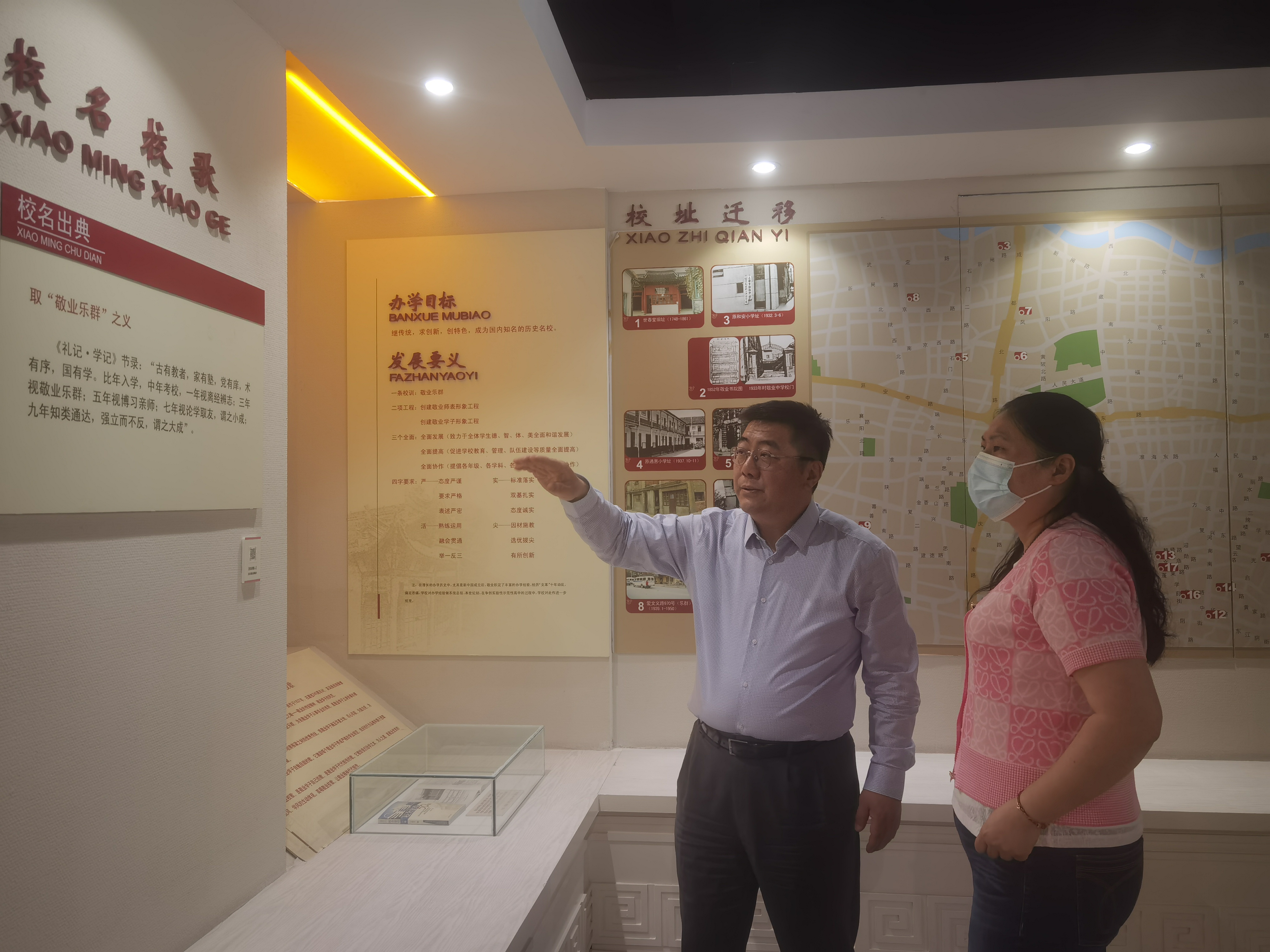 在校史讲解中,马伟书记向吴校长讲解了校史变迁中的不同教育阶段敬业这所百年老校所承载的历史使命。德育副主任、情感教育工作室学员袁凌蓉老师以《从全员导师看师生情感关系》为主题,向到访嘉宾介绍了以全员导师制工作中师生情感交融为主线的红色行走、四史教育、劳动教育、家庭教育嘉年华等德育工作。