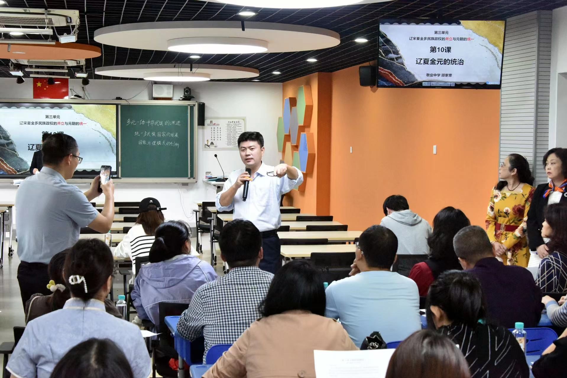 10月26日下午,河南省南阳市高中历史骨干教师能力提升培训班的80位教师前来敬业中学观摩听课和交流,我校历史教研组邵家豪老师进行教学展示,历史教研组长顾晓谷老师点评。本次活动由区历史教研员任俐老师主持。