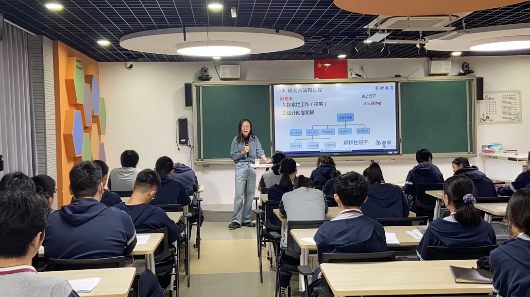 张老师在讲解访谈法时,提及应分为结构式访谈、半结构式访谈和自由访谈。老师推荐同学们半结构式访谈,通过预设问题和随机追问来获得研究材料。访谈法包括前期访谈提纲的编写、采访过程以及后续录音文字的整理三个重点部分。最后张老师也对同学们的课题寄予厚望,通过分享宝贵的课题研究经验,也给予了同学们明晰的指引方向,为2025届正在开展研究的高二同学们的课题研究报告提供了极大的帮助。