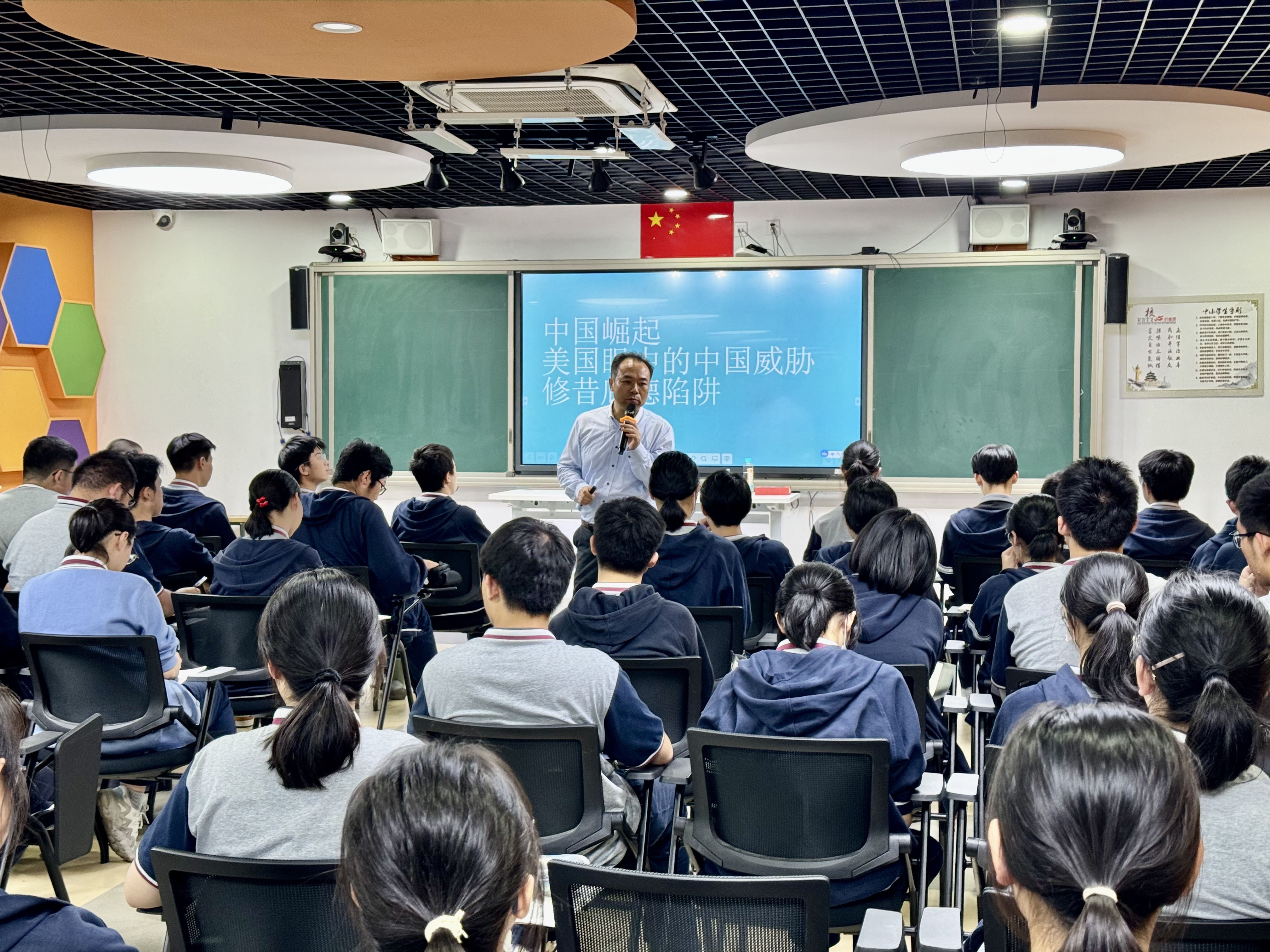 10月27日下午,我校很荣幸邀请到上海外国语大学国际关系与公共事务学院党委书记张绍铎教授为我校学生做《中美关系中的台湾问题》的专题讲座,场内座无虚席,同学们热情高涨。张教授的讲座由希腊城邦的故事切入,引出中美相互博弈的关系中,双方对于地区矛盾的协作与冲突。
