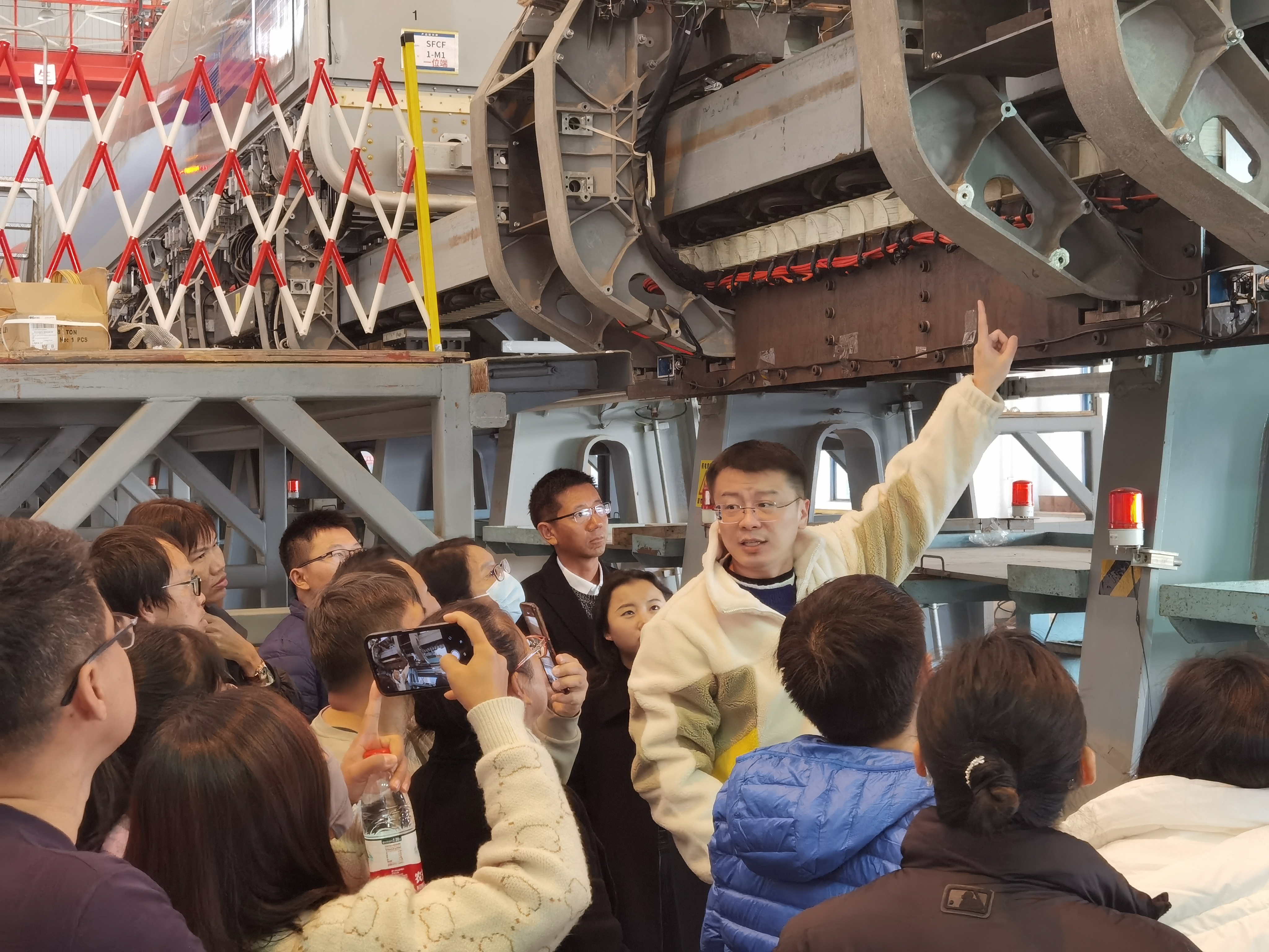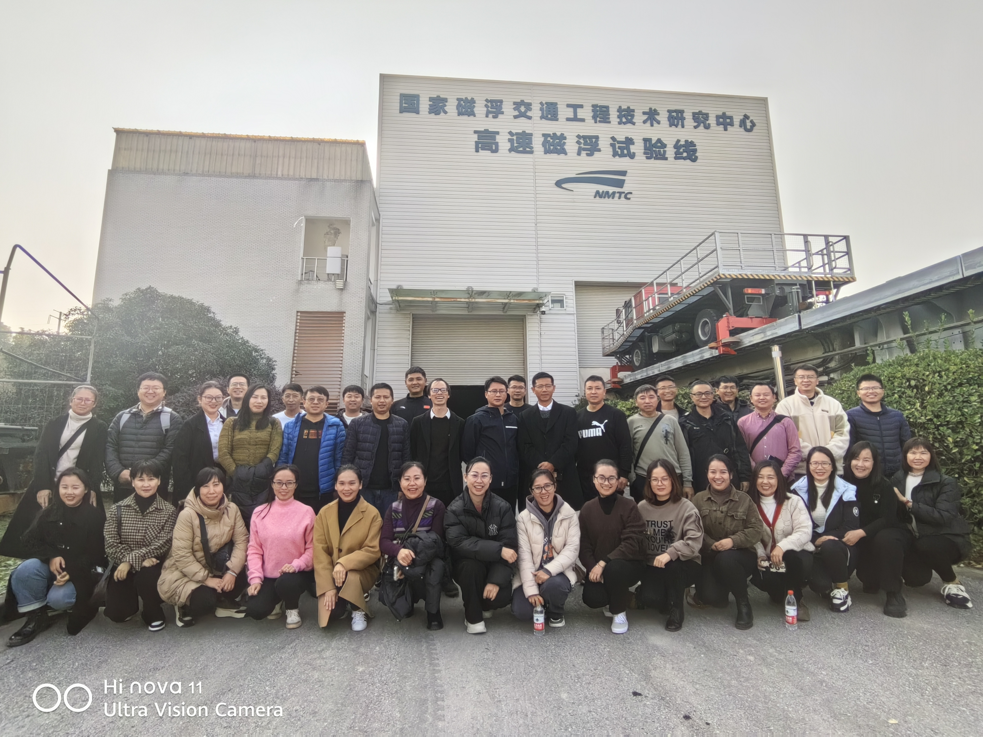 团队一行首先参观了同济大学国家磁浮交通工程技术研究中心的高速磁浮试验线,“磁浮中心”的赵元哲老师介绍,该试验线是国际上唯一一条1.5公里长的常导长定子磁浮工程试验线,二十年来,相关科研人员坚持自主创新,为今天高速磁浮系统研发及工程化研究奠定了坚实的基础。