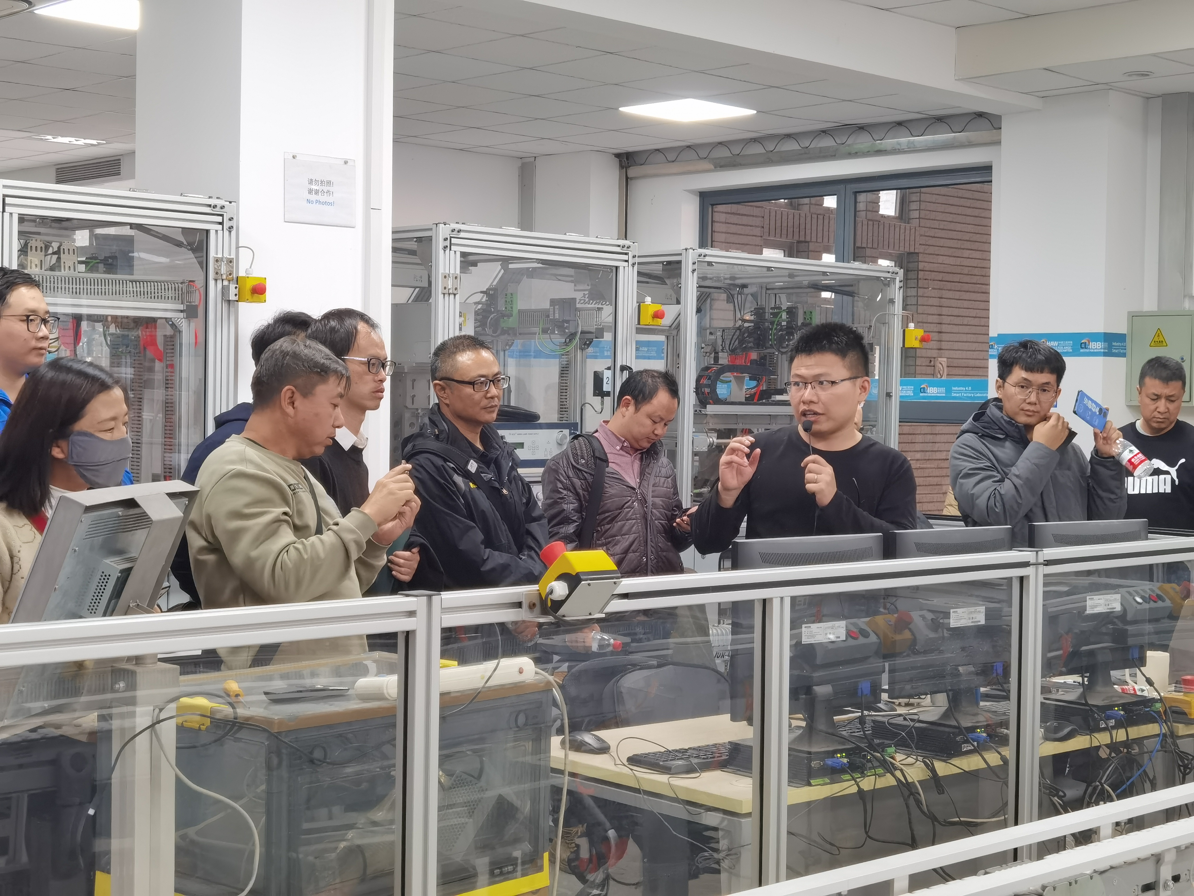 最后,老师们来到中德工程学院的智能制造实验中心,在研发工程师黄华老师的带领下,参观了国内首个“工业4.0”实验室,体验数字技术、人工智能在生产、制造中的广泛应用,以及其带来的革命性突破。