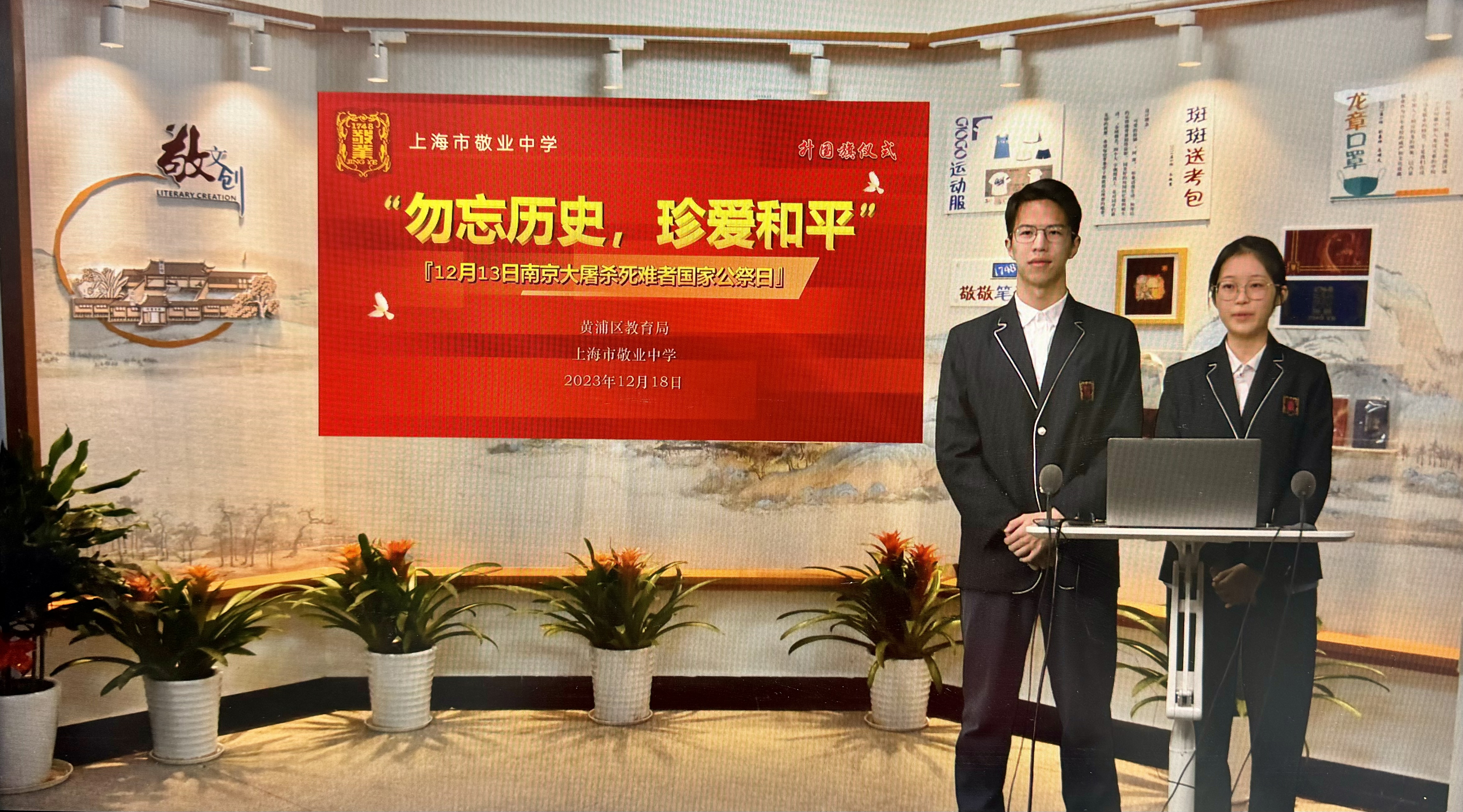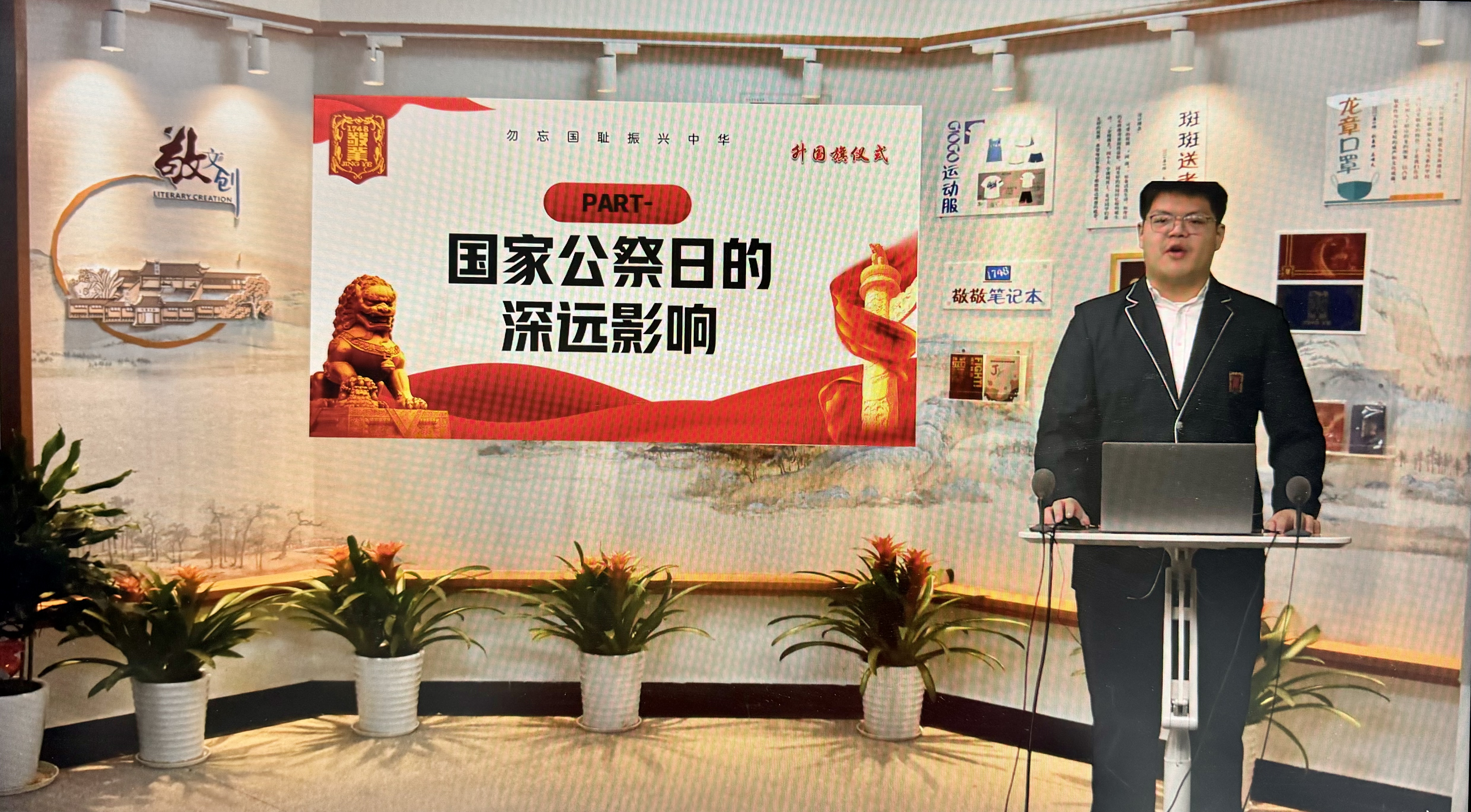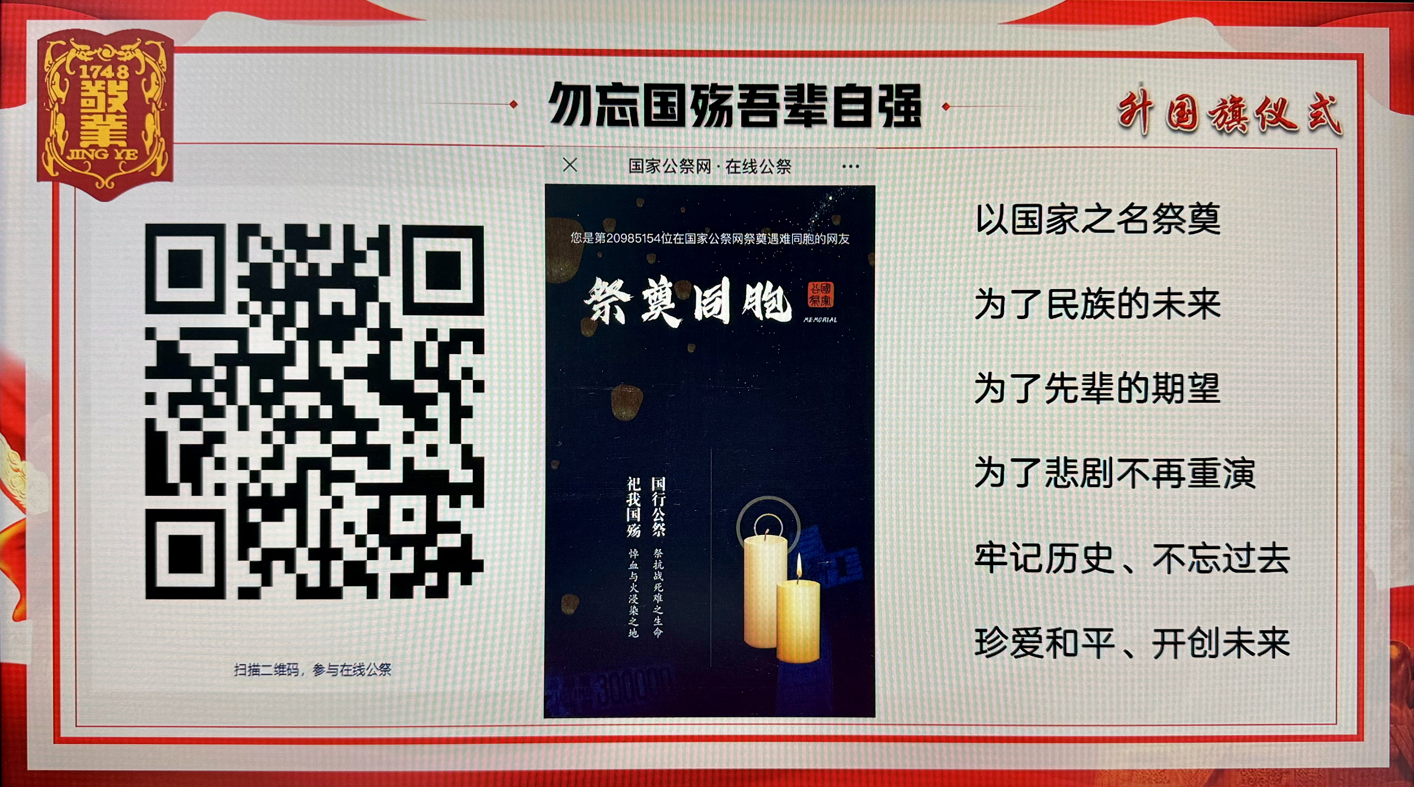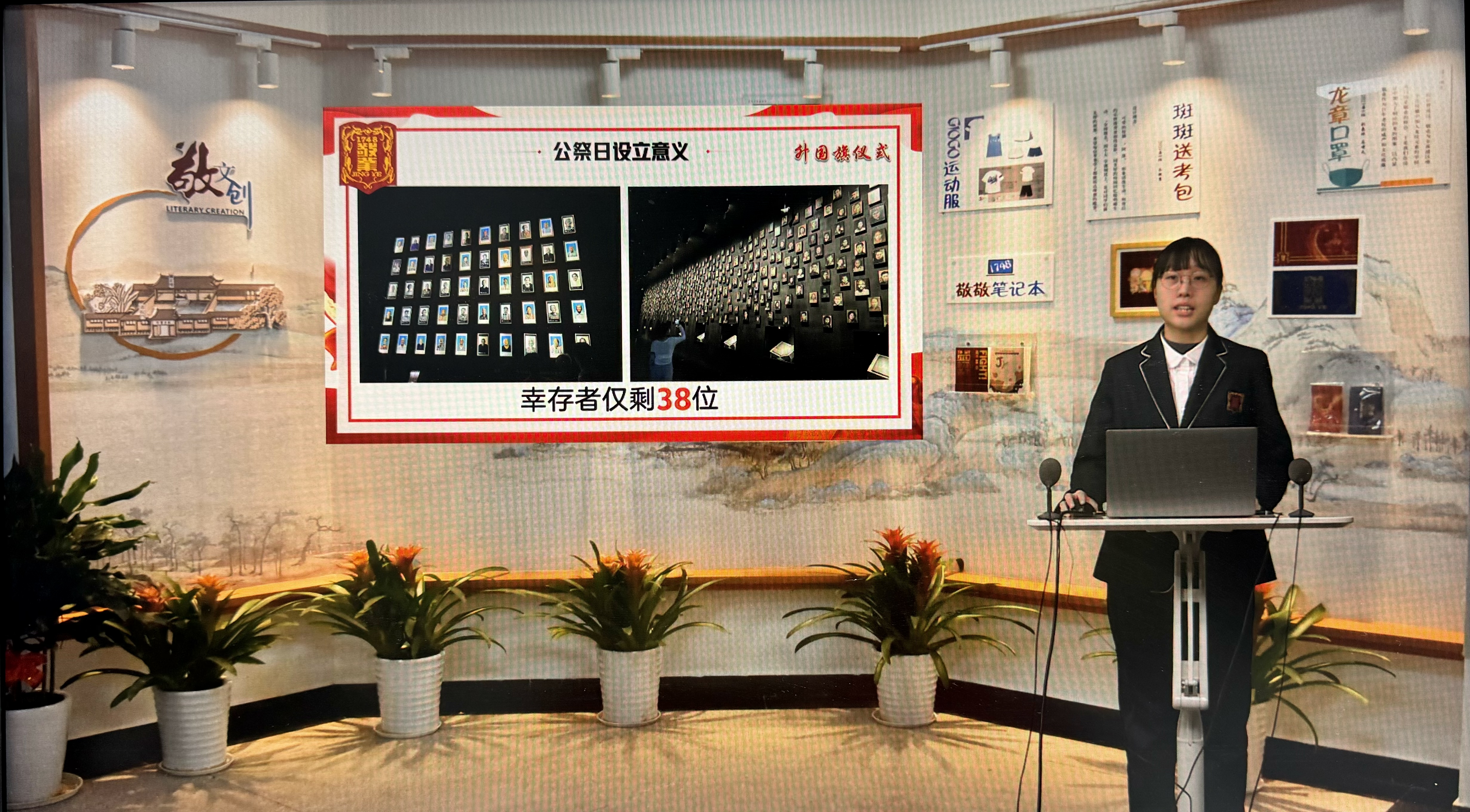 最后,李浩翔同学带来公祭鼎铭文的朗诵,主持人邀请师生们放学后进行线上公祭,和亿万国人一起线上参与,为南京大屠杀死难者默哀,愿战争之火长弭,和平之花常开!铭记,不只是民族的悲怆,还有落后必亡的训诫;纪念,从不为宣扬复仇的怨念,只为许下复兴的心愿:吾辈当自强!哀伤藏于心,实干强我邦!