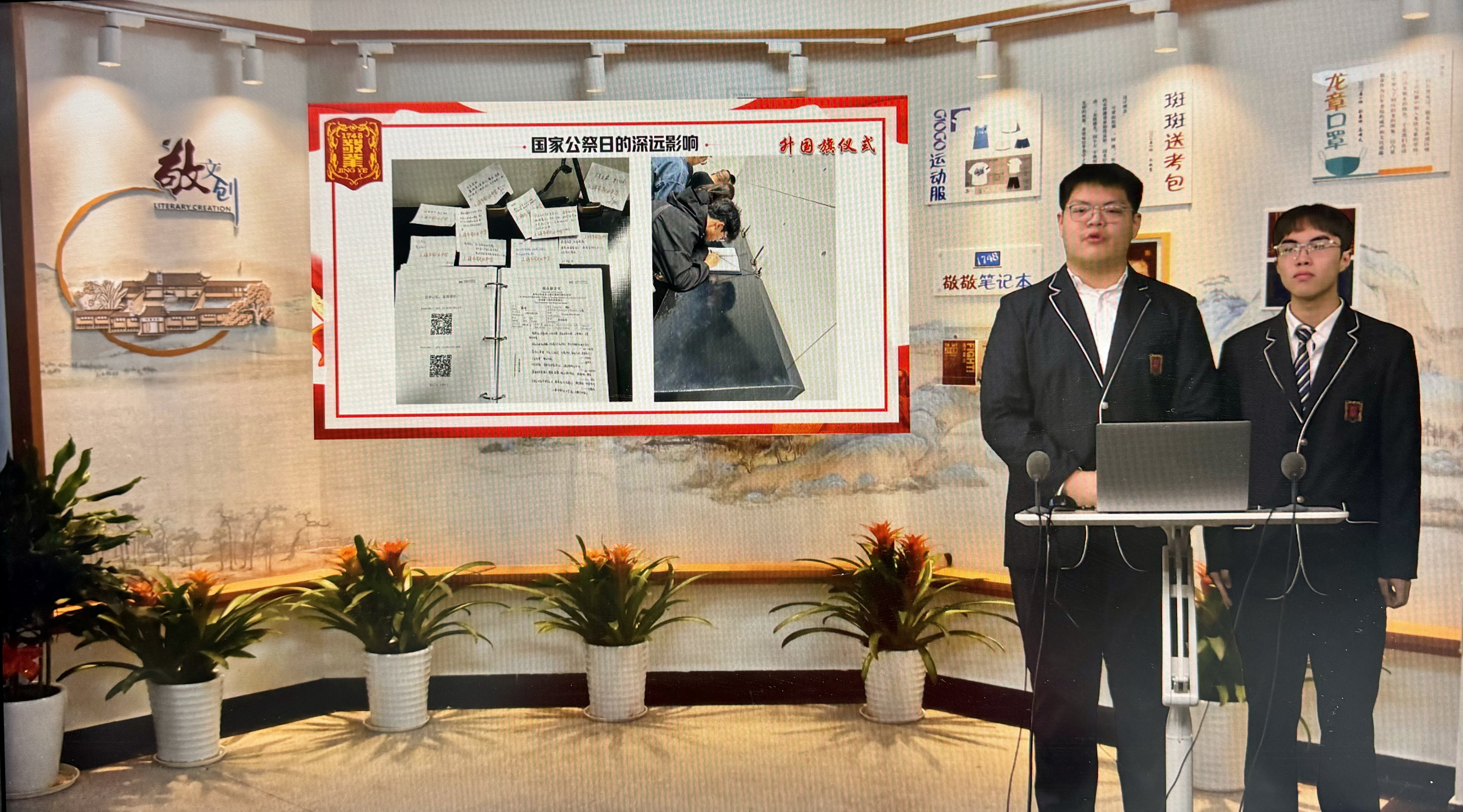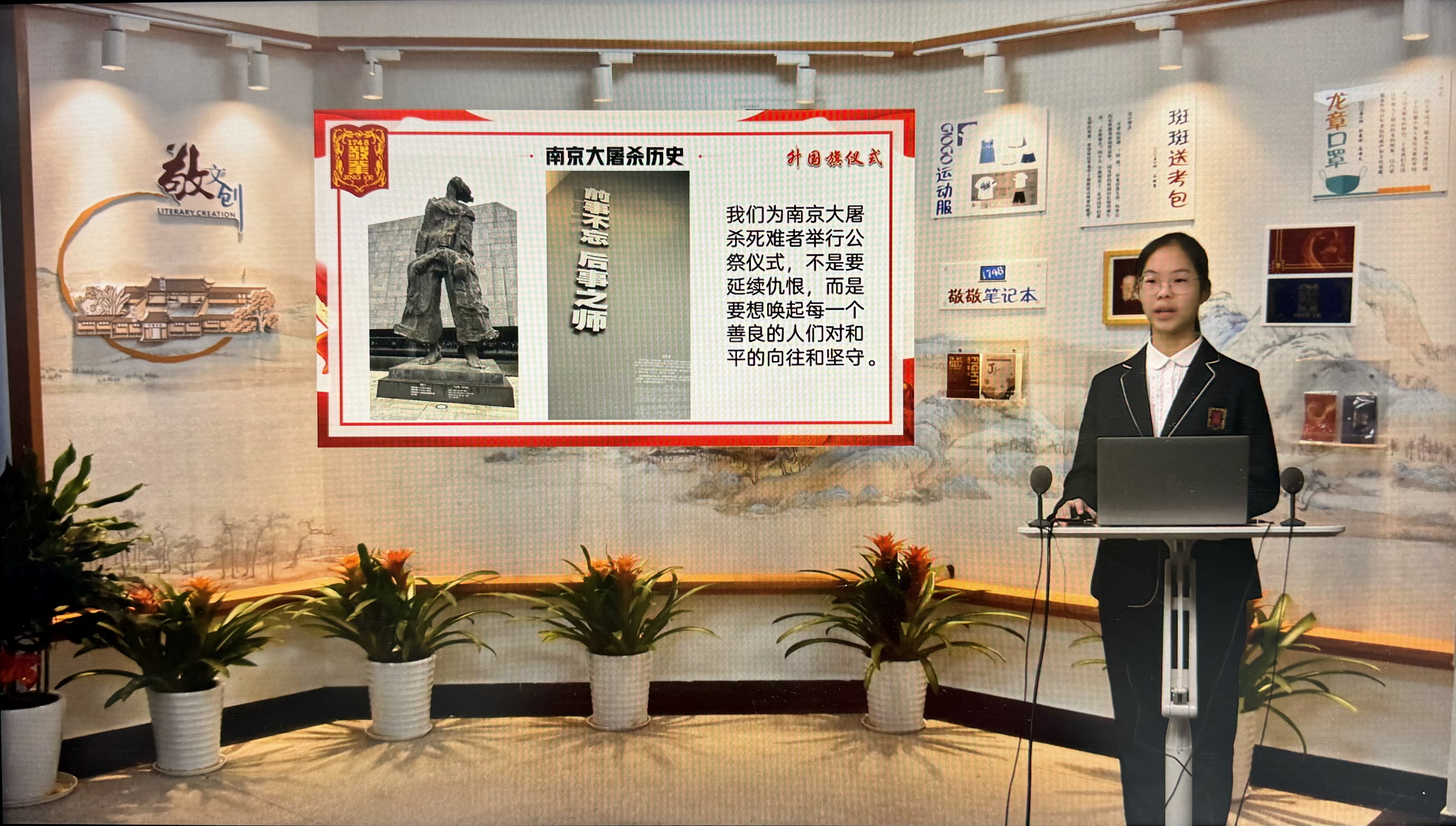在现场,贾曦远同学还邀请高二四班万浩钧同学分享了他的故事:“屏幕中的图片是在今年国庆前夕的一节思政课堂上,老师讲述这段历史后,我们写下的感悟,老师后来将我们的留言带到了南京大屠杀遇难同胞纪念馆,抄写在了馆内的留言册上。当时我写下了‘鉴先人之苦楚,兴后人之家国。壮哉中华,铭记历史,负重前行’,我觉得这种怀念不仅仅是一种仪式感,更是中华儿女血脉里的自觉,铭记历史上我们真实遭受的苦难,更能激励自我奋发向上、努力奋斗!更加珍爱和平,珍惜今天的美好生活,让生命更有意义和价值!”