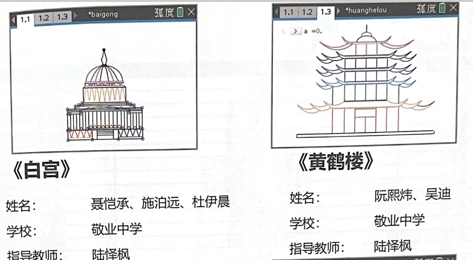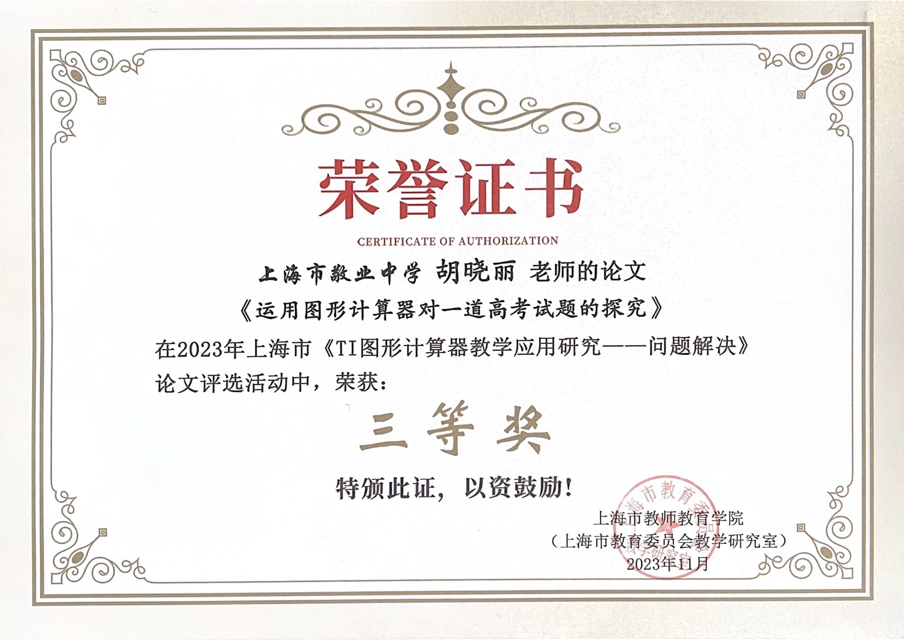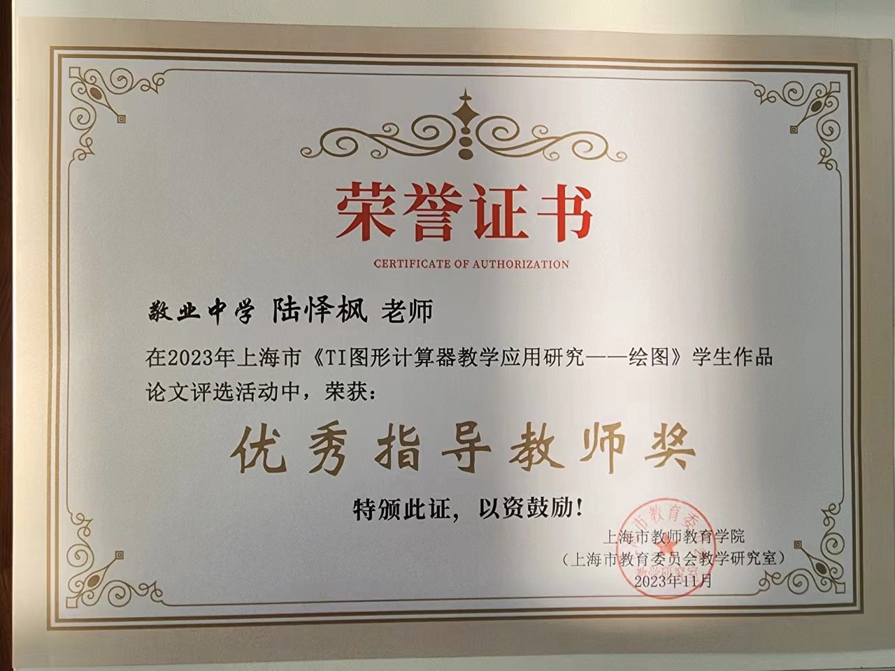 在上海市教师教育学院组织的“2023年ti图形计算器教学应用研究——解决问题和绘图作品”评选活动中,敬业师生积极参与,借助ti图形计算器研究问题、完成作品,取得优异成绩:
