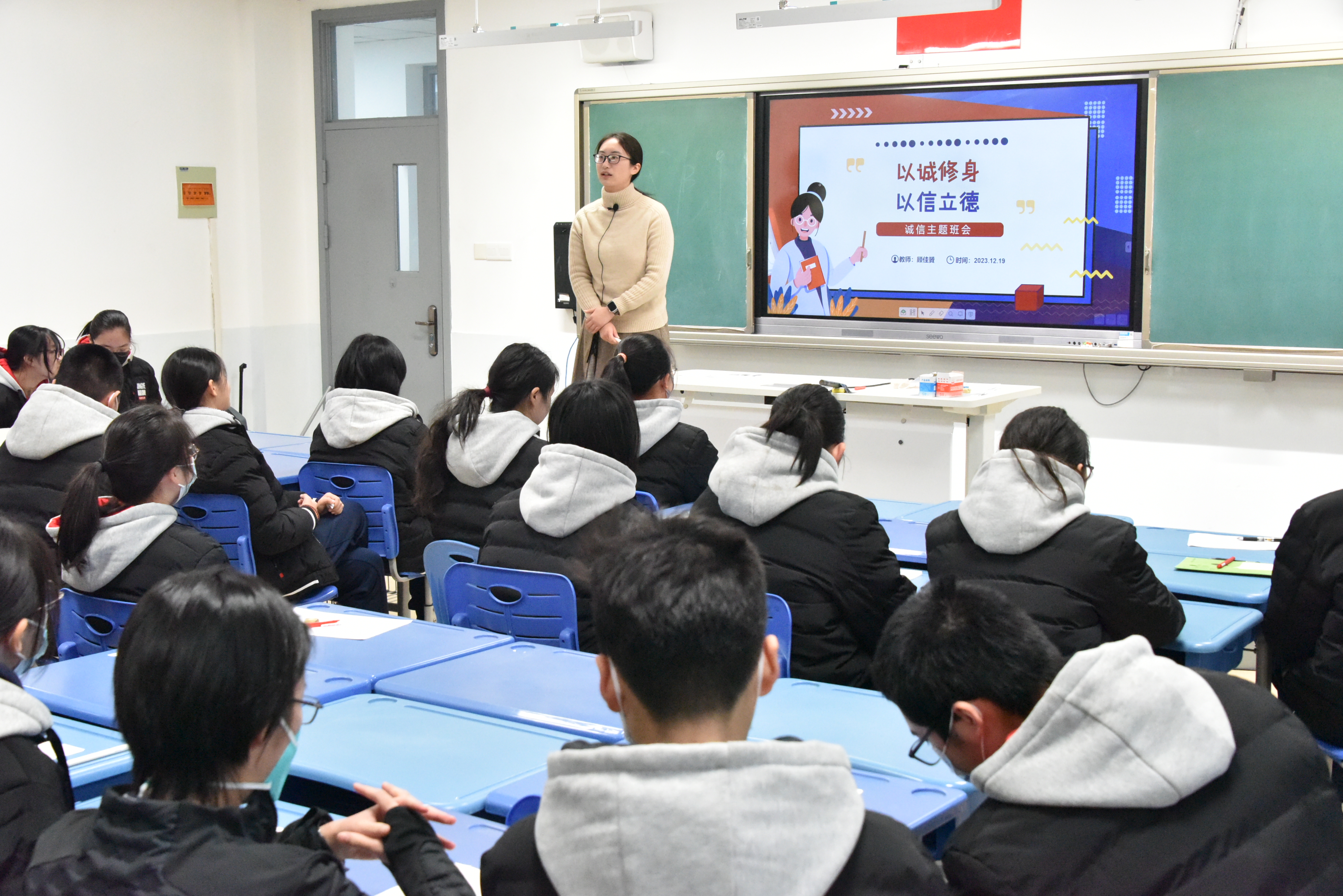 顾佳贇老师以《以诚修身,以信立德》为主题,从学生身边的真实情境出发,帮助学生从个人、企业、社会多角度理解诚信的内涵及其重要意义。随后,通过“青岛38元一只大虾”以及“哈佛藏书楼”两起事件进行案例分析与现场互动,进一步加深学生对诚信意识、规则意识以及权责意识的理解。此外,顾老师还介绍了我国个人征信档案的管理与信息公示,使学生了解失信所产生的个人影响。