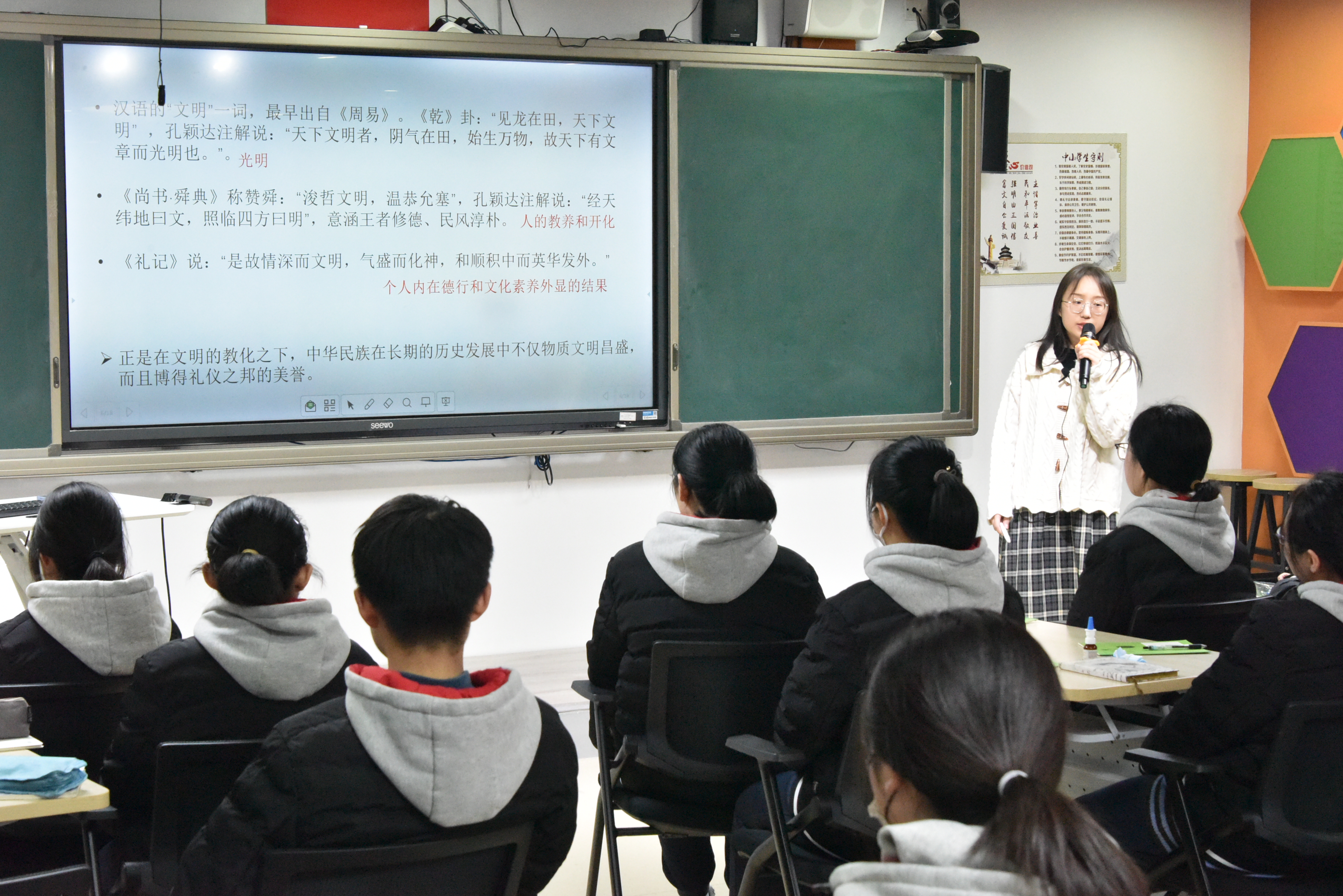 金俐延老师以《创文明校园 做文明学生》为主题,以中华优秀传统文化中文明发展的脉络轨迹为切入点,帮助学生厘清文明的概念及范畴,剖析环境因素对个人的影响。随后,通过现场小组交流的方式,分析身边的不文明行为及其产生的个人、家庭、社会等原因。最后,在金老师的带领下,全体学生共同宣誓、许下承诺,争做文明学生,共创和谐校园。