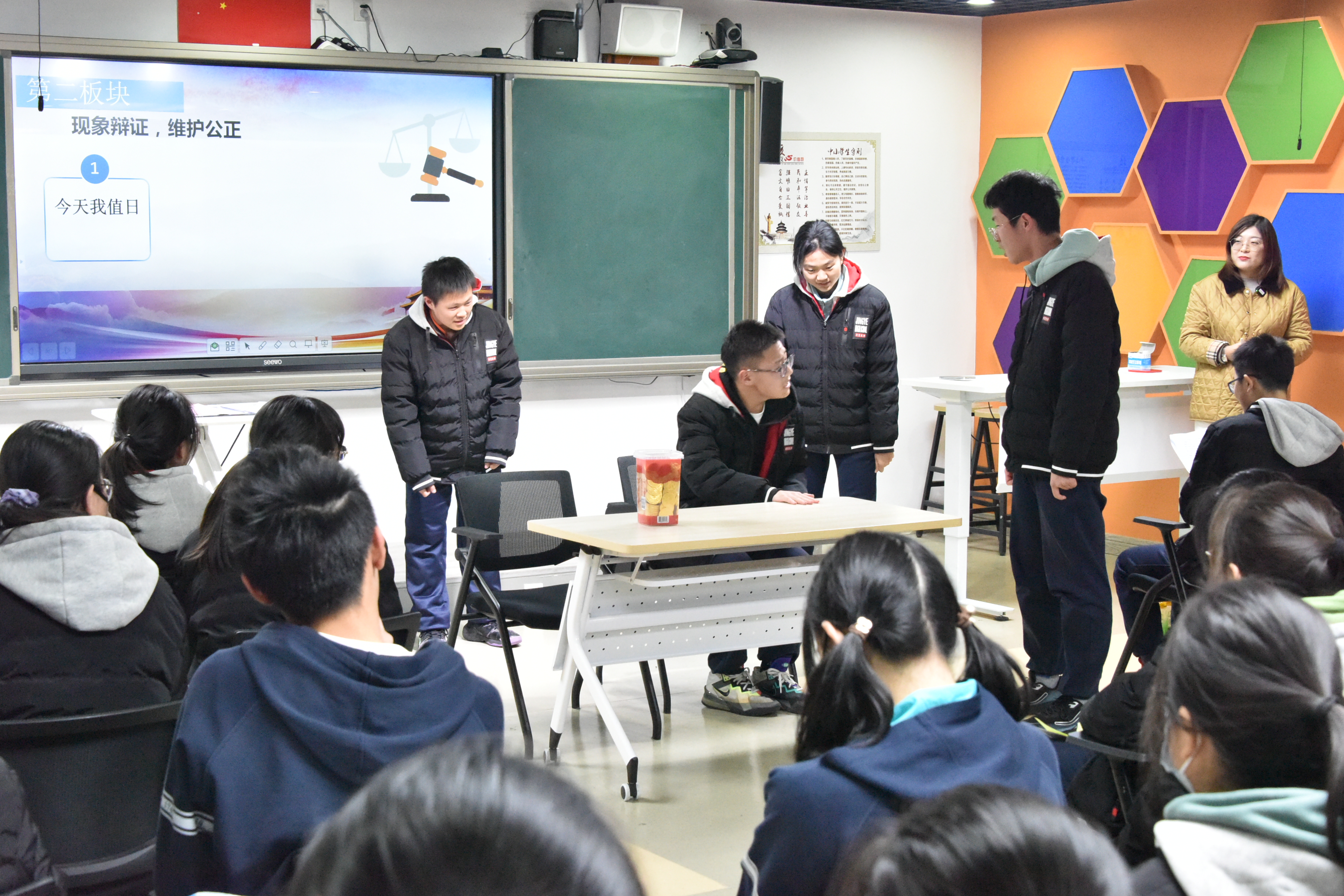 牛婷婷老师以《公正的力量》为主题,先结合学科知识,引发学生对公正的讨论。随后,通过“今天我值日”“我与吃饭那些事”“职场‘双向’选择”三个现场情景短剧演绎,带领学生各自阐述对公正的理解,帮助学生深刻体会实现公正的基础以及制度保障的重要性,加强了学生的社会公正感和理智感。最后,学生们通过交流讨论、互动分享,表达了关于共建社会公正的具体行动以及美好愿景。