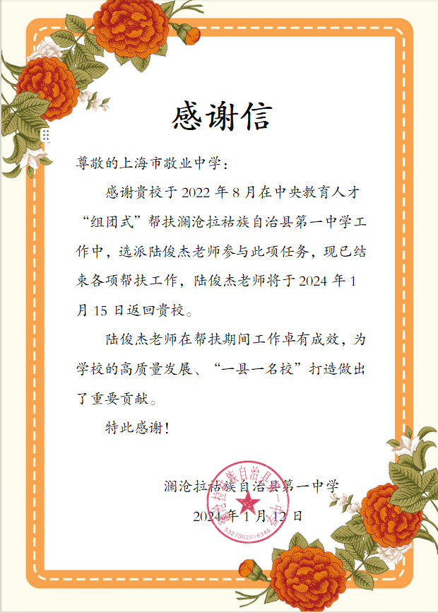 云南澜沧一中来信致谢我校帮扶团队-九游会国际