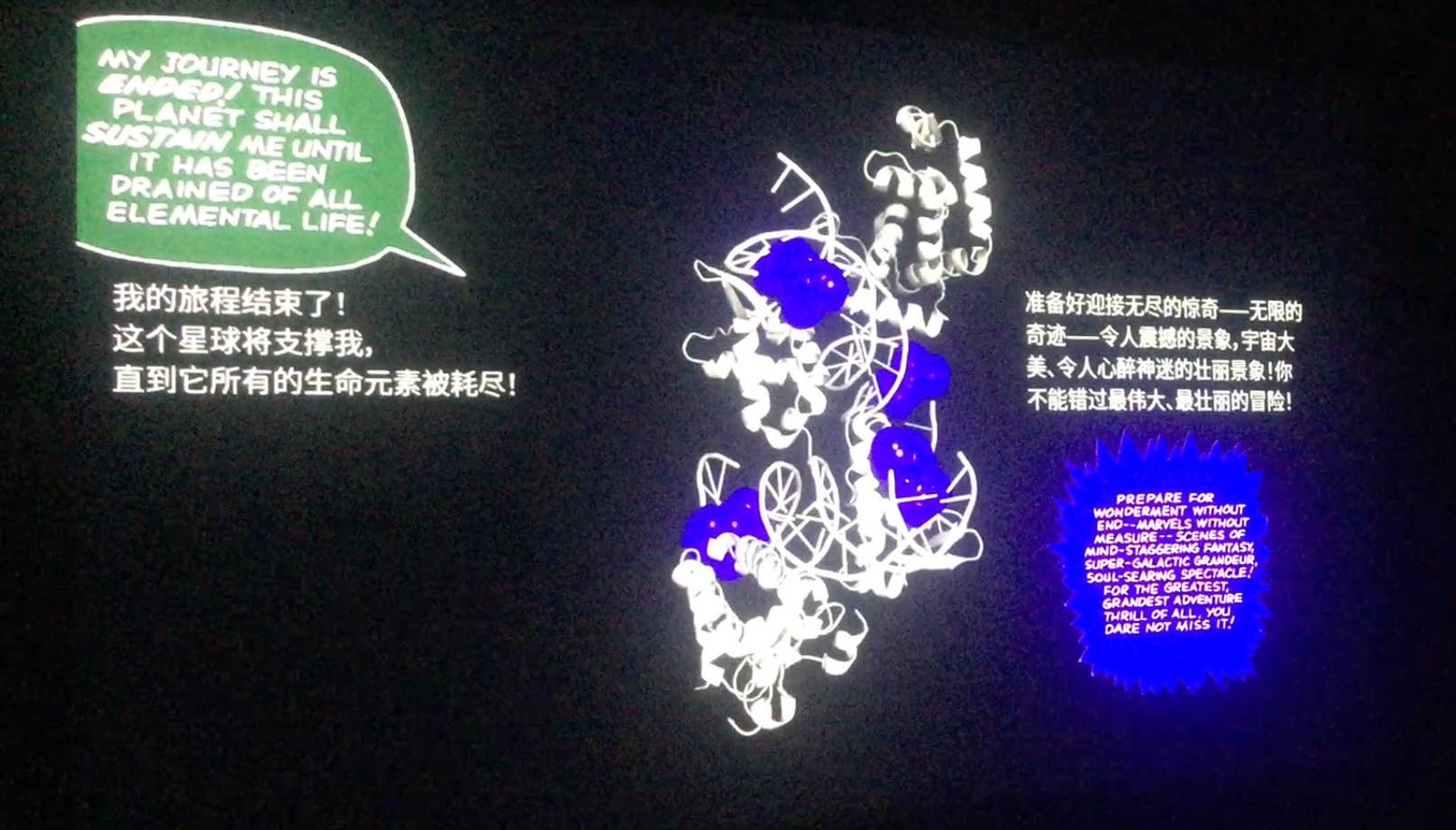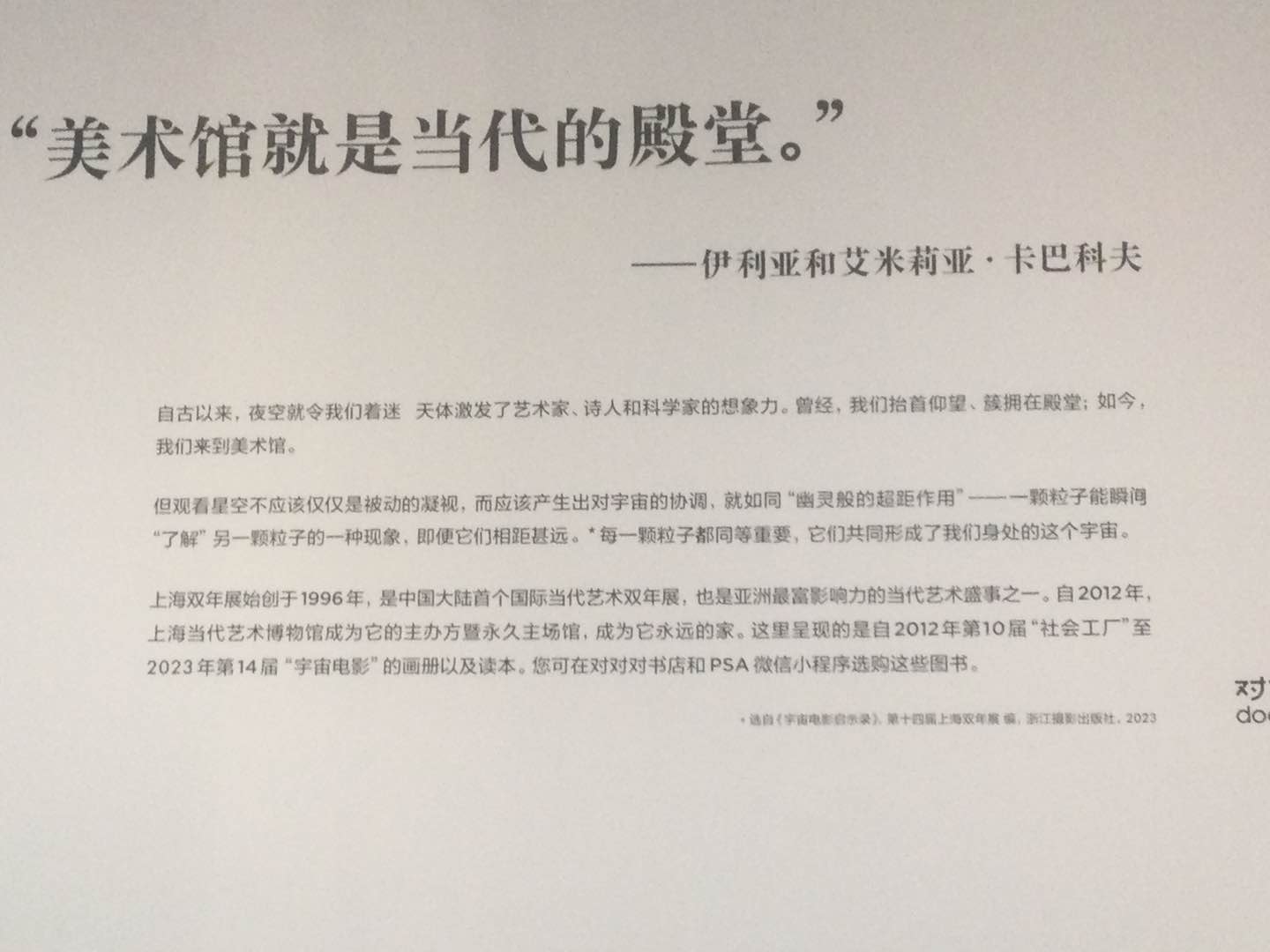 领奖仪式结束后,高一8班继续参观了上海当代艺术博物馆,正如张老师所言:“从初中到高中到成年一批又一批的志愿者与此建立联系,无论今后是否从业艺术类,我们培养对艺术的兴趣、得到艺术的养分,是从认知当代艺术开始。”在这个以宇宙为背景的展馆下,在第一展区我们沉浸在一件件艺术品看似随意布局却透露出的无法言喻的美感之中;在电影展区,我们尝试走进21世纪那些最伟大的头脑们创造的精神世界,感受这时间的永恒与寂静,思考着生命轮回万物存在的意义。我们恍然大悟:原来脉搏的每一次轻微的颤动都蕴涵着自然最伟大的奥秘,原来牙齿可以连接先祖与海洋,古老的树木只能被梦到,原来这个星球将支撑着我们体内的基因进行一场最伟大、最壮丽的冒险直到它所有的生命元素被耗尽。每一位艺术家都是一位诗人,一位哲人,与其说是在参观展馆,不如说在体验一场史诗级的精神盛宴。