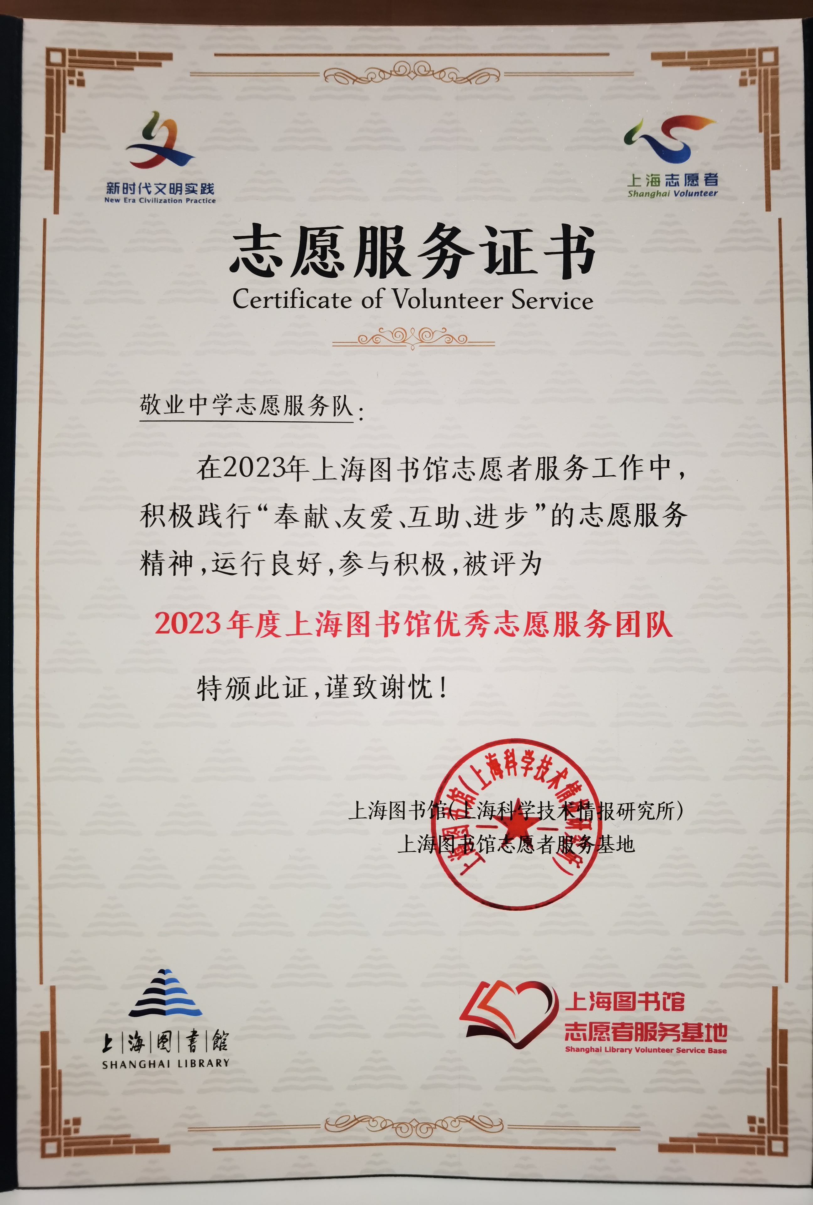 3月30日下午,上海图书馆举办了“弘扬志愿服务精神传递书香文明”2023年度上海图书馆优秀志愿服务表彰会,我校德育处社会实践志愿服务负责人袁凌蓉老师代表参加。敬业中学志愿服务队荣获了2023年上海图书馆优秀志愿者服务团队荣誉称号。