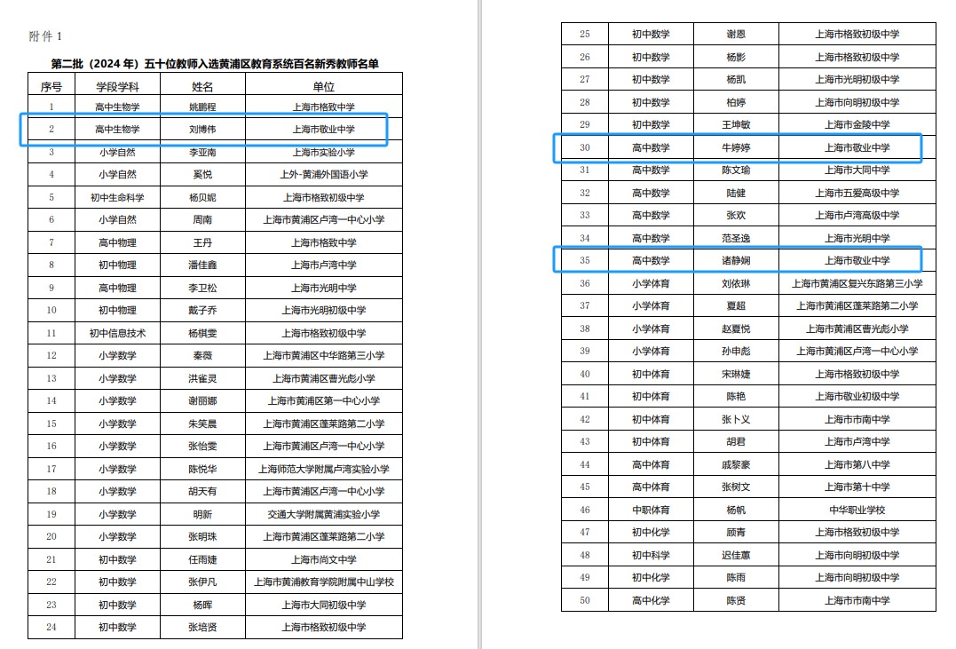 根据黄浦区教育局关于印发《黄浦区教育系统百名新秀教师培养计划》(黄教人[2022]13号)的通知要求,由黄浦区教育学院师训部实施计划的遴选工作。自2024年2月至6月,第二批小学自然、初中生命学科、高中生物学、物理、数学、体育与健康、化学、初中科学、信息技术等学科的178位教师,经过教学设计、说课与答辩、实录课评比的三轮评选,最终评选出50位教师入选第二批(2024年)黄浦区教育系统百名新秀教师培养计划。我校推荐的牛婷婷、诸静娴、刘博伟三位青年教师成功入选。至此,我校共有5名新秀教师。
