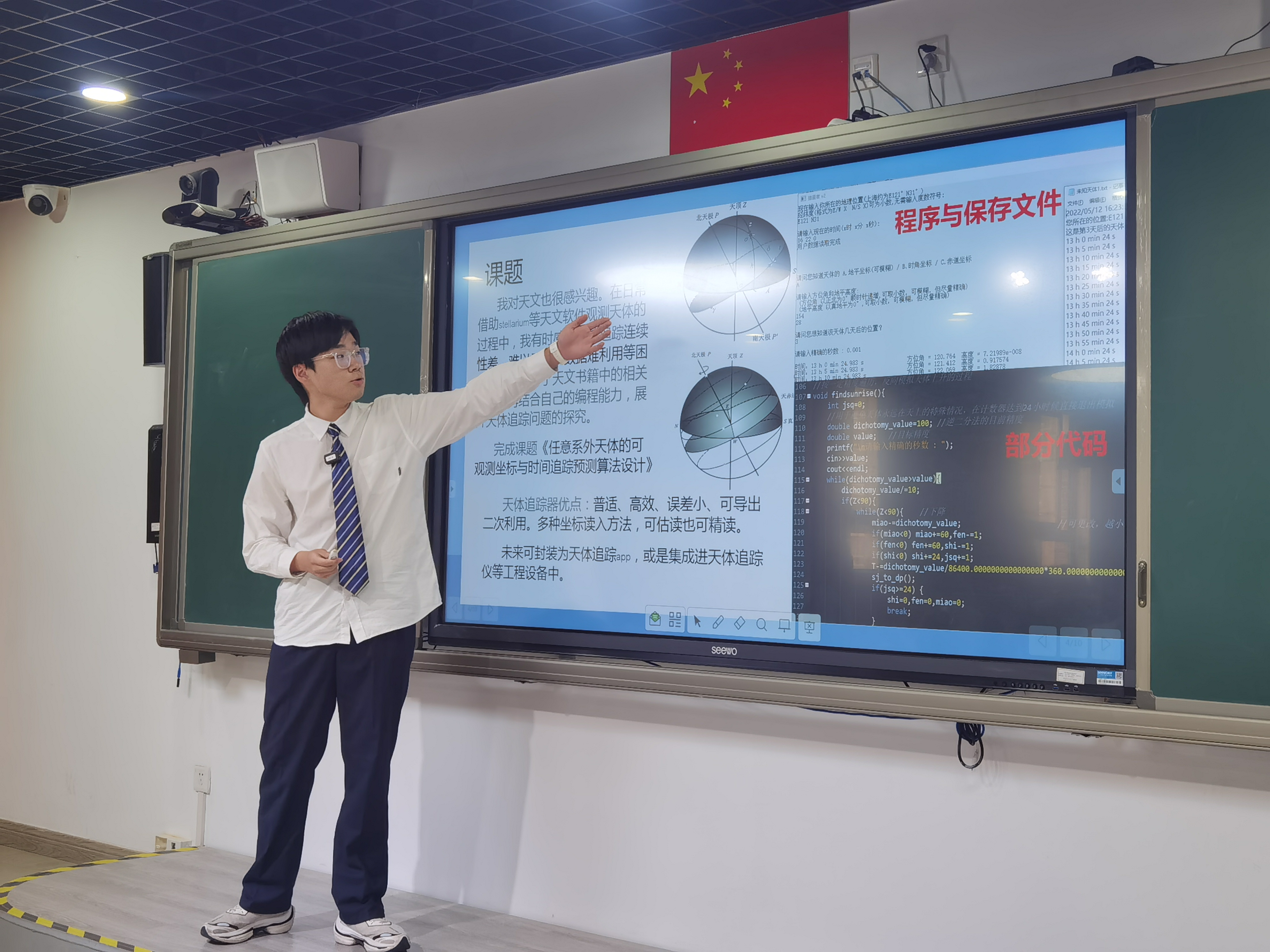 他对天文也很感兴趣。在日常借助stellarium等天文软件观测天体的过程中,有时感到天体追踪不便、难以寻找、数据难利用等困难。在自学了《基础天文学》《天文新概论》中的相关知识后,他结合自己的编程能力,展开天体追踪问题的探究。这一课题中完成了天体追踪器的设计,破除了模拟天体运动,多种坐标实现方法、数据导出等问题。这一课题最终获得了多个奖项。