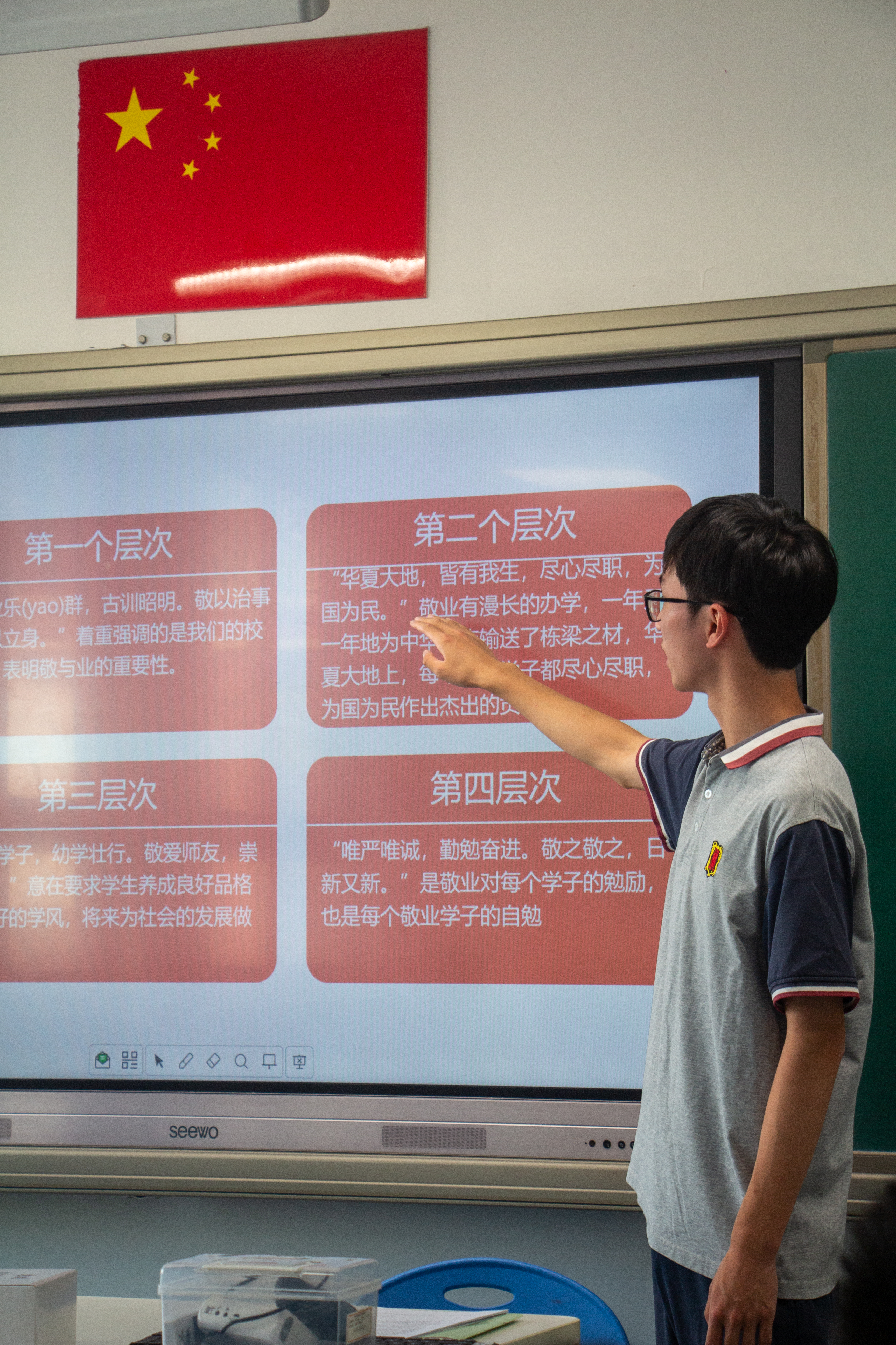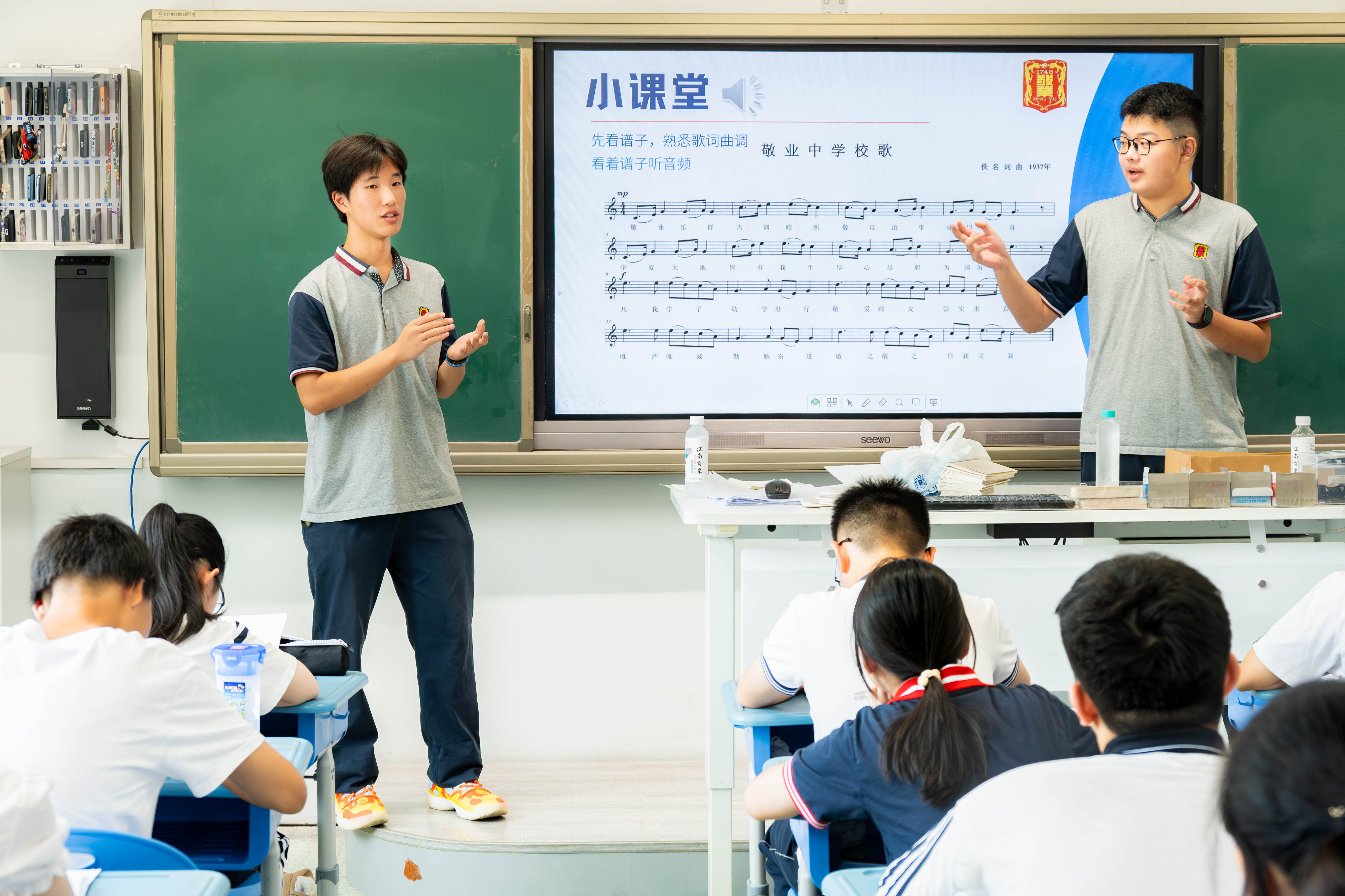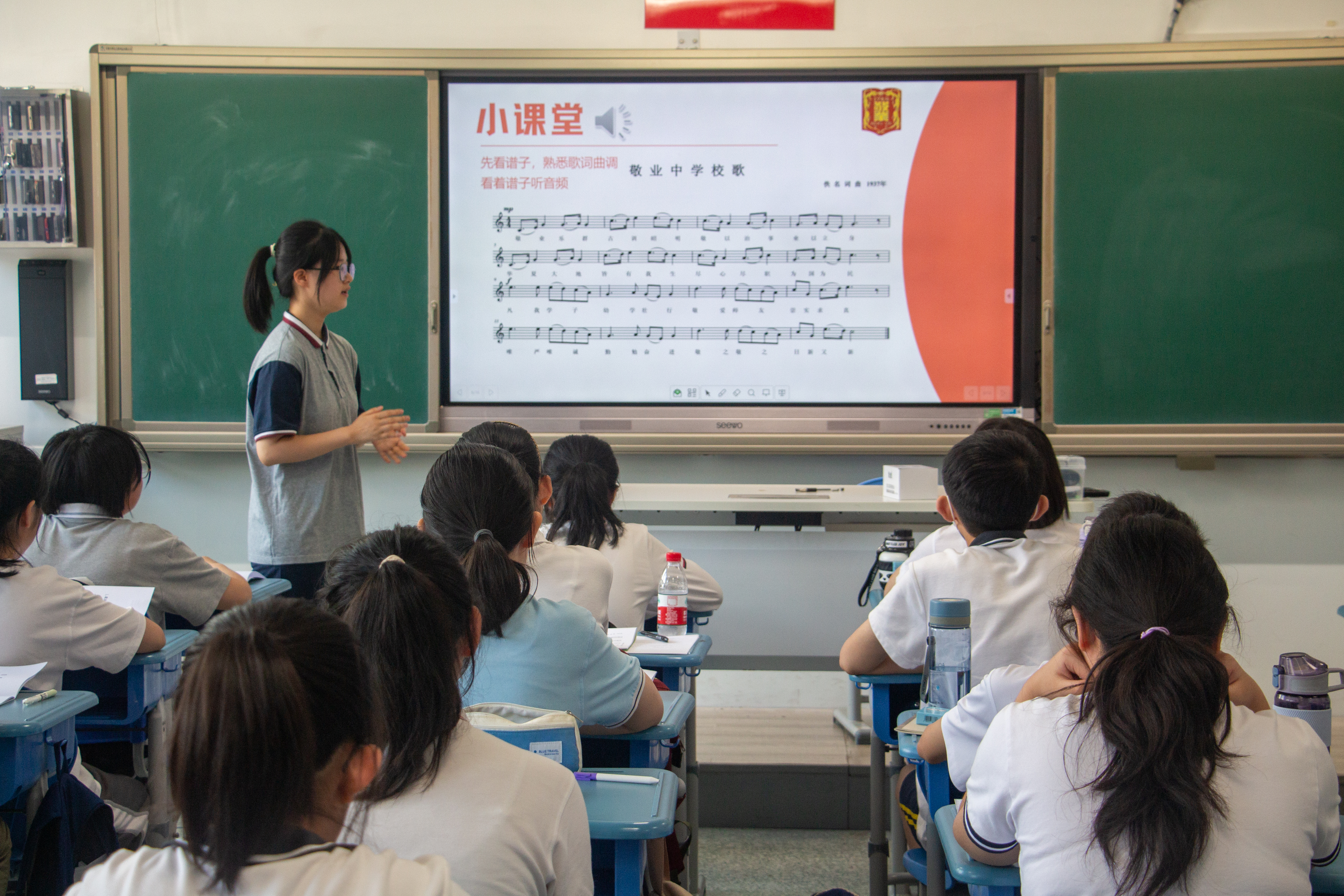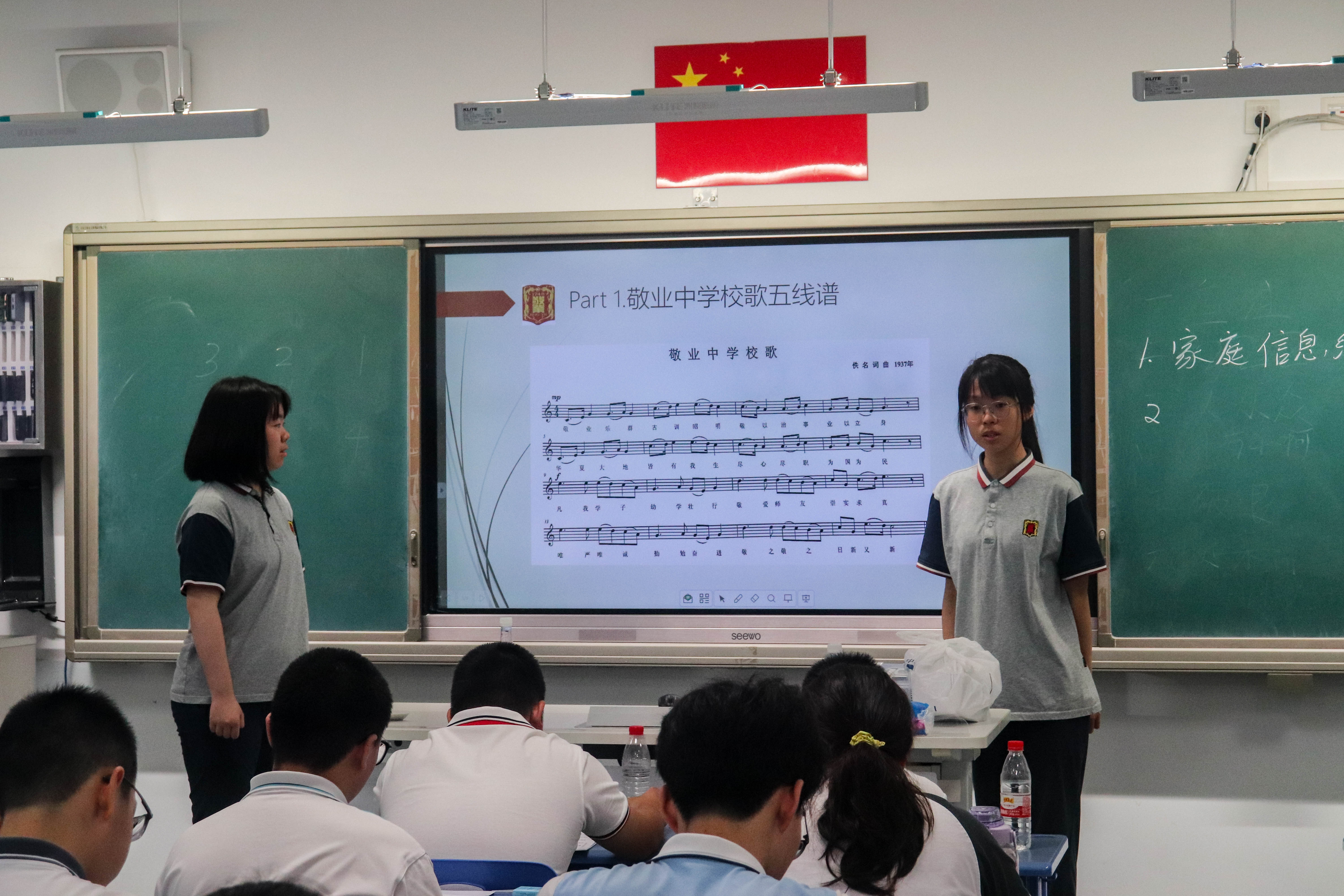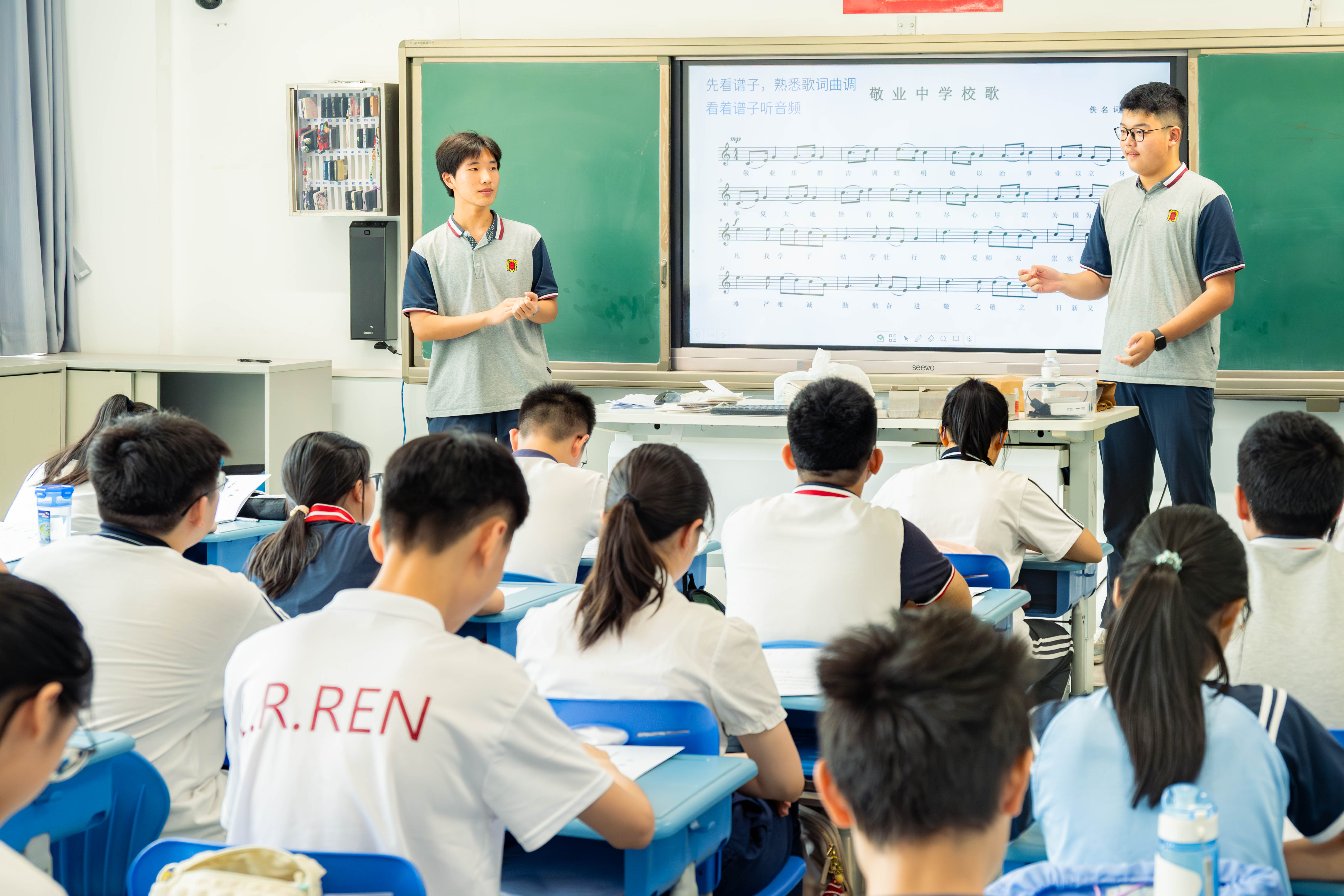 8月2日上午,正值2027届高一新生校内国防教育第二天,8位来自戏剧社和合唱团的新高二高三学长学姐来到高一新生不同的班级里进行校歌教唱,唱出敬业乐群的光耀校训,传承敬业学子的优良风范。