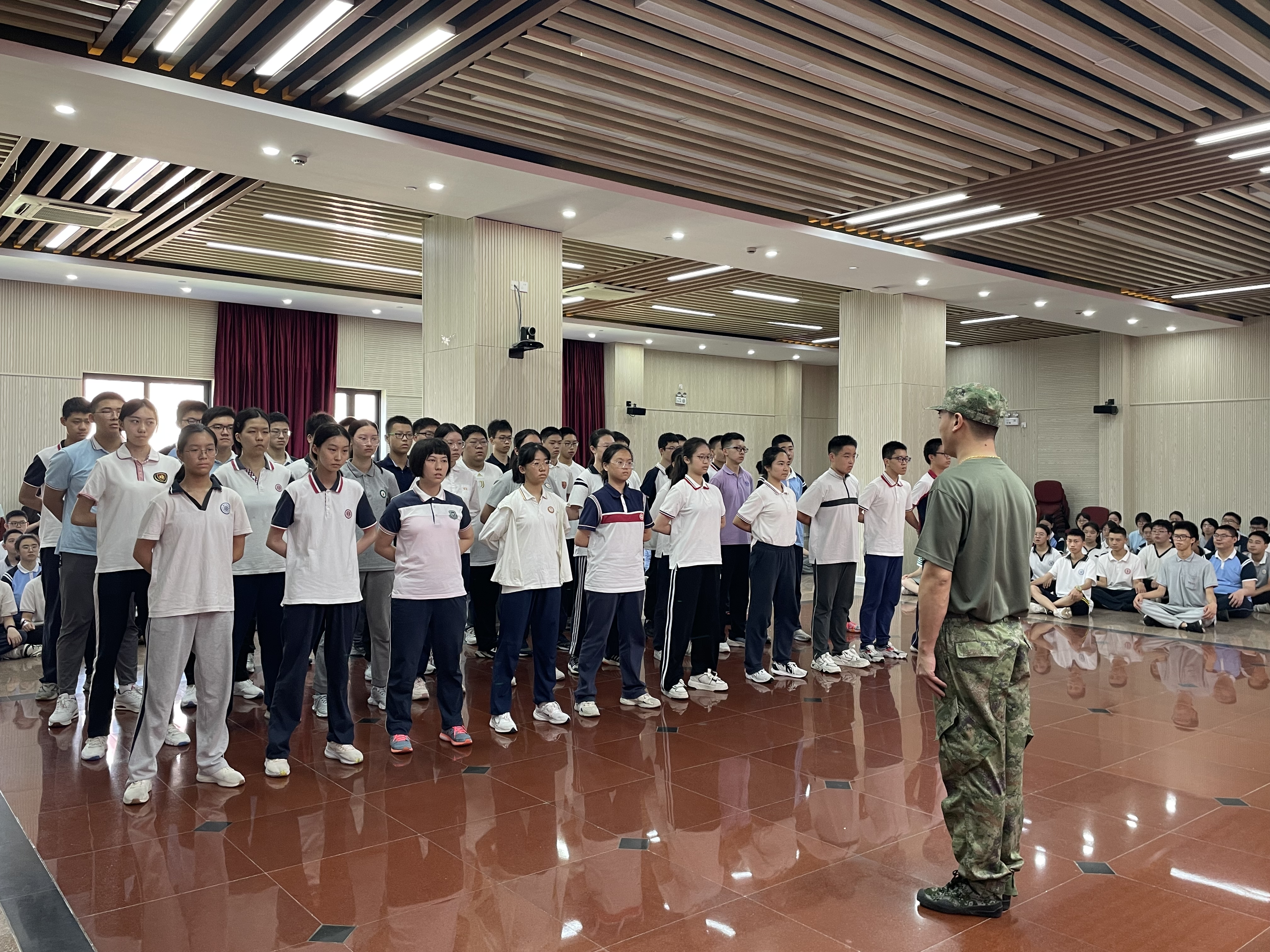 2024级高一年级新生校内国防教育第三天,同学们在带队教官的组织下,有序的在校内各个室内场地进行队列训练。“立正”“稍息”“踏步走”,“报数”“敬礼”“左右转”,适宜的体育锻炼逐渐唤醒同学们的机体,集体运动项目也促进了班级凝聚力的形成。