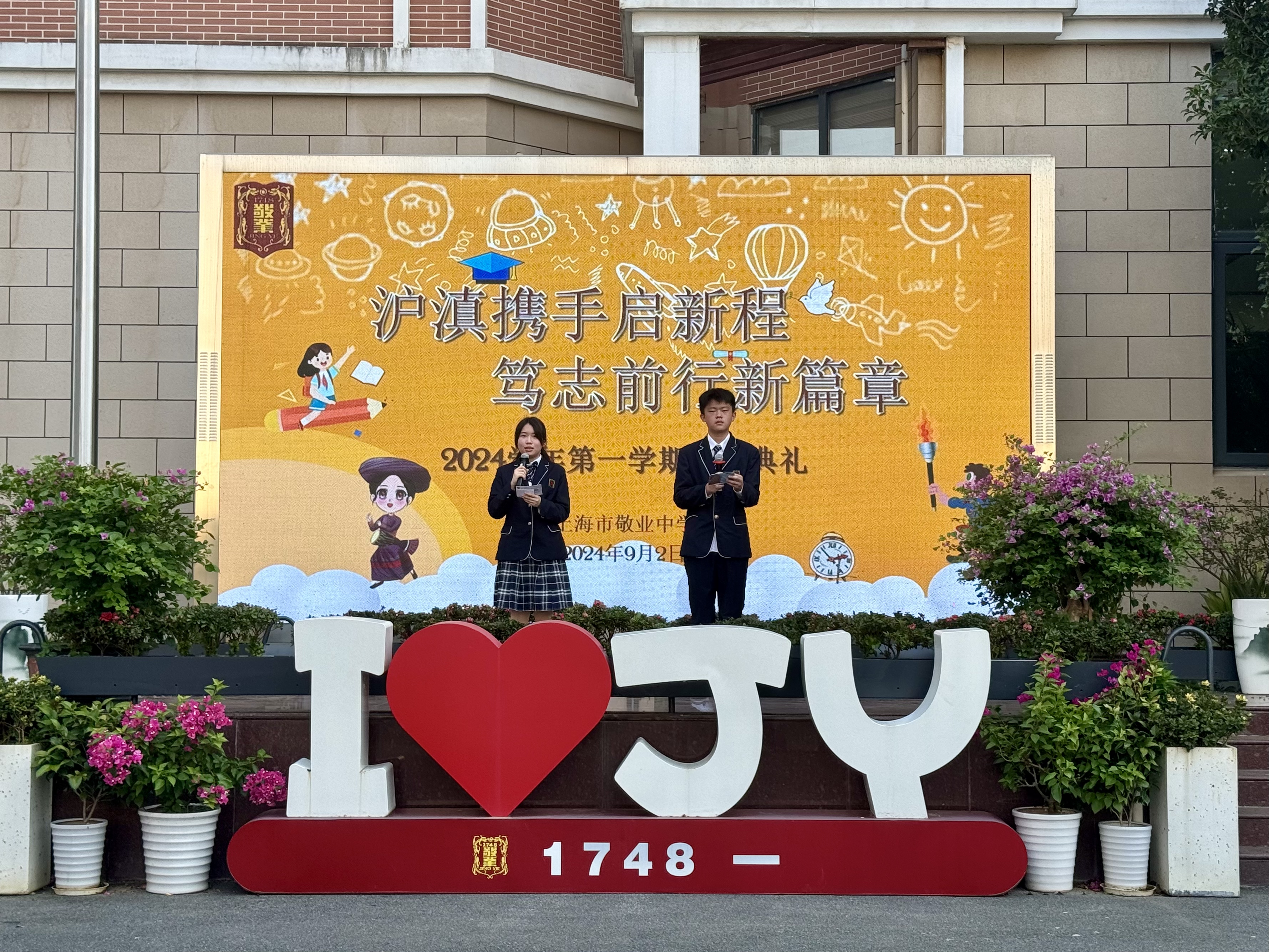 在经历了两个月的暑假之后,新的一学期如约而至,同学们再次相约在敬业,满怀着对新学期的期盼。我校于9月2日上午顺利举行2024学年第一学期“沪滇携手启新程 笃志前行新篇章”开学典礼,本次开学典礼由高二(1)班沈之玥和高二(8)班刘天瑞主持。