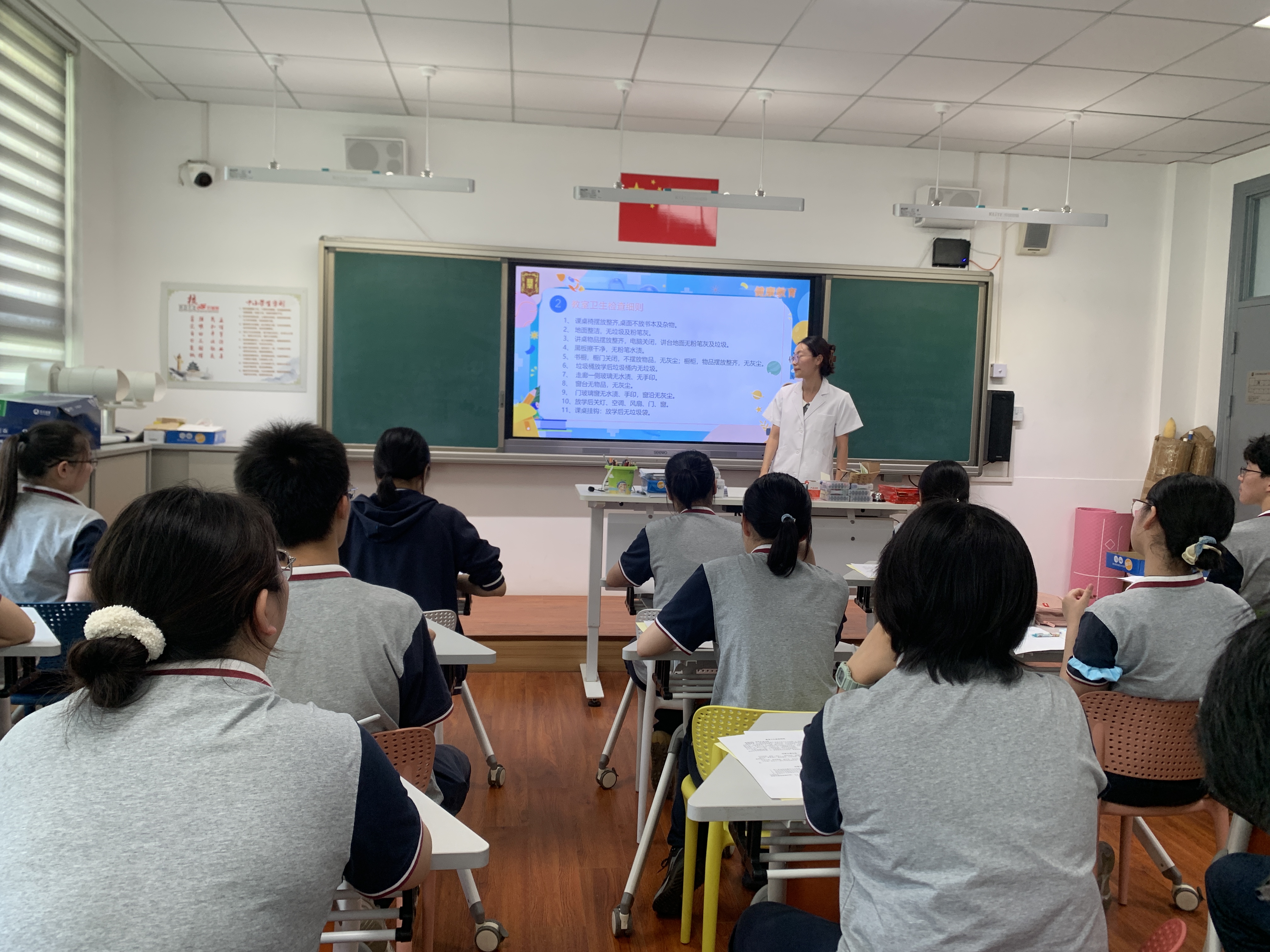 会议开始,孟丽老师首先向高一新卫生员介绍了保健室的情况,让高一卫生员对自己的工作有了初步了解。接着,孟老师为卫生员讲解了卫生员的相关职责,包括每日递交缺勤报告单、配合班主任完成晨午检、维持班级卫生等,还介绍了新学期的星级教室评选规则,要求各班在放学后30分钟内完成班级卫生打扫,也强调了病假请假要求和病愈复课要求。最后,王小雪老师向卫生员强调了在校园发生应急情况时,例如课堂上出现同学呕吐或者晕倒,卫生员该如何正确反应保护好自己和同学们的安全。