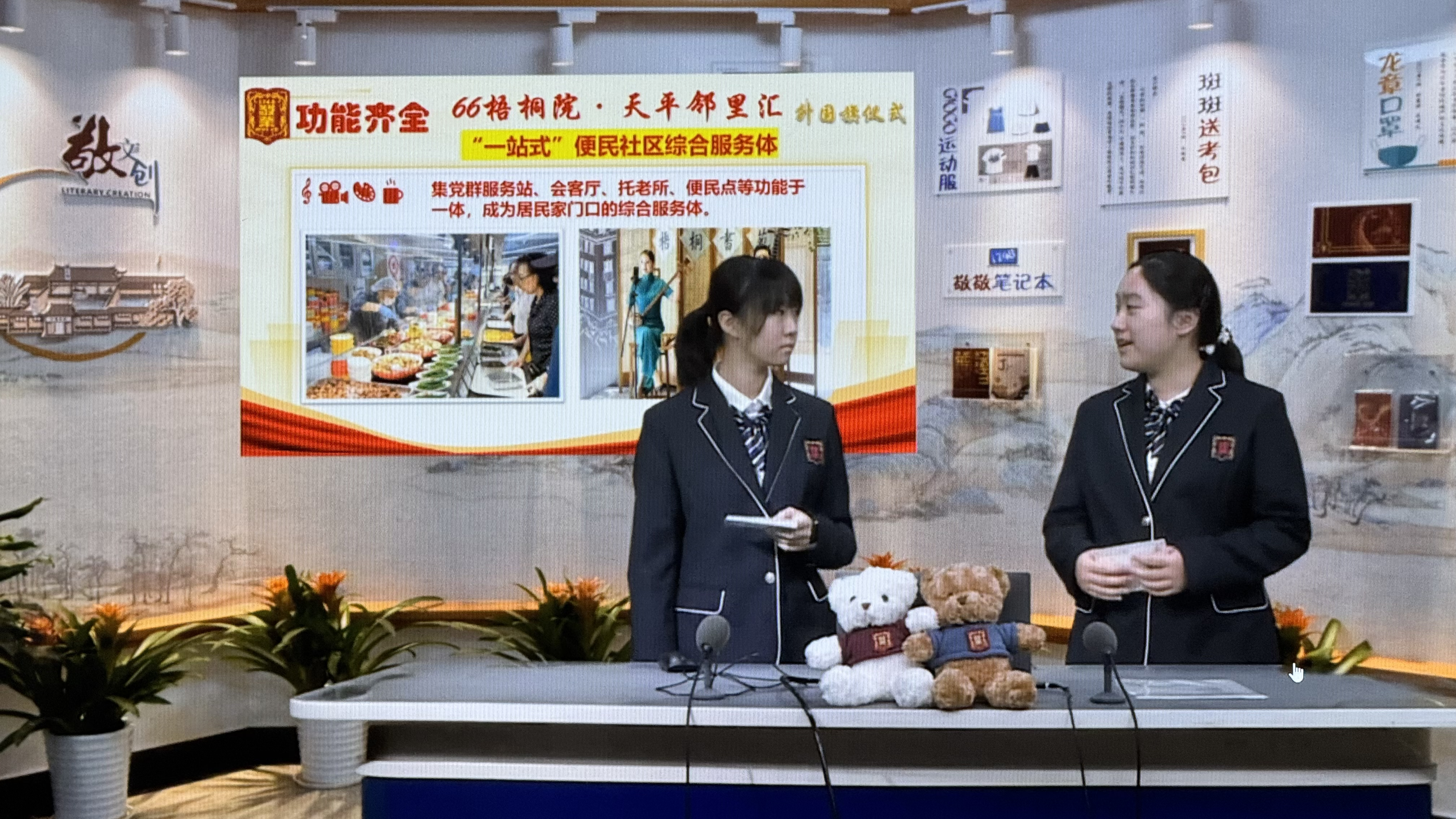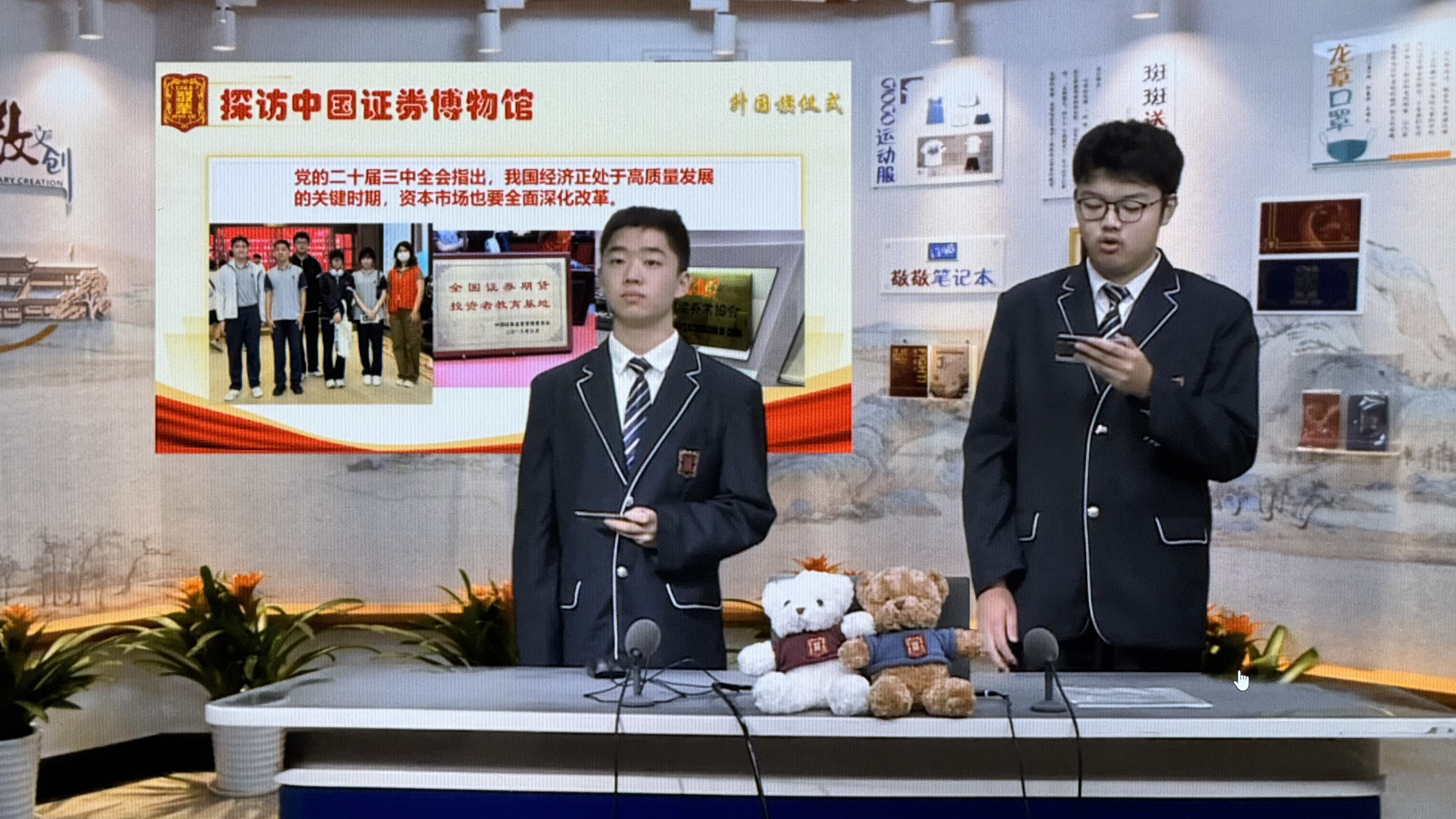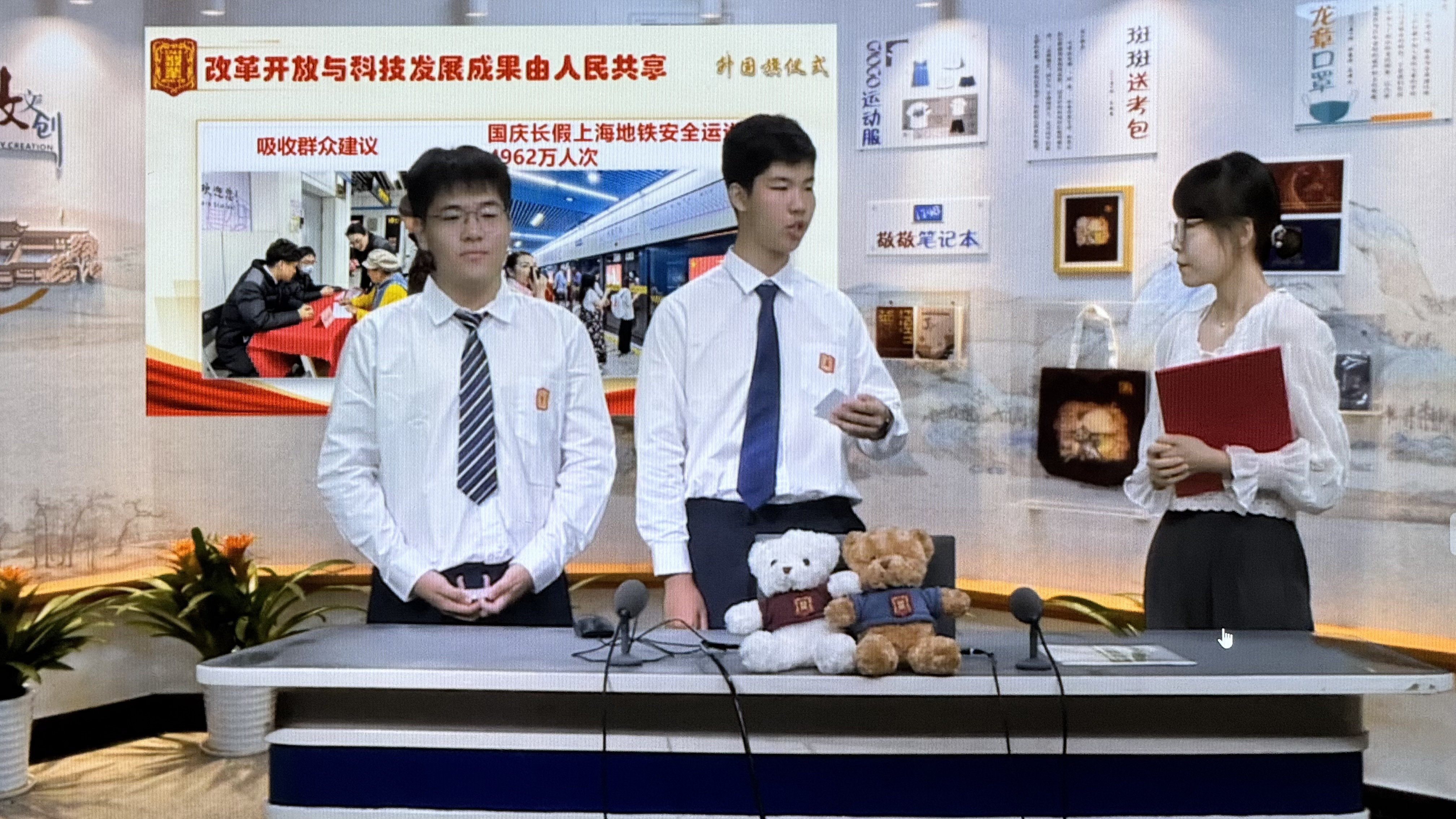 高二6班胡霁力和方启恒两位同学通过讨论股市的波动性,解释了股票投资的基本概念,包括购买股票即成为公司股东及可能获得的利润分红。同时,探讨了证券市场对经济发展的重要作用,包括为企业提供资金、反映经济状况和指导政策制定等。高一4班陈博阅和陈自远同学,通过对话形式讲述了上海地铁的发展历史,包括面临的技术挑战和取得的成就。讨论了地铁对城市交通和经济发展的贡献,并提出了对未来改进方向的思考,强调了持续改革和创新的重要性。高二6班刘亦菲、陶圣懿和张荔涵同学介绍了66梧桐院社区中心——集文化休闲、餐饮、老年人服务于一体的多功能场所。强调了党群服务中心在提供便民服务、促进社区参与和就业方面的作用,体现了党的二十届三中全会提出的以人民为中心的发展理念。