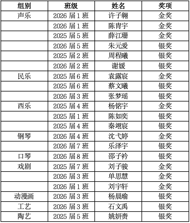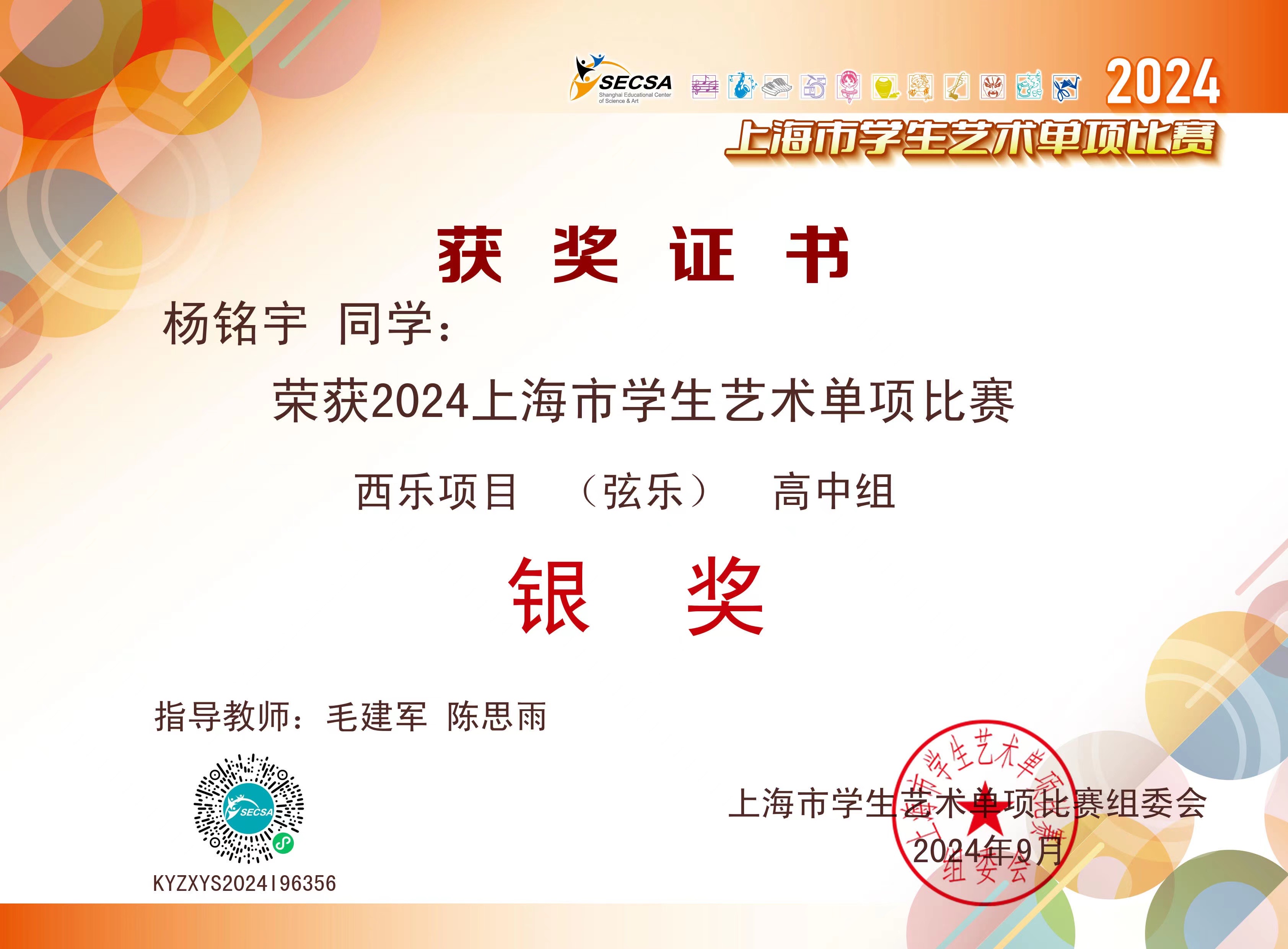 2024年黄浦区学生艺术节艺术单项比赛已圆满结束,我校在校艺术教师们的组织下斩获声乐组金奖3人,银奖3人;民乐组金奖1人,银奖2人;西乐组金奖1人,银奖2人;钢琴组金奖1人,银奖1人;口琴组银奖1人;戏剧组金奖3人;动漫画组银奖1人;工艺陶艺银奖2人。共计20人次获奖。其中西乐组金奖2025届4班杨铭宇同学代表黄浦区参加上海市学生艺术单项比赛获弦乐高中组银奖。