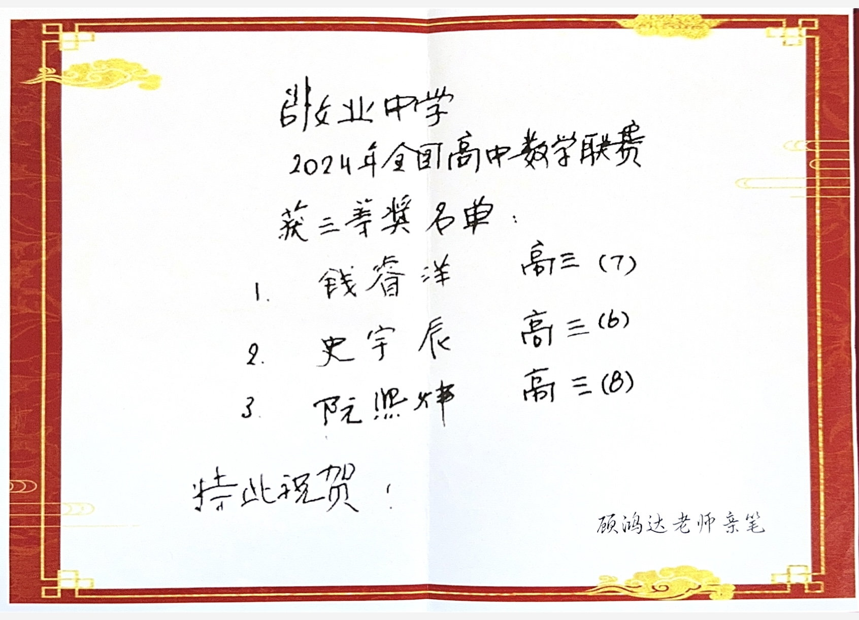在2024年全国高中数学联赛中,我校高三6班史宇辰,高三7班钱睿洋和高三8班阮熙炜三位同学荣获三等奖。数学特级教师、上海市中学生业余数学学校校长顾鸿达老师,亲笔手写贺信,祝贺敬业中学三位同学所取得的成果!