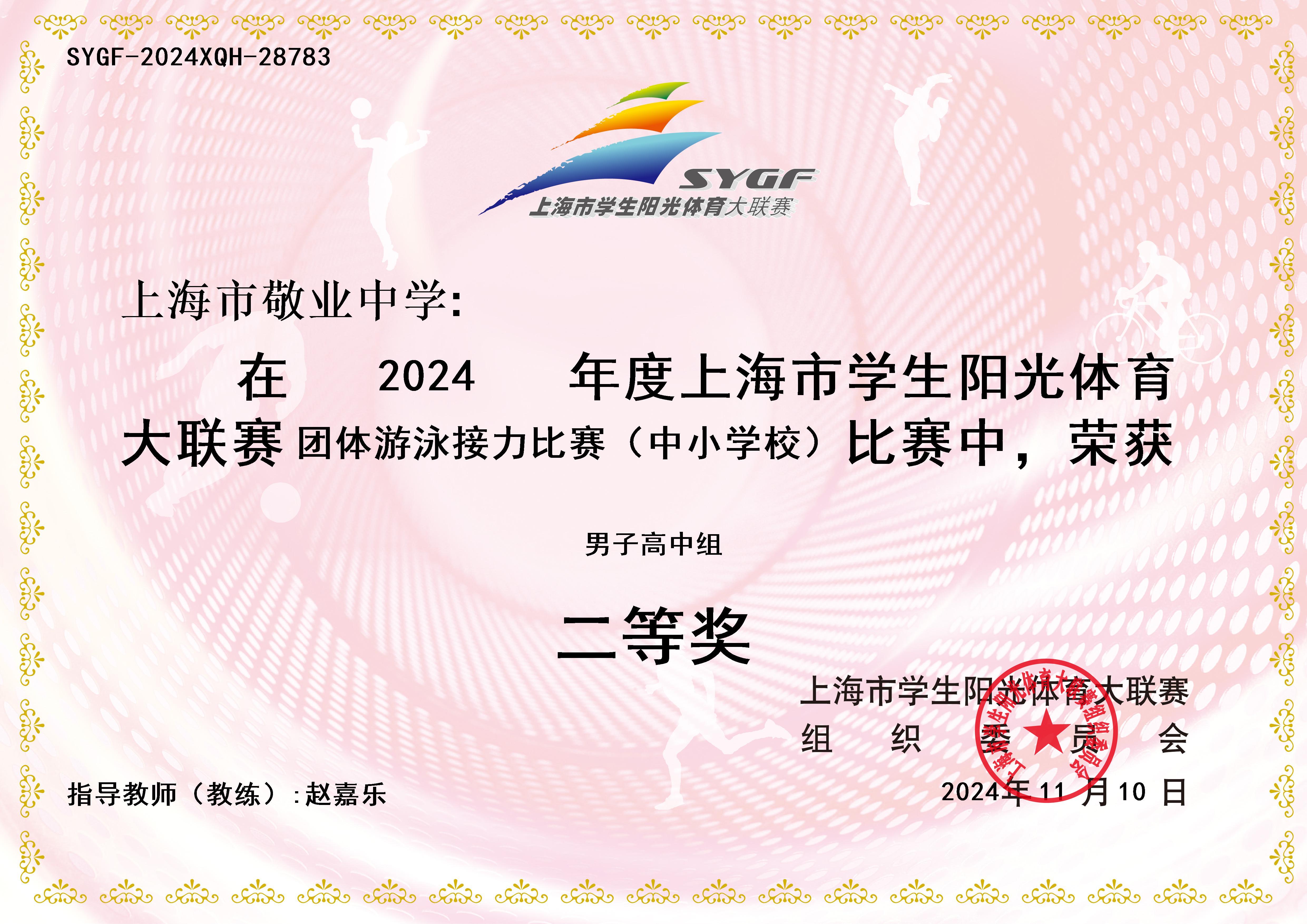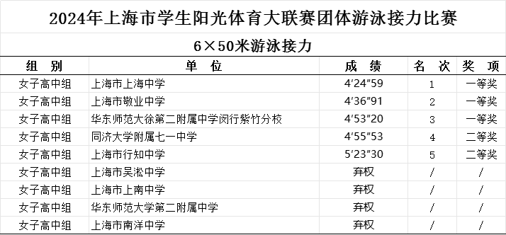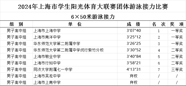 11月10日,上海市阳光体育大联赛团体游泳接力比赛(中小学生)在敬业游泳馆进行,本次竞赛共设4个年龄组别、7个团体赛项,共吸引了全市15个区27所小学、16所初中、9所高中、共88支学校代表队约741名学生参赛。体育组赵嘉乐老师带领我校12名学生参加男子高中组以及女子高中组6*50米接力项目。