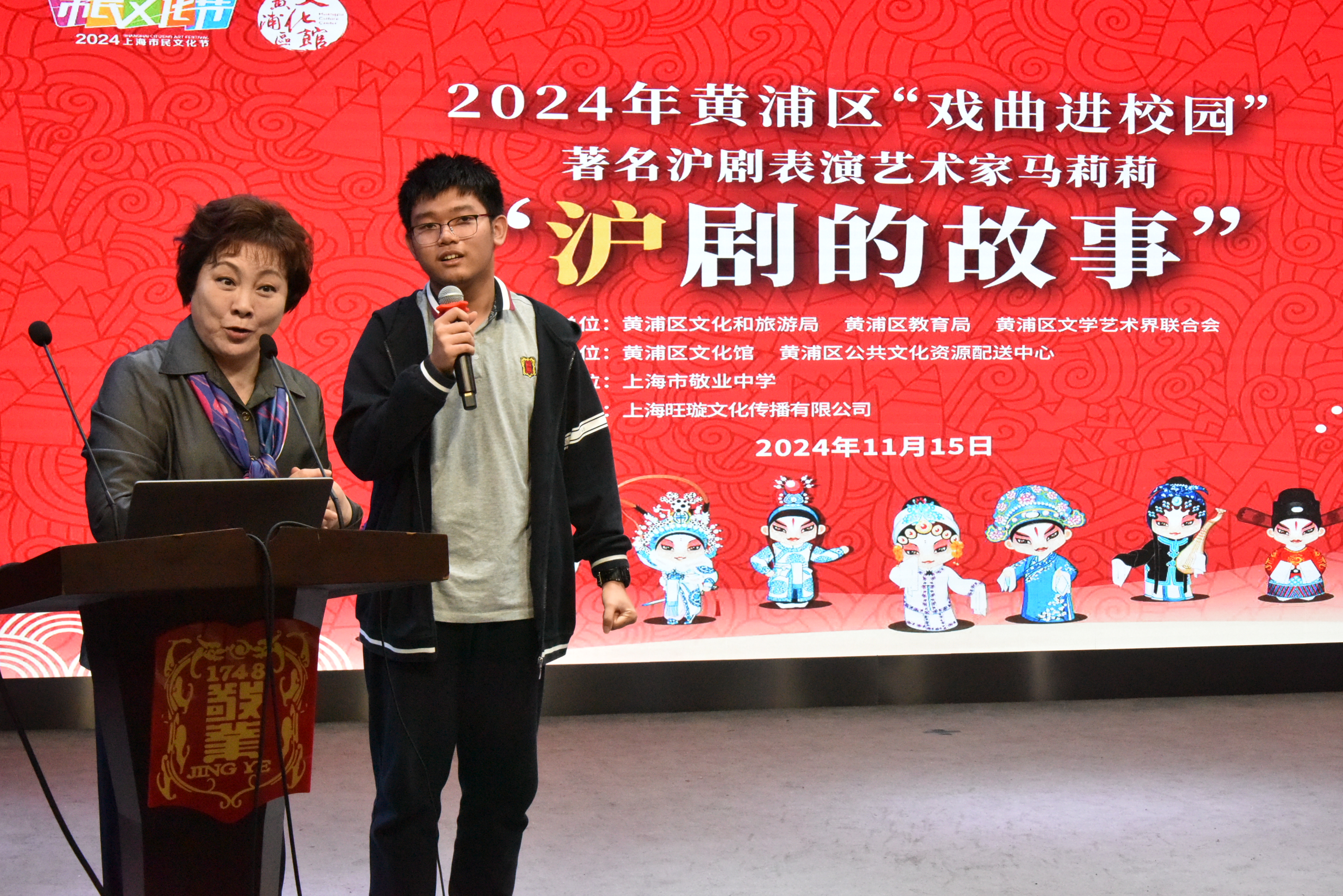 11月15日,著名沪剧表演艺术家马莉莉来到敬业中学,为师生们带来了一场别开生面的沪剧讲座,让校园内洋溢着浓郁的艺术氛围。讲座现场座无虚席,师生们都怀着期待的心情迎接马莉莉老师的到来。马莉莉老师以她亲切的沪语以及和蔼的姿态开场,瞬间拉近了与大家的距离。她首先向同学们介绍了沪剧的历史渊源,从沪剧的萌芽、发展,到成为上海文化的重要标志之一,生动的讲述让同学们仿佛置身于沪剧发展的漫长岁月。