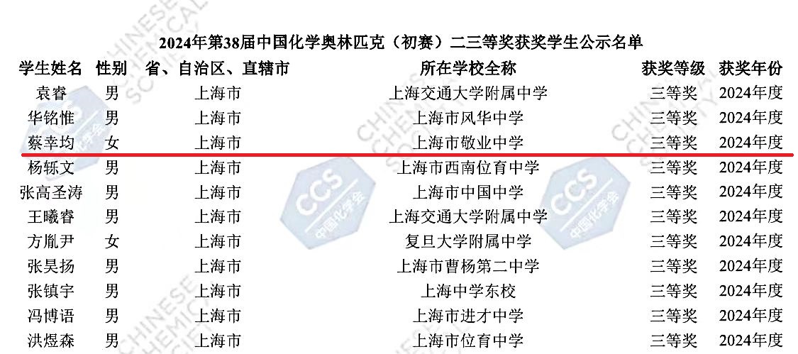 在2024年第38届中国化学奥林匹克竞赛(上海赛区)的评比中,我校高三(5)班蔡幸均同学凭借实力在比赛中脱颖而出,荣获三等奖,为校争光。在此向蔡幸均同学表示祝贺,向辛苦付出的指导教师刘雪峰表示感谢。希望有更多同学在未来能够再接再厉,获得佳绩。