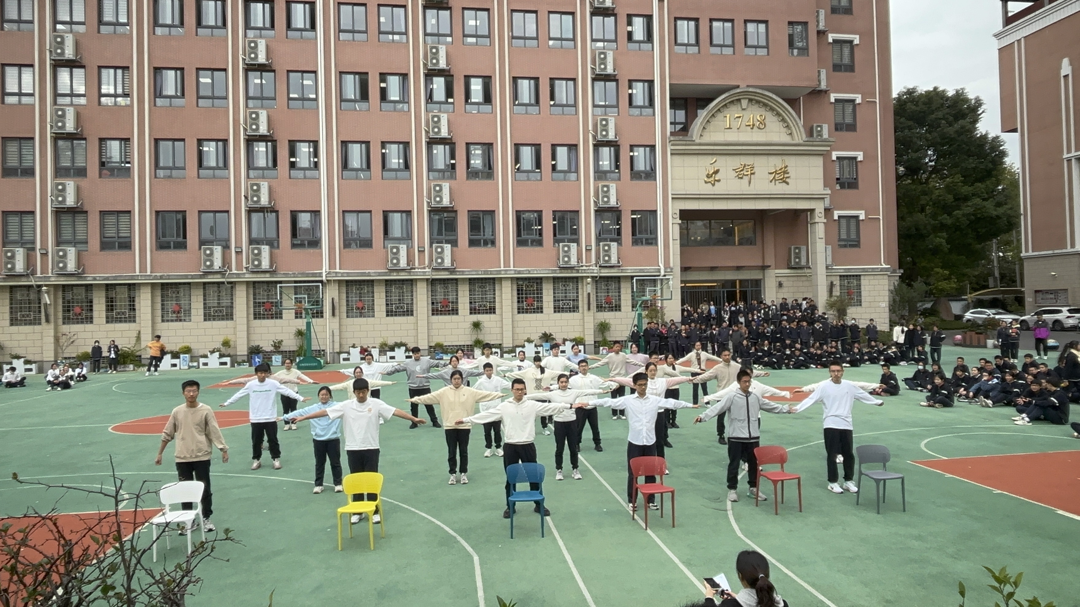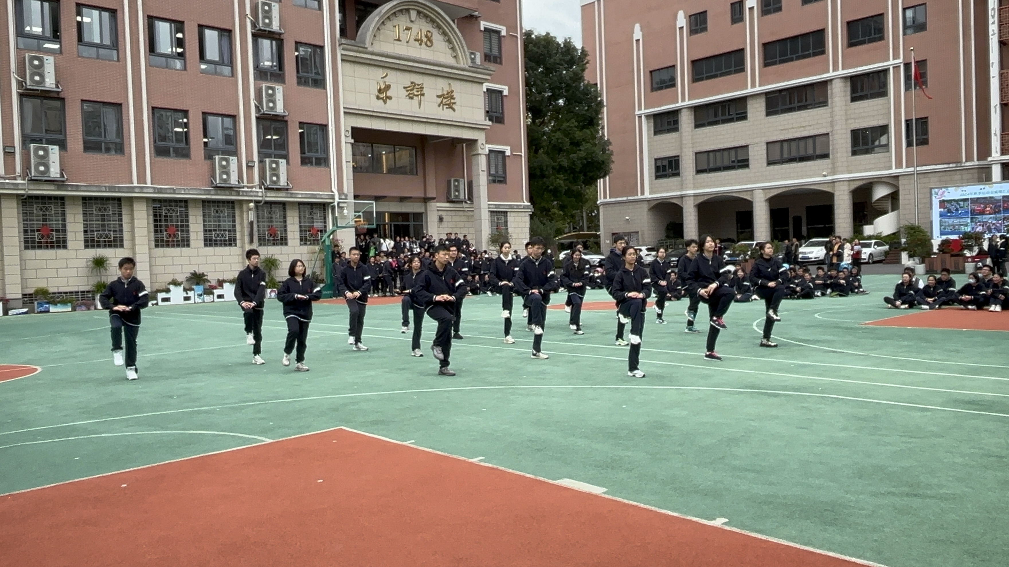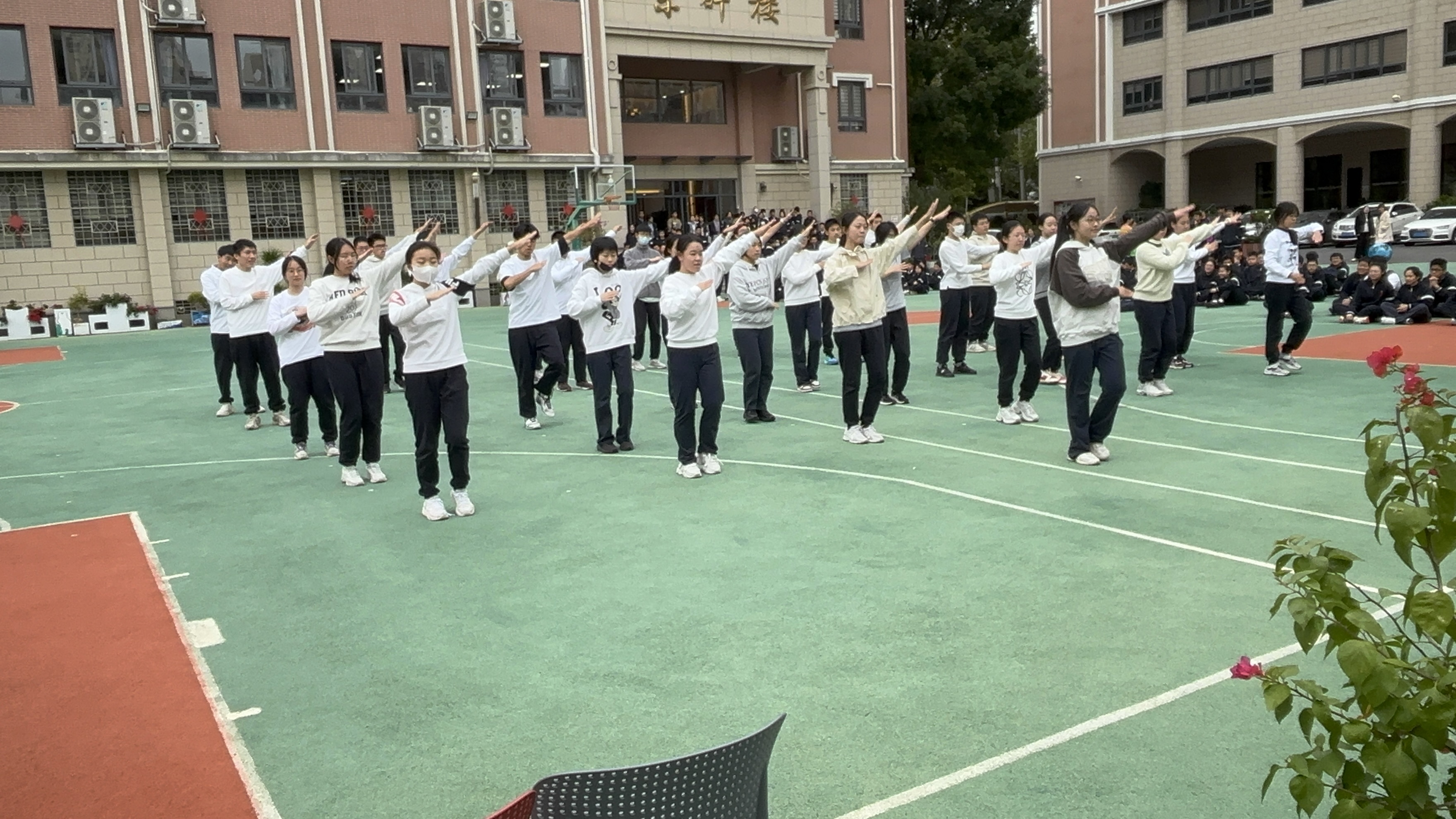 本次比赛分两个阶段进行,第一阶段由高一年级各班自主报名,上报成果视频,经初评确定前五名班级进决赛,第二阶段的决赛在操场进行,由九位评委进行现场评分。