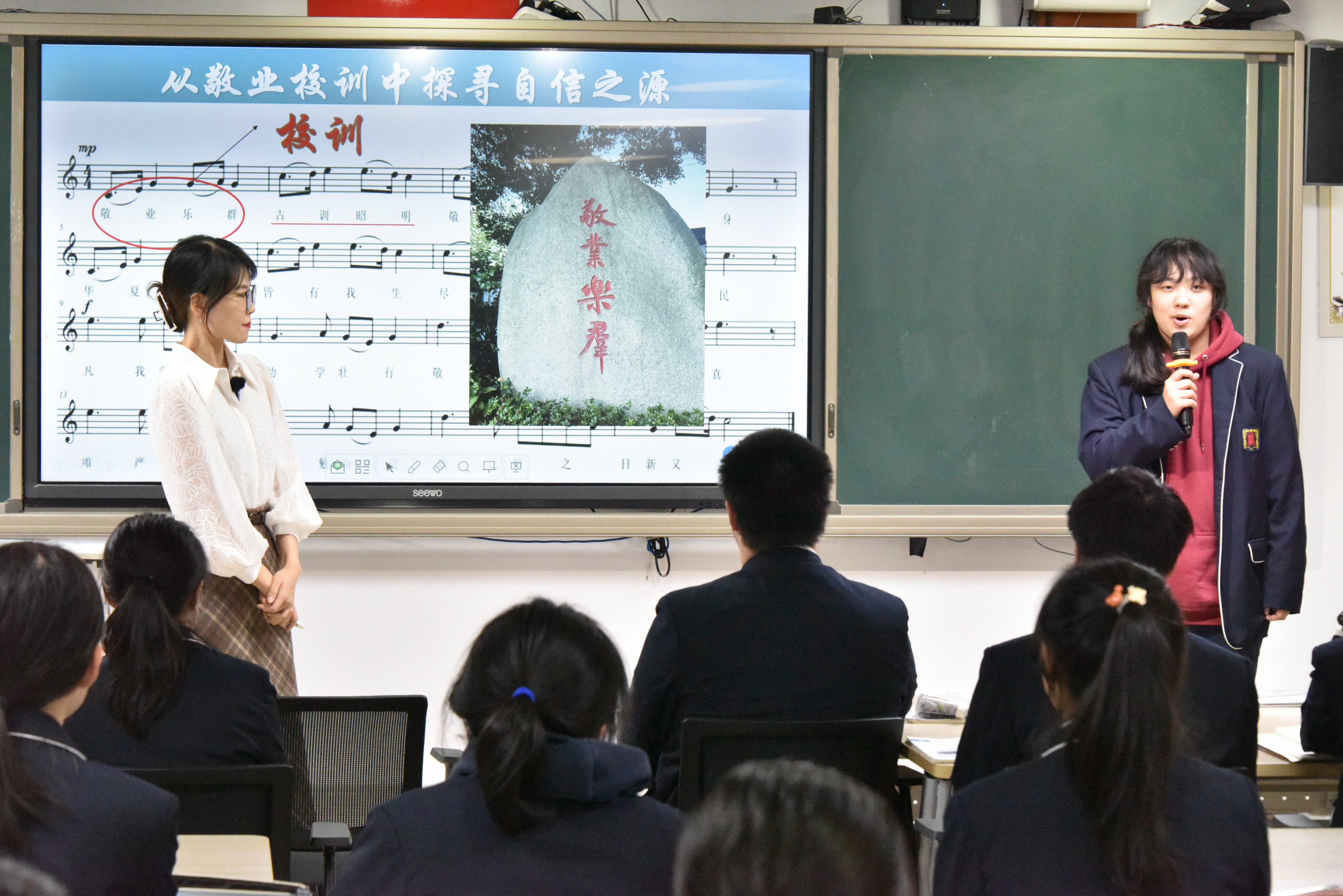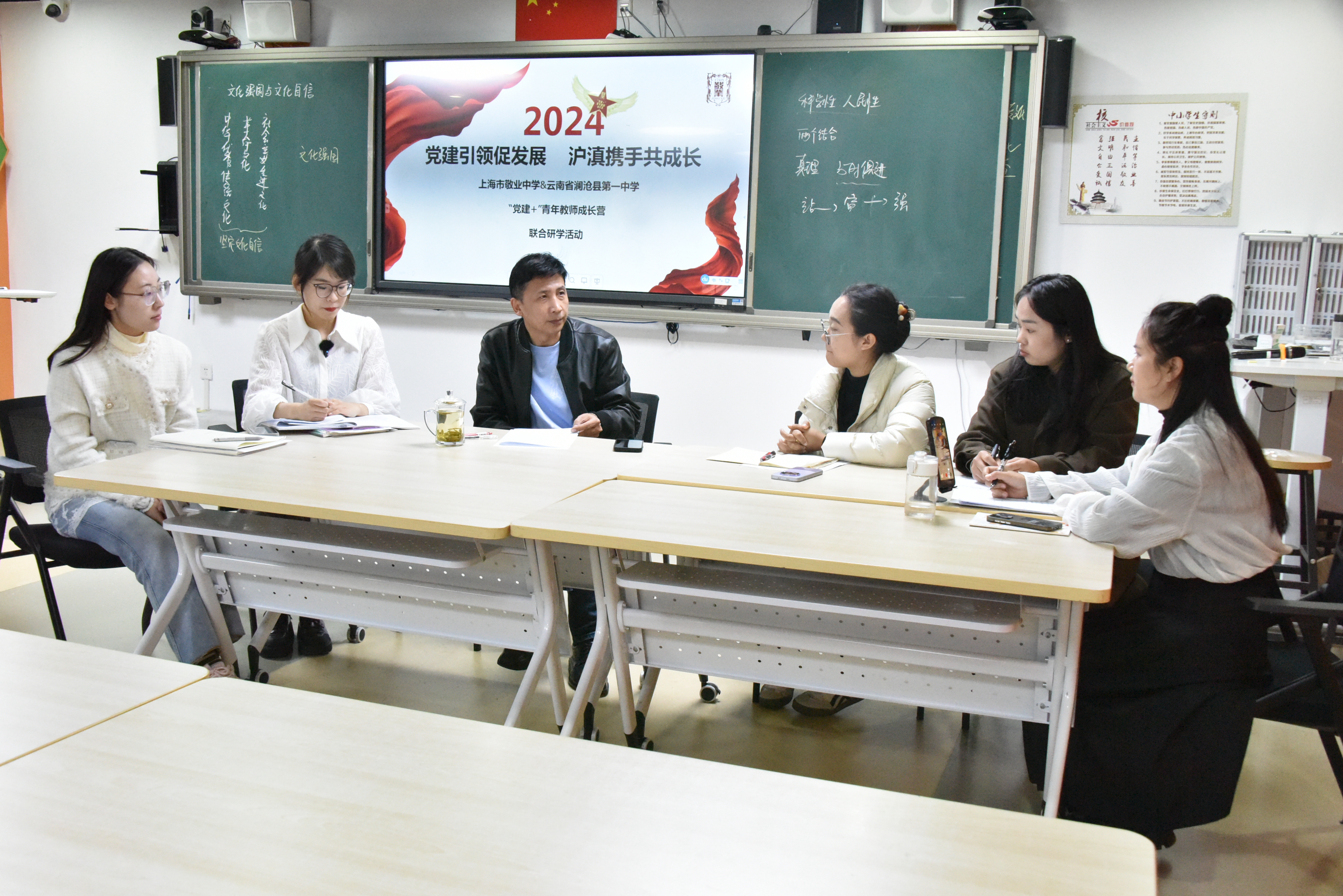 政治组韩玥老师开设了《文化强国与文化自信》的公开交流课,特邀区教研员吴立宏老师作为点评嘉宾,韩老师采用议题式教学方法,引导学生探寻自信之源、坚定文化自信;筑牢自信之基、擎画文化强国;感悟力量之源、助力文化强国,教学过程中结合敬业中学校史、优秀校友等资源和学生在“又新”印刷所的社会实践活动经历,以及学生小组合作拍摄“文化点亮人民群众美好生活”的活动成果,设置生活化教学情境,提高教学实效,整体教学环节层层递进,启发学生深度思考。随后,在研学交流环节,云南省澜沧一中“党建 ”第二批青年骨干教师纷纷表示,从韩老师的课中受到很多启发,如:可以挖掘云南当地的特色民族文化资源,开展更加丰富的学生活动方式推进课堂,同时注重校史资源和其他多种资源素材的综合运用等。最后,区教研员吴立宏老师对韩老师的公开课进行了精彩点评,他先是肯定了本节课的亮点之处,即习近平文化思想贯穿始终,树立起政治立场,并从学校丰富的文化内容引出,引导学生挖掘文化自信之源,在学生活动中达成理论与实践相统一的素养目标。在此基础上,吴老师还建议,需将学校文化内容融会贯通,注重学生在活动中的真实感受与体验,促进教与学互动推进,强调应凸显亮点,明确主线,鼓励教师在创新选材的基础上以更加灵活的方式处理素材、安排教学环节,以启发学生思维,培育学生学科核心素养。相信老师们通过走进课堂深度体验、课后反思交流等方式,探讨教育教学中的热点和难点问题,定能共同收获更大的成长与进步,