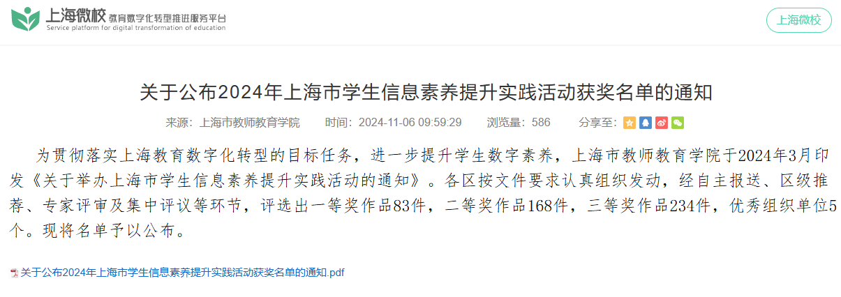 良好的信息素养是适应社会发展的需求,对于信息素养的评价是未来人才综合素质的一项重要指标。上海市学生信息素养提升实践活动是检测本市学术信息素养综合实践水平的大型赛事,期待我校教育数字化转型的不断深化,涌现出更多文理兼备、德智体美劳全面发展的敬业新人!