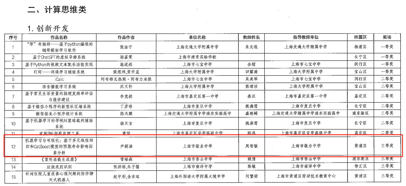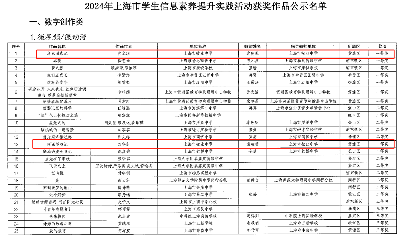 随着我校教育数字化转型进程的不断深化,敬业学子数字综合素养日益提升,并在多个维度均有不断的丰富。2024年上海市学生信息素养提升实践活动自上半年开赛以来,我校多名同学参赛,并在数字创作、计算思维、科创实践等参赛板块均显示出较高的水准。近日,于上海微校教育数字化转型服务平台公布了2024年上海市学生信息素养提升实践活动获奖名单。在本次赛事中,我校2026届1班刘宇轩、沈之玥,2025届8班尹嗣涵分获一二三等奖。