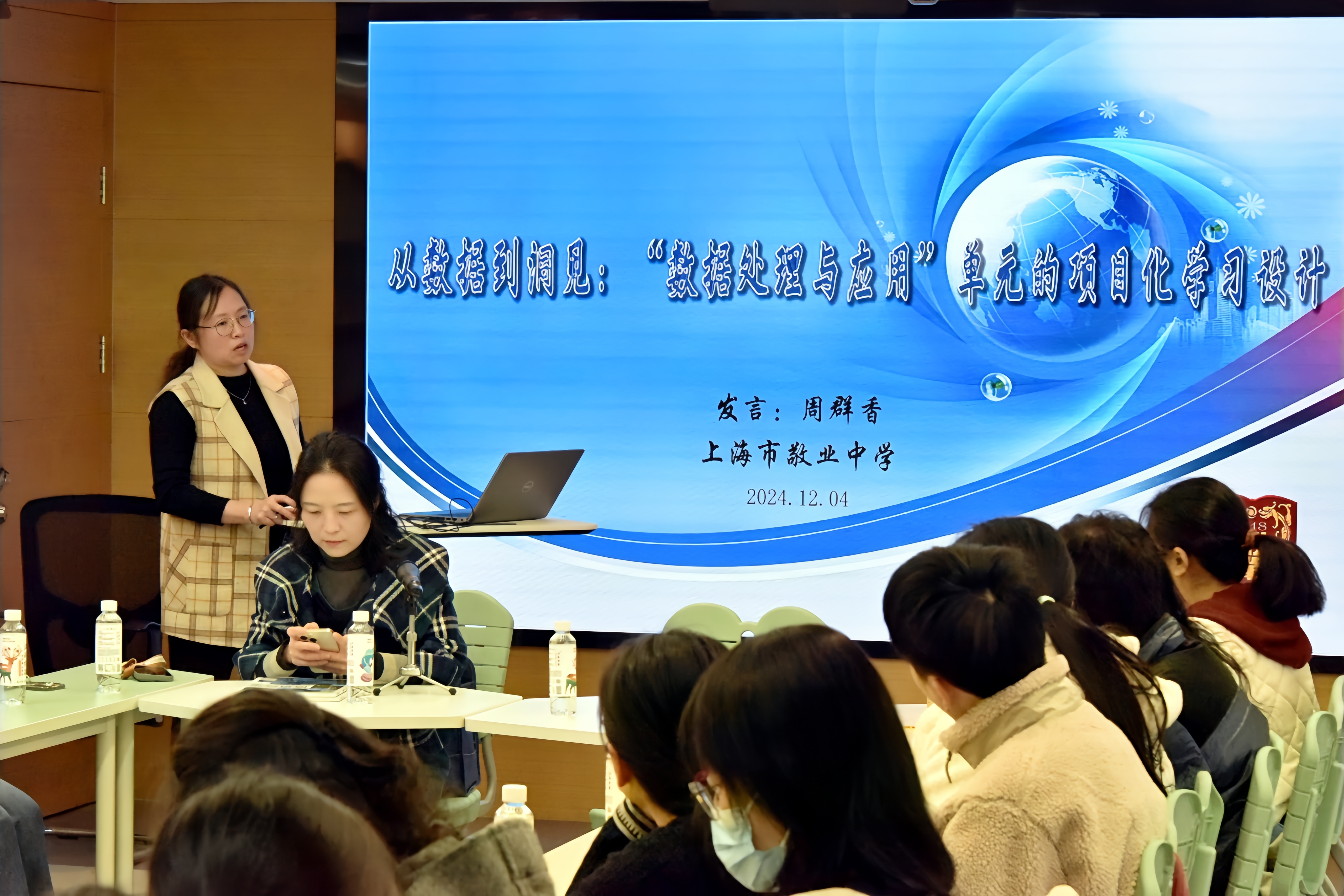 会上敬业中学信息教研组长周群香老师,开展了《从数据到洞见:“数据处理与应用”单元的项目化学习设计》主题交流,分别从背景与基础、思考与认识、实践与探索和成效与反思四个部分,分享了其单元项目化学习设计的历程,给在座老师们提供了真实可参照的项目化学习项目设计路径和经验。