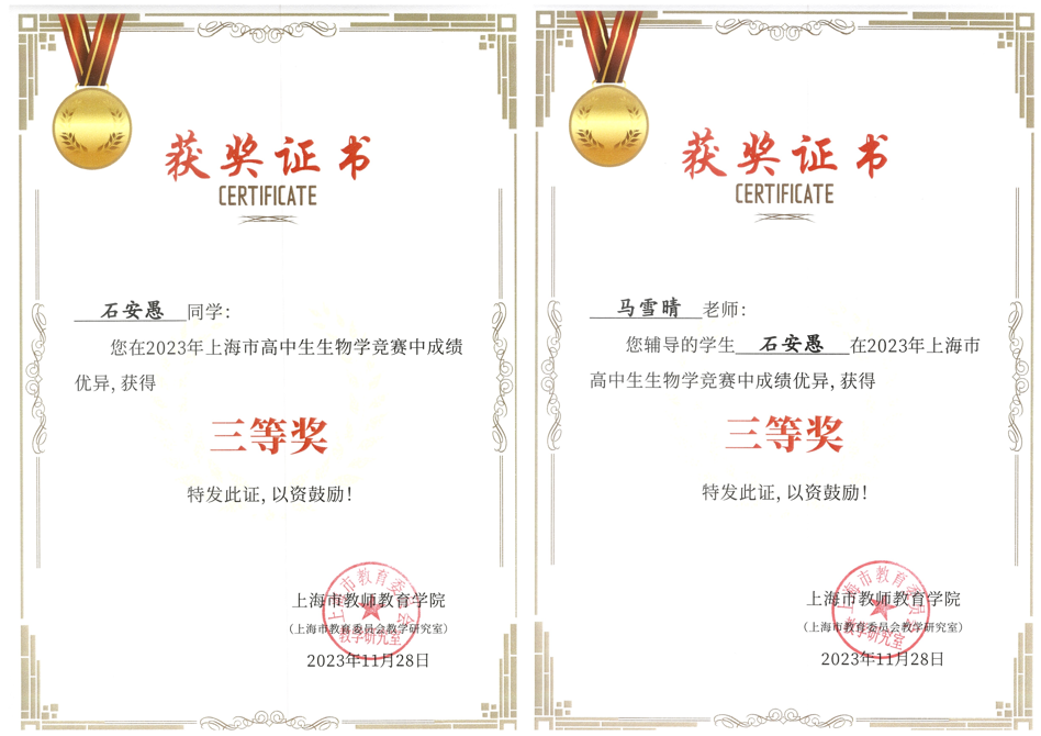 在上海市教育委员会教学研究室主办的2023年上海市高中生物学竞赛中,我校高三(8)班石安愚同学荣获三等奖,在此向石安愚同学及指导老师马雪晴老师表示祝贺!