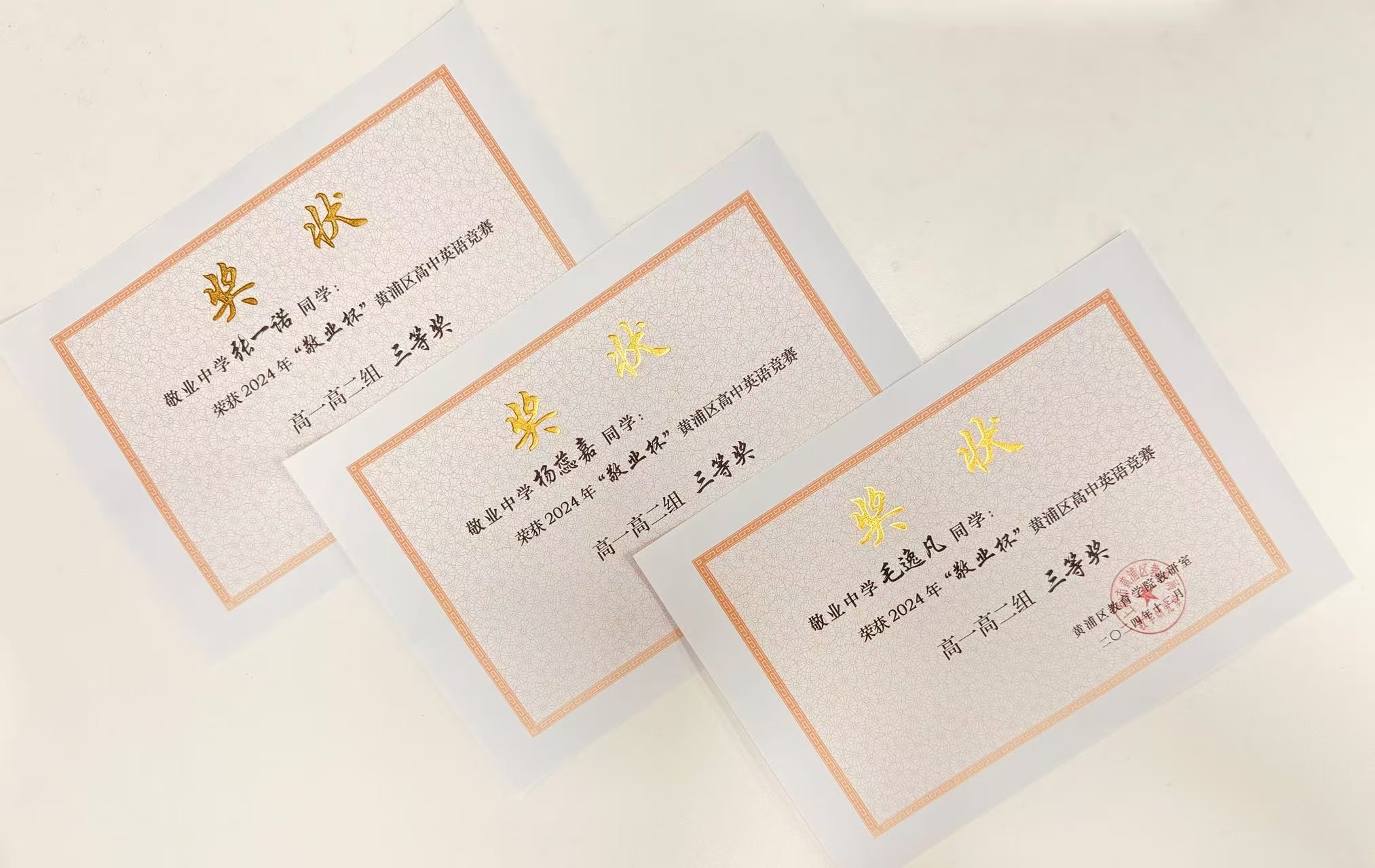我校在2024年“敬业杯”黄浦区高中英语竞赛中传来捷报, 高一(6)班张一诺、高一(8)班毛逸凡和高二(8)班杨蕊嘉获得高一高二组的三等奖。