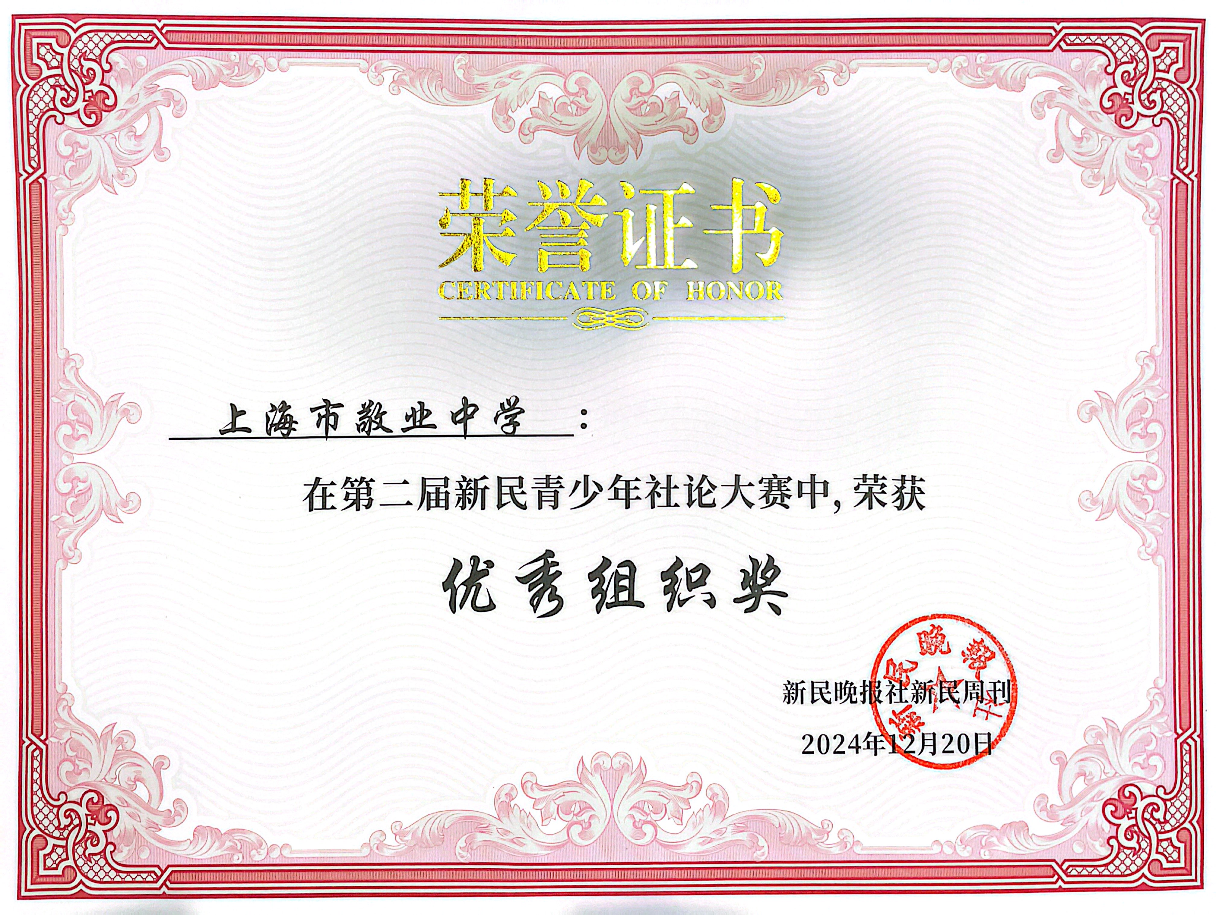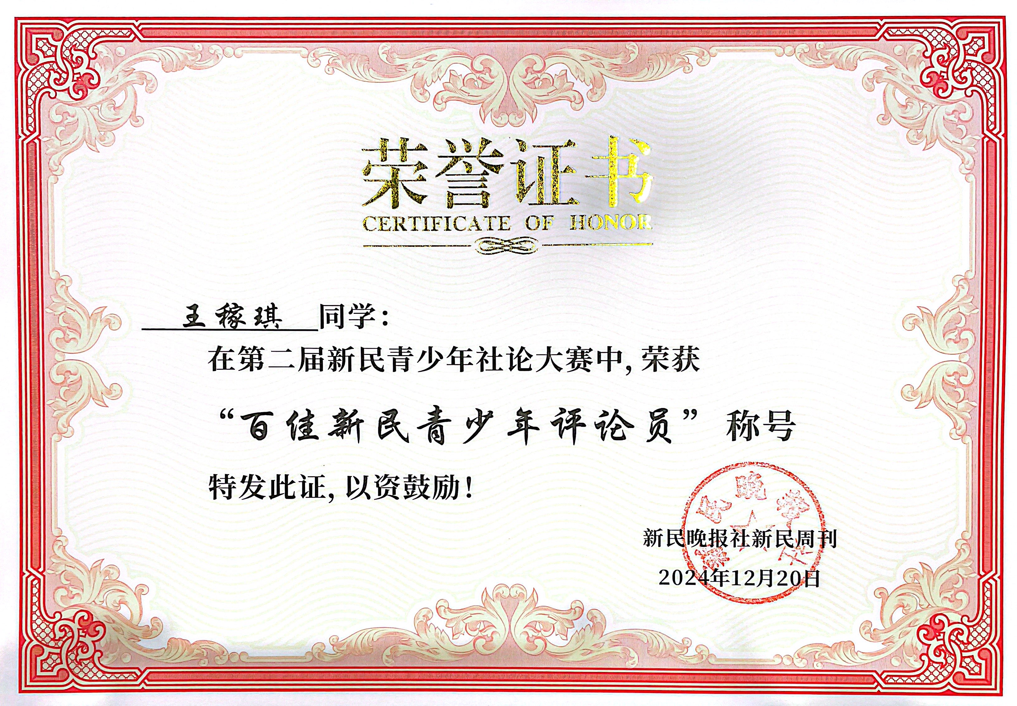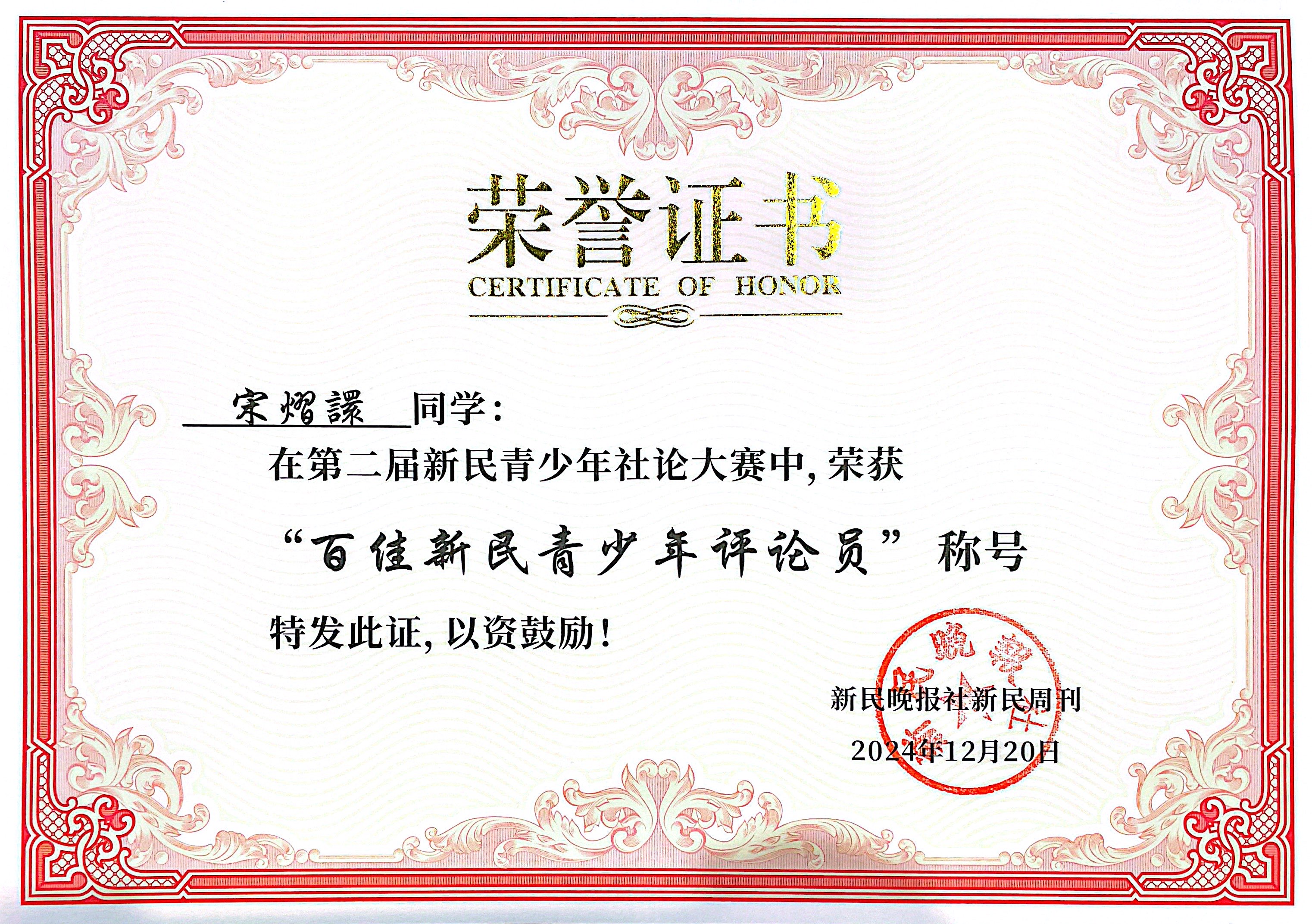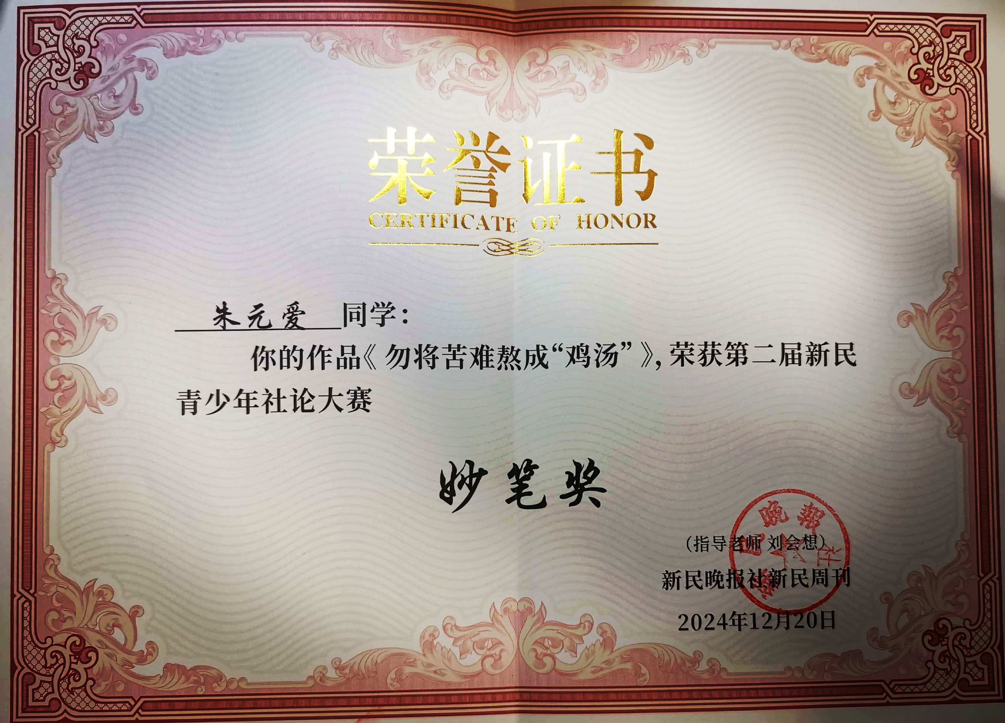 在此次活动中,敬业学子面对此次主题展现了非凡的见地,撰文的过程与修改也得益于学校语文组教师的大力支持与指导。高二5班朱元爱同学的《勿将苦难熬成“鸡汤”》作品荣获妙笔奖,高一6班宋熠譞与高二3班王稼琪荣获“百佳新民青少年评论员”。她们用行动说话,用那少年意气、指点江山的笔锋,见证民族之复兴、时代之巨变,并让自身的思考与观点影响更多的受众,为敬业中学再添佳绩!