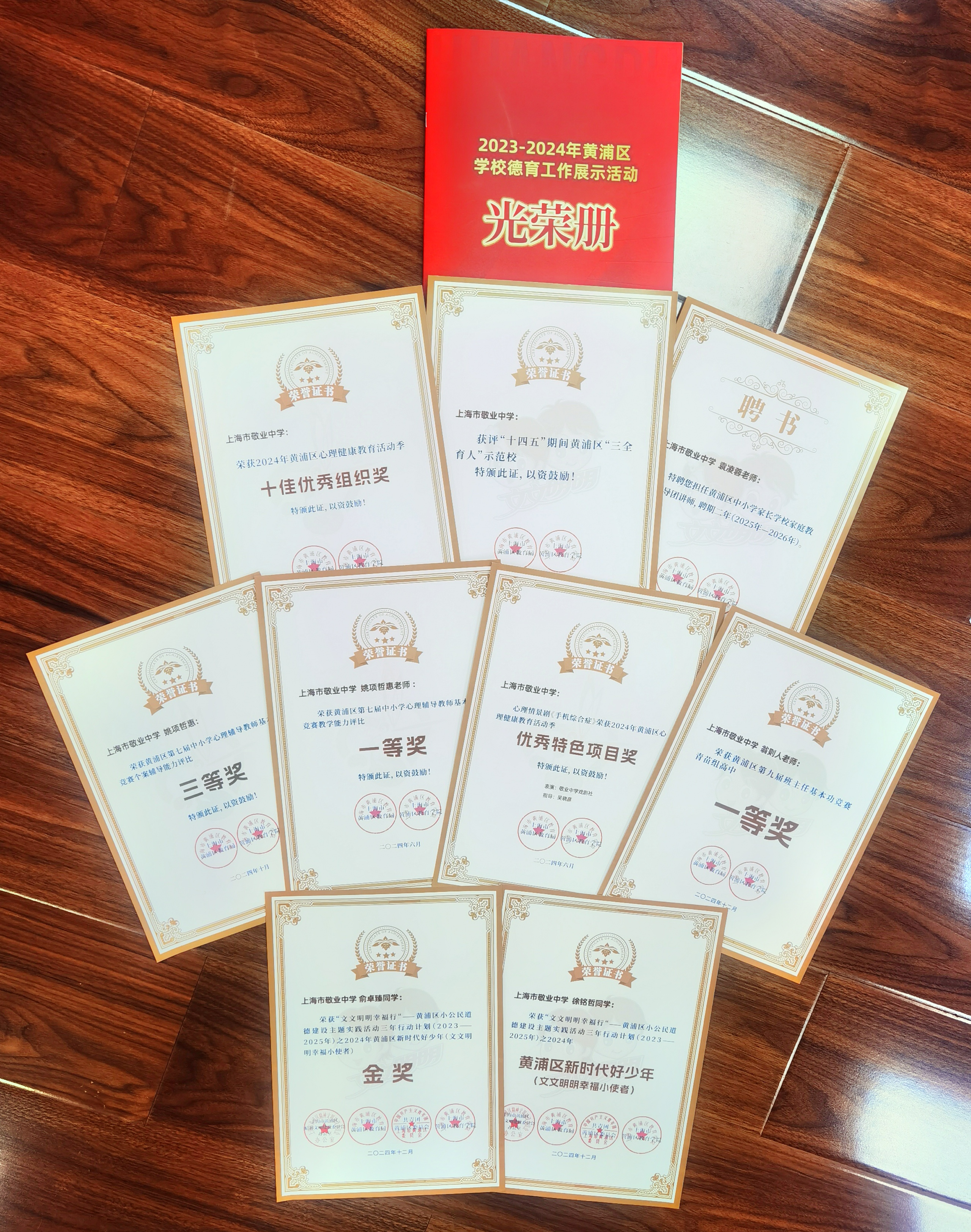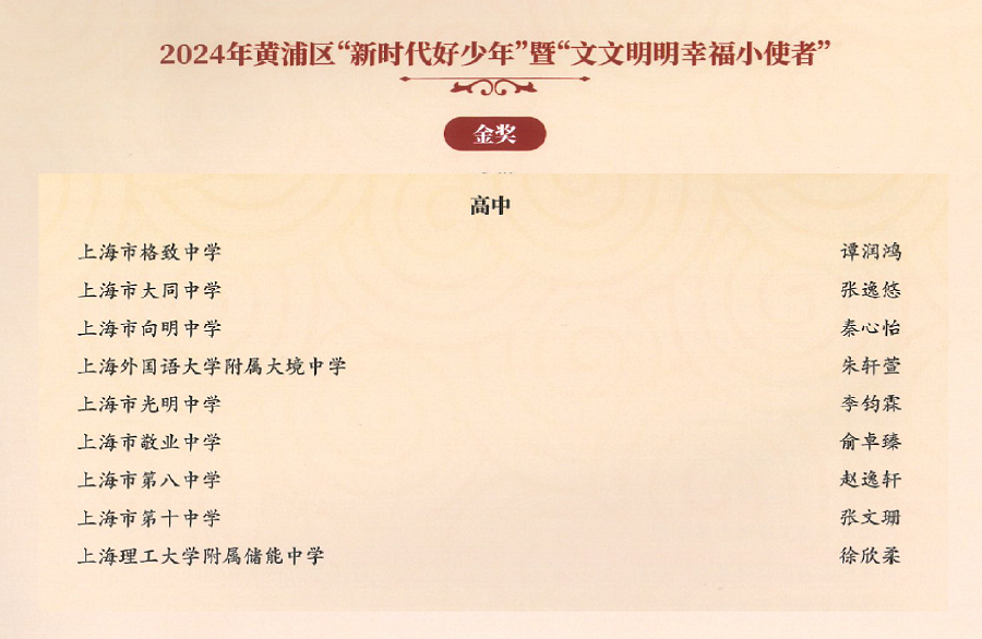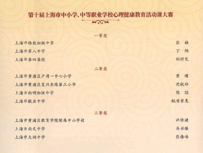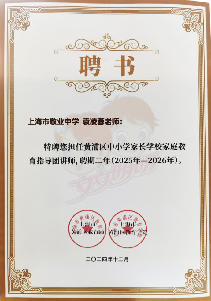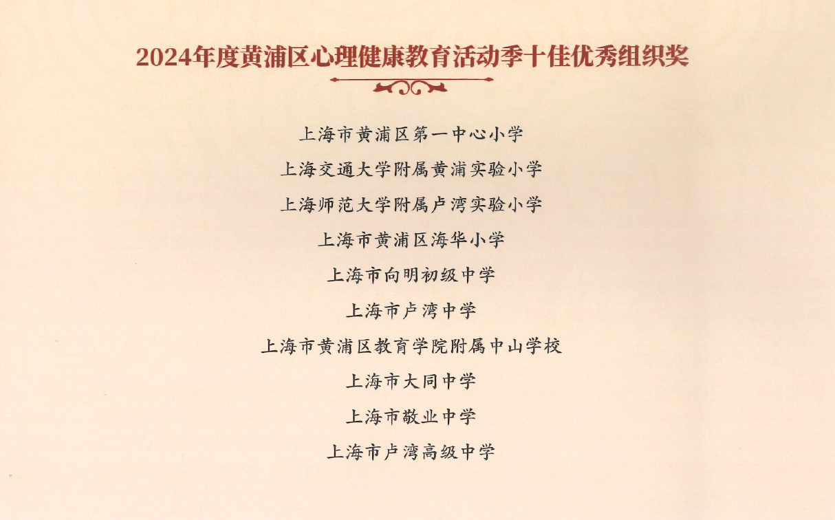 》获黄浦区心理健康教育活动季优秀特色项目奖;吴晓彦老师荣获黄浦区优秀导师荣誉称号;袁凌蓉老师受聘成为黄浦区家庭教育指导讲师团成员;2025届8班俞卓臻同学荣获黄浦区新时代好少年金奖;2026届7班徐铭哲荣获黄浦区新时代好少年“文文明明幸福小使者”称号。